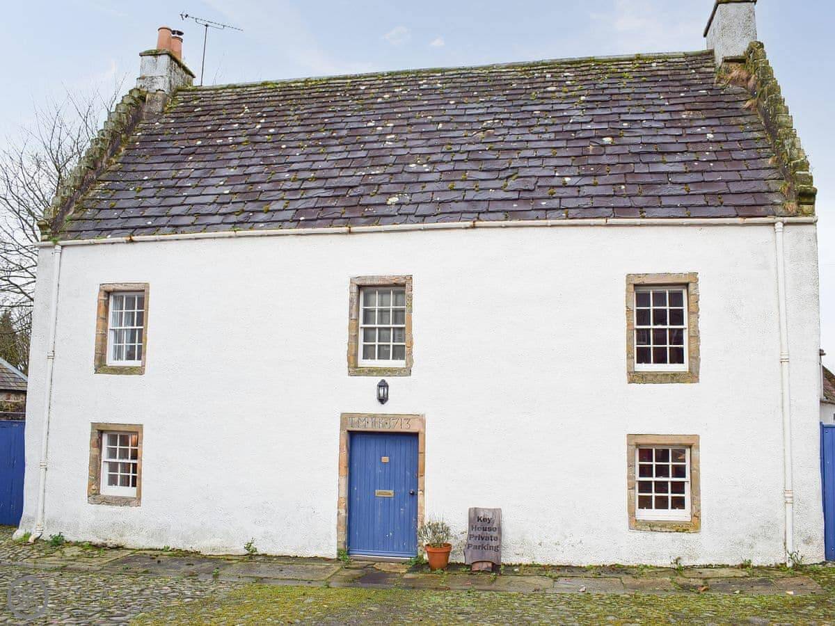 Key House is ours. It's in the middle of Falkland, right next to the Palace. The building is from 1713 and it's listed, so we had to be careful with the work. The beams in the living room and kitchen are supposed to be from the old Forest of Falkland. There's a marriage lintel over the front door with the initials TM and KK. We think the stone might have come from the Palace itself.