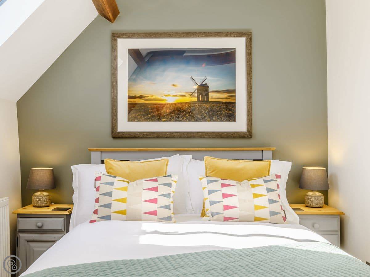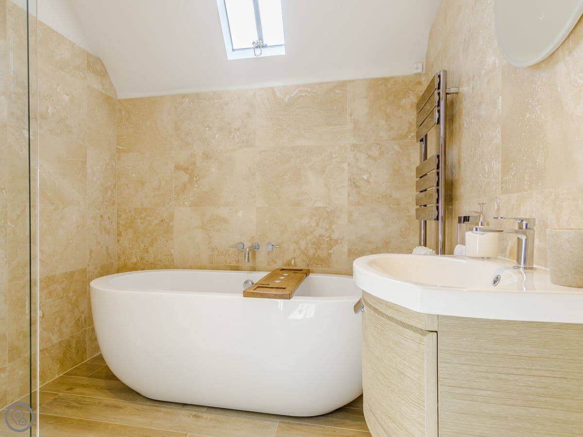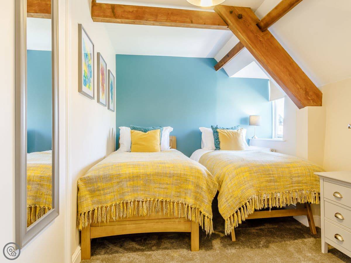 It sleeps six. Three bedrooms, two bathrooms. It's a 5 Star place, so it's high spec and comfortable. The ceilings have beams and the walls are Cotswold stone.