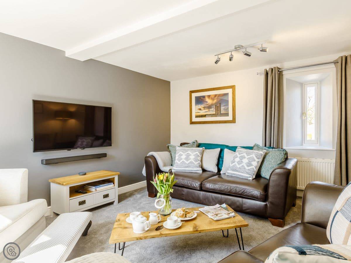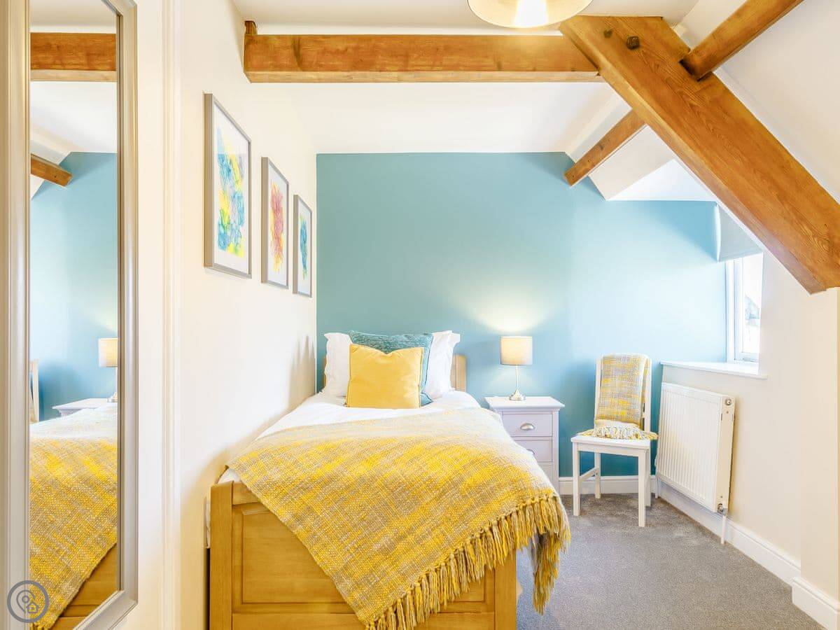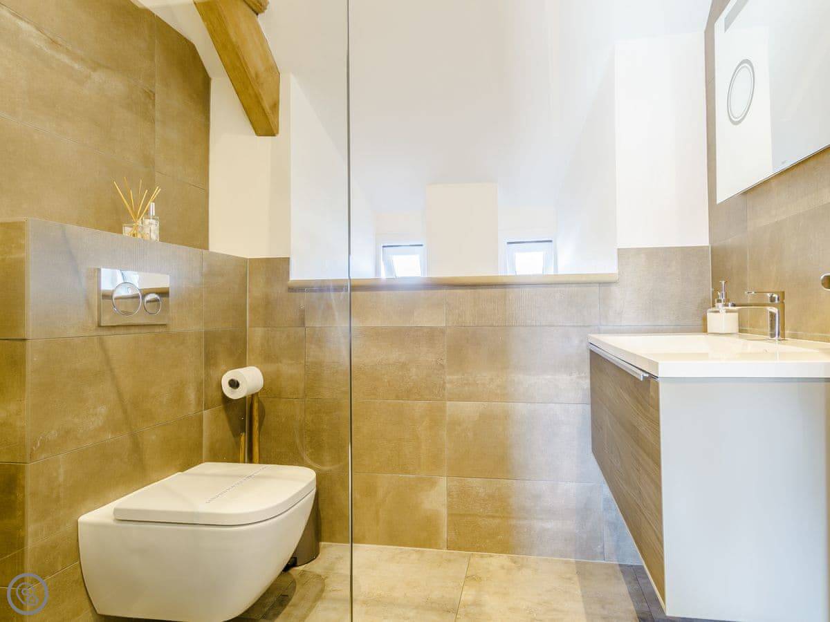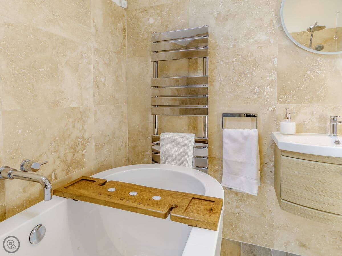 It sleeps six. Three bedrooms, two bathrooms. It's a 5 Star place, so it's high spec and comfortable. The ceilings have beams and the walls are Cotswold stone.