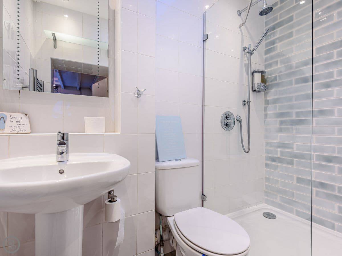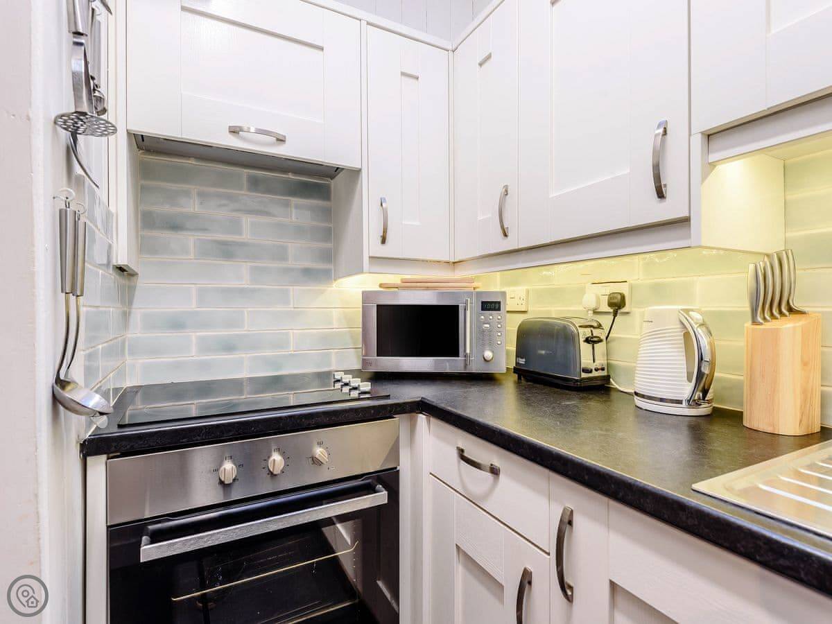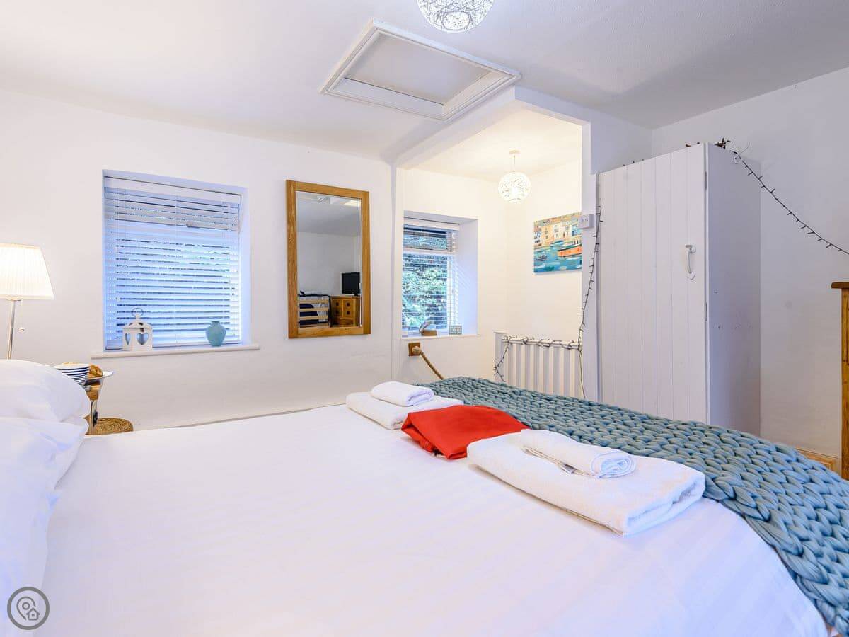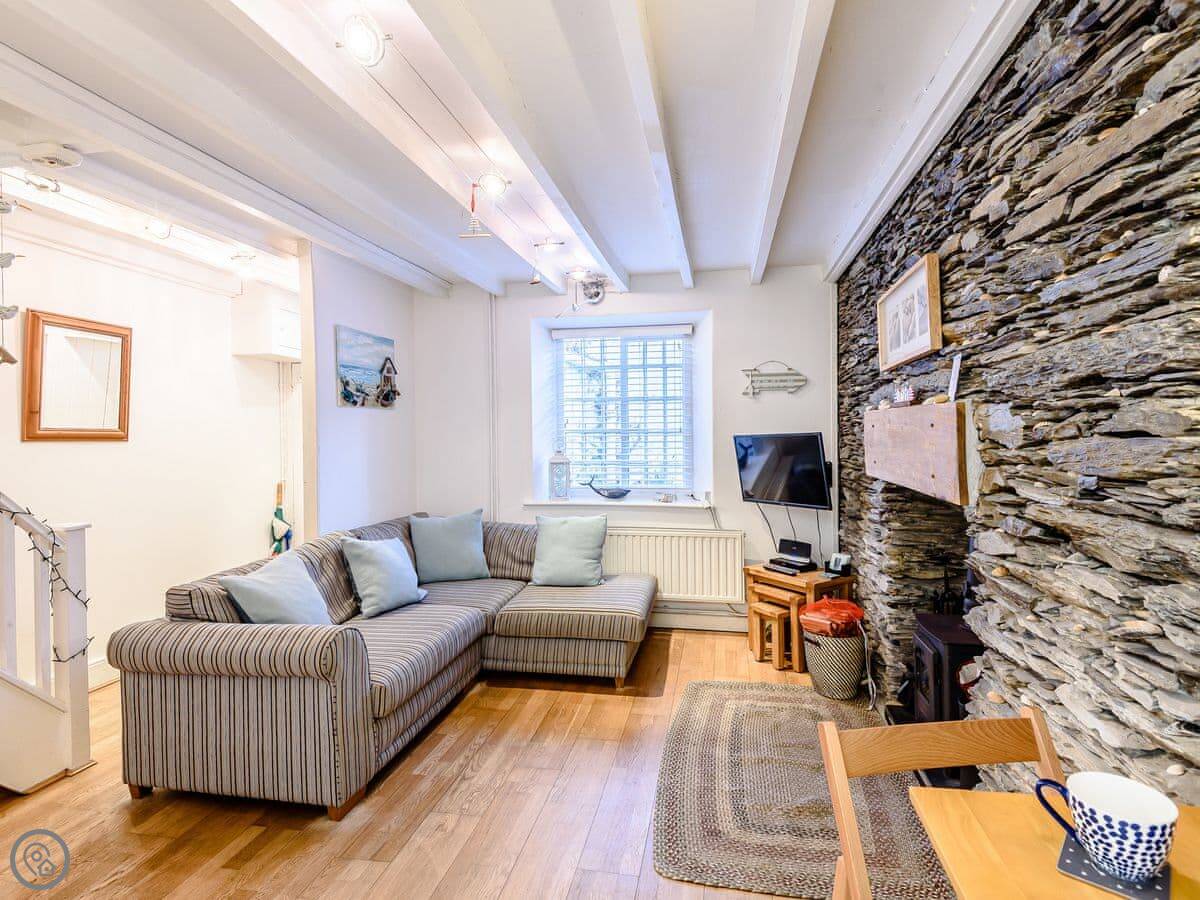 The rating is 4 Star. It's been done up inside, so it's comfortable and clean. It's open plan downstairs, with the kitchen and living area together. There's a woodburning stove for cooler evenings. Upstairs is the bedroom and a shower room. The stairs are quite steep and narrow, which is normal for a place this old.