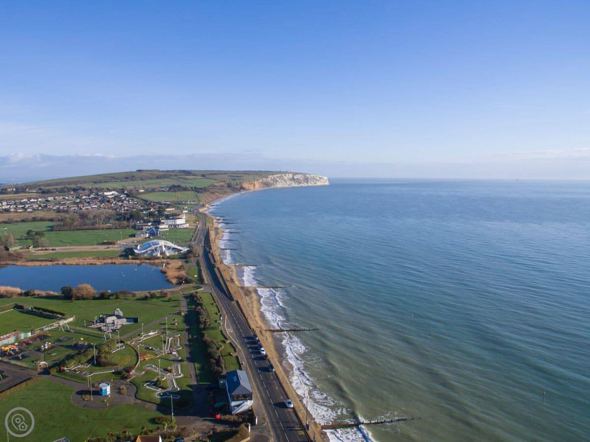 A five or ten minute walk down the path gets you into Sandown town centre, past the zoo. Sandown has the pier, amusements, all that seaside stuff. You can walk along the sea wall all the way to Shanklin if you fancy it. There's a shop about a mile away, a pub and a restaurant within about half a mile.