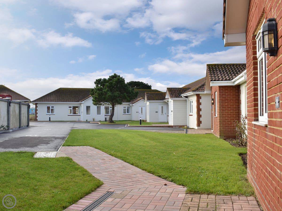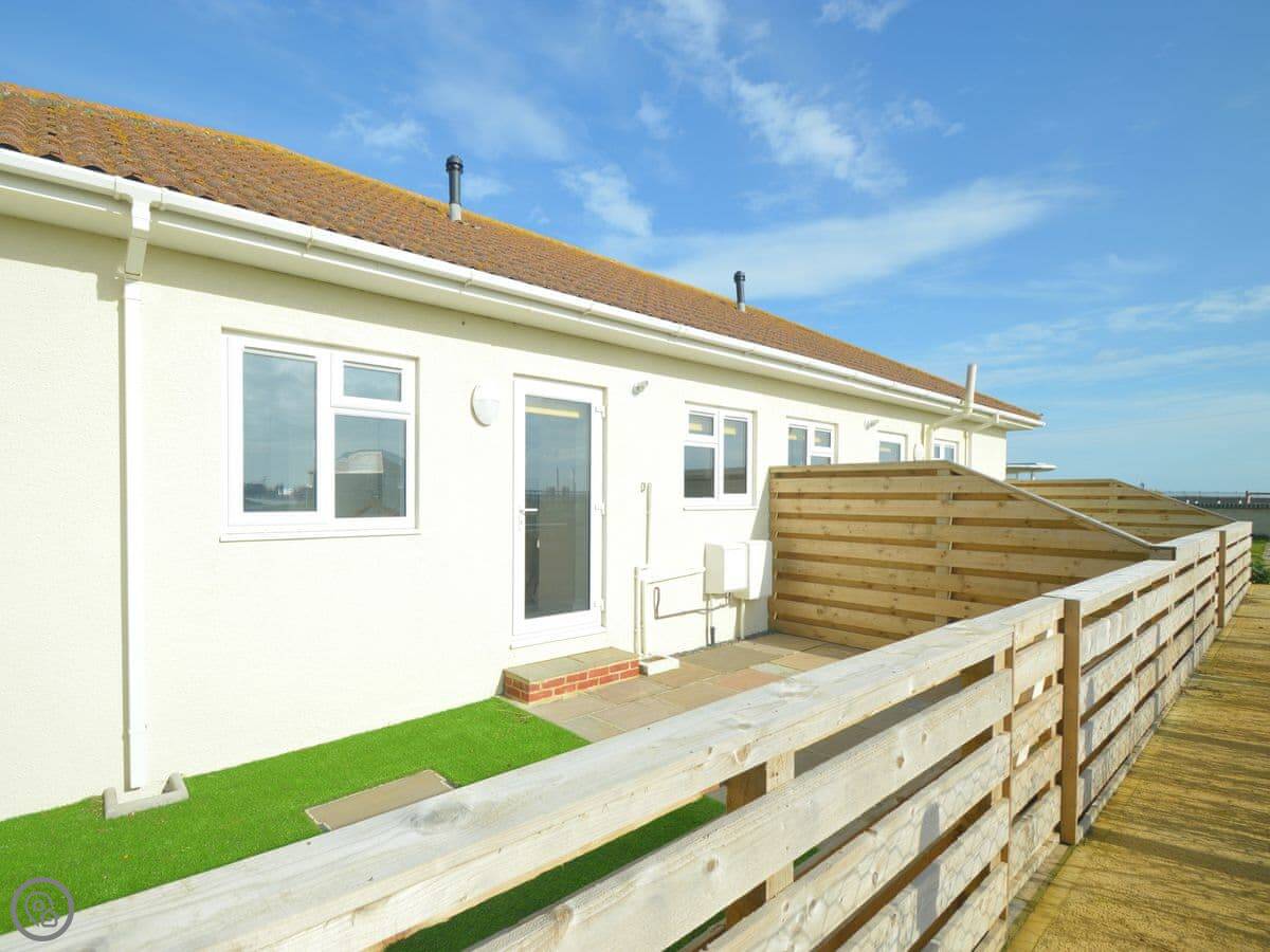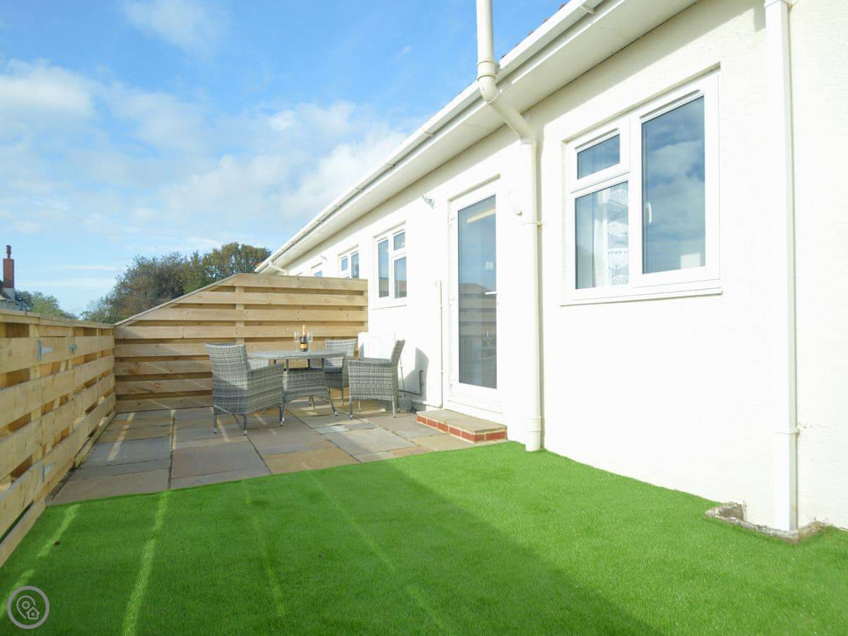 This is Bungalow 8 at Fort Spinney in Yaverland. It's one of a row of bungalows, all ground floor. You get your own enclosed garden out the back. It's got a patio and some furniture.