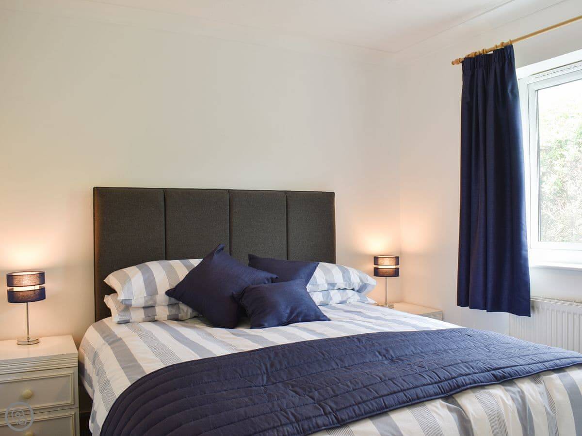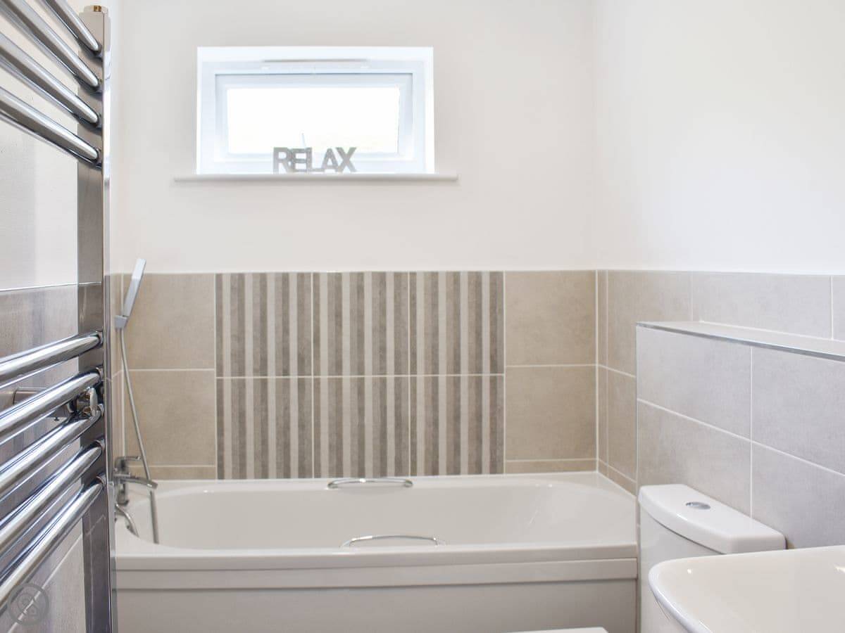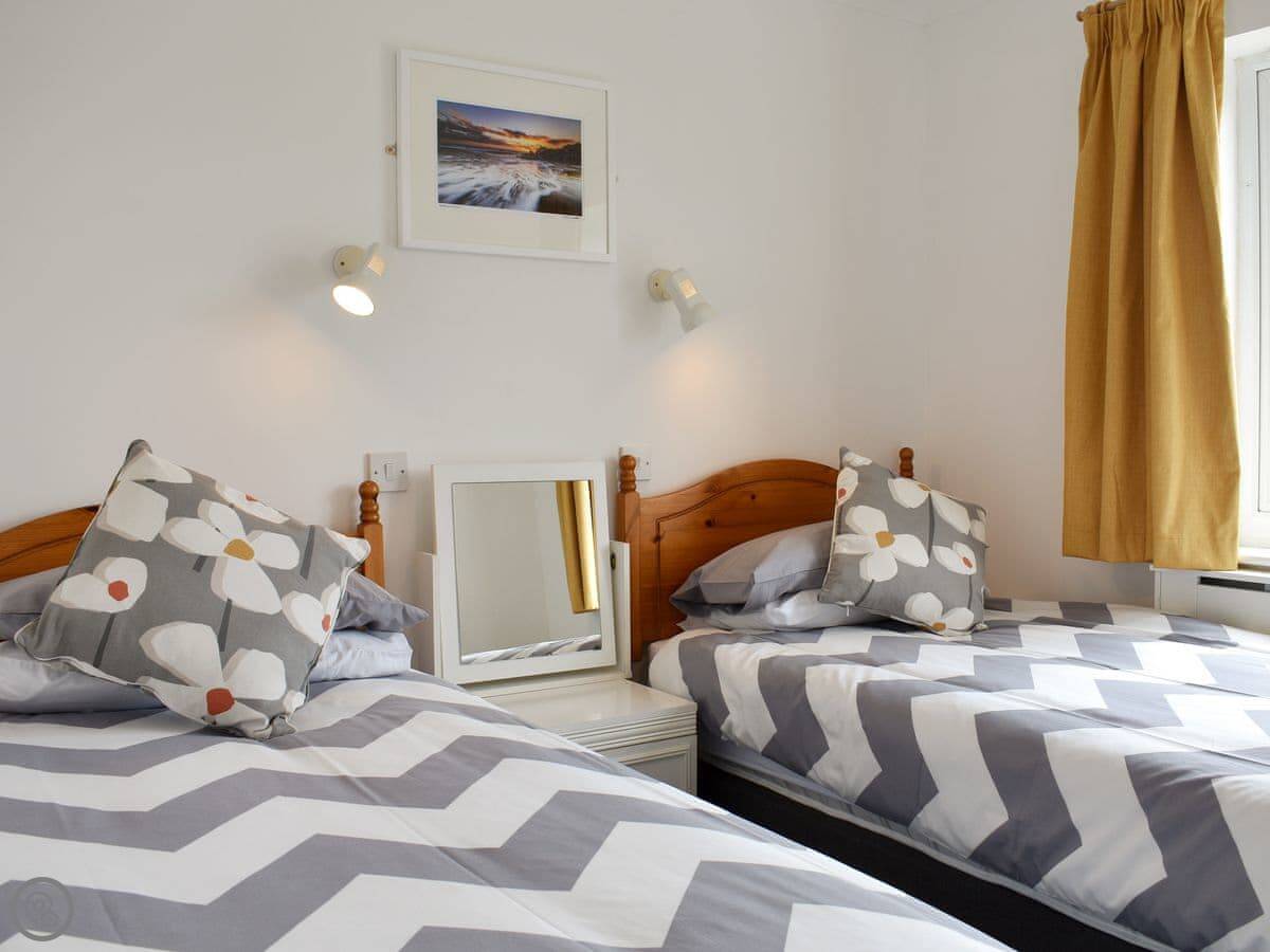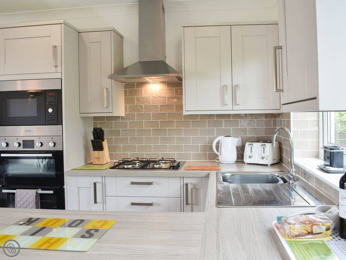 It sleeps six people. Three bedrooms, two bathrooms. Everything is on the ground floor, so it's all flat inside. It's got a 4 Star rating. The doors are wide enough for a wheelchair and there's a walk-in shower. It's clean and modern.
