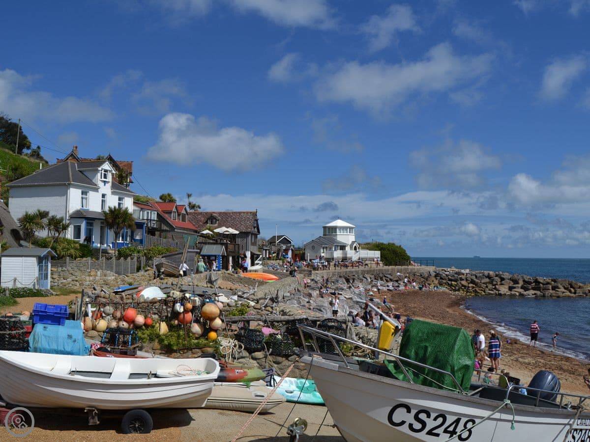 The beach is the main thing. It's about a hundred yards walk. Yaverland Beach is sandy and good for swimming. You can see the red cliffs and the white chalk of Culver Cliff from there. The Dinosaur Isle museum is nearby if fossils are of interest.