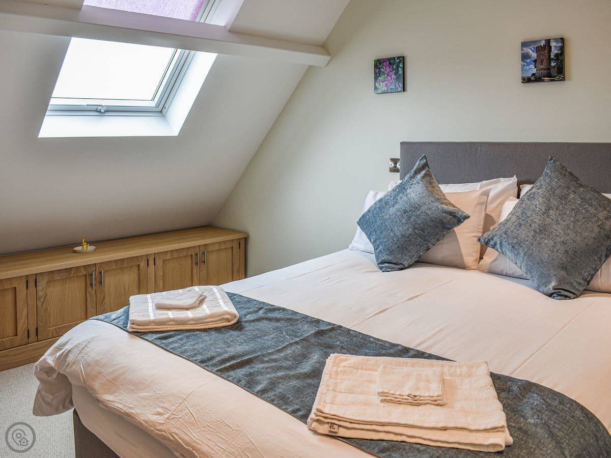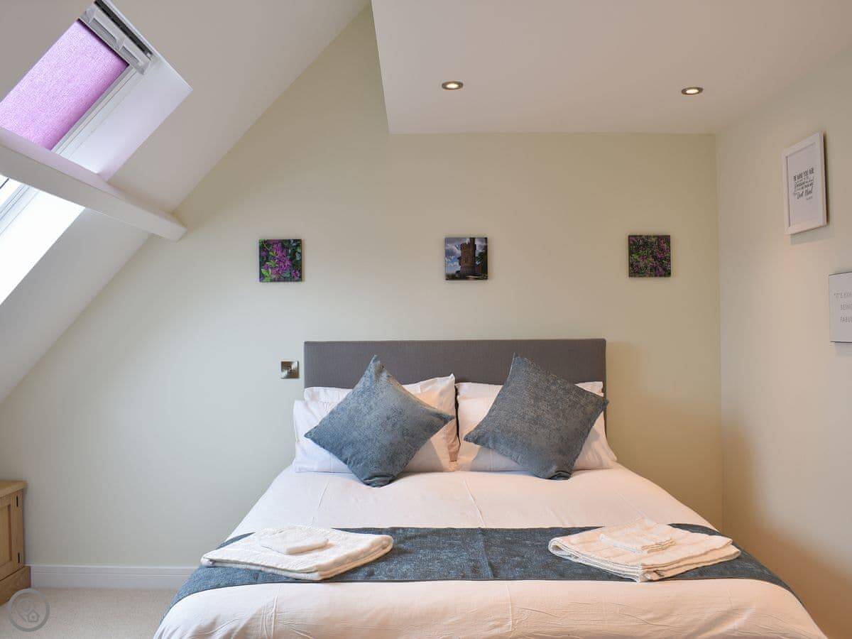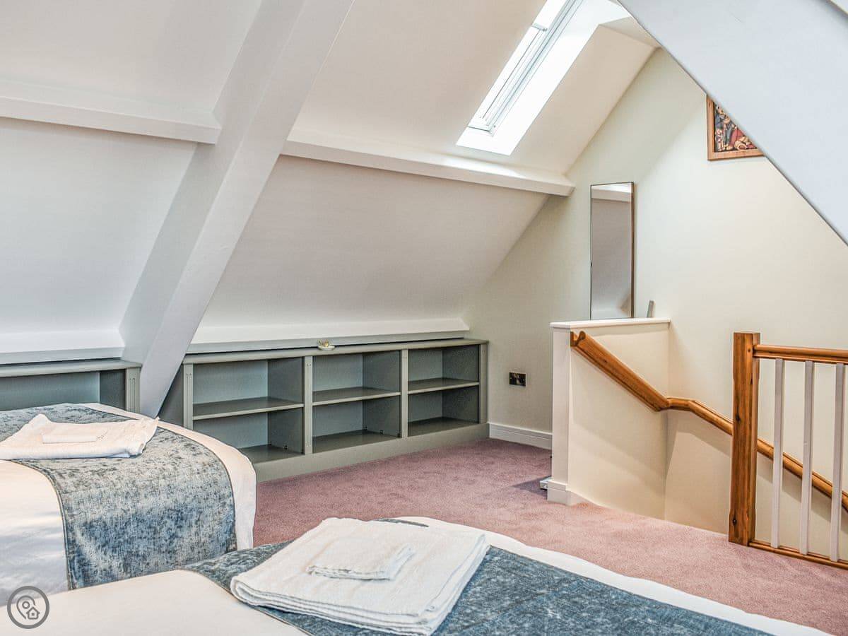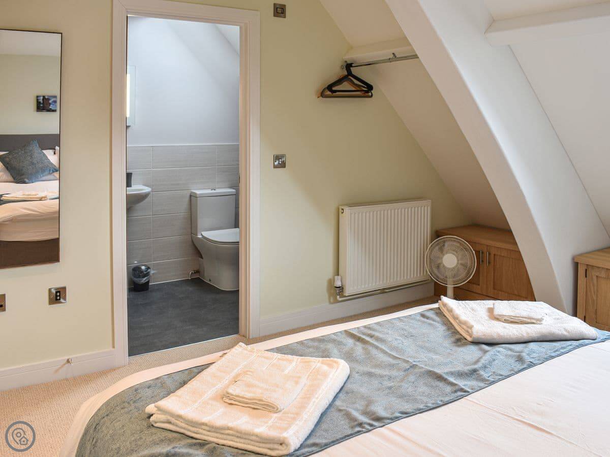 There are three bedrooms and two bathrooms. It's got a 5 Star rating. The main bedroom has its own shower room. The top floor is one big room with two double beds, so it's good for kids or another couple. The stairs are normal, fine.