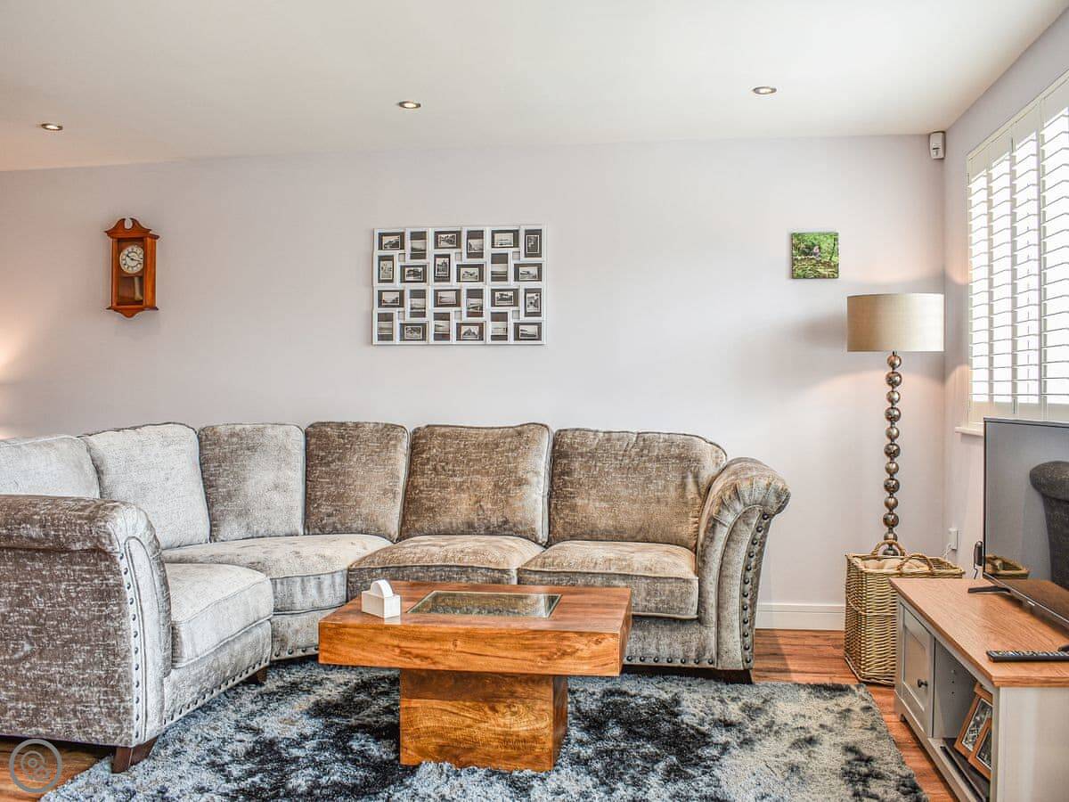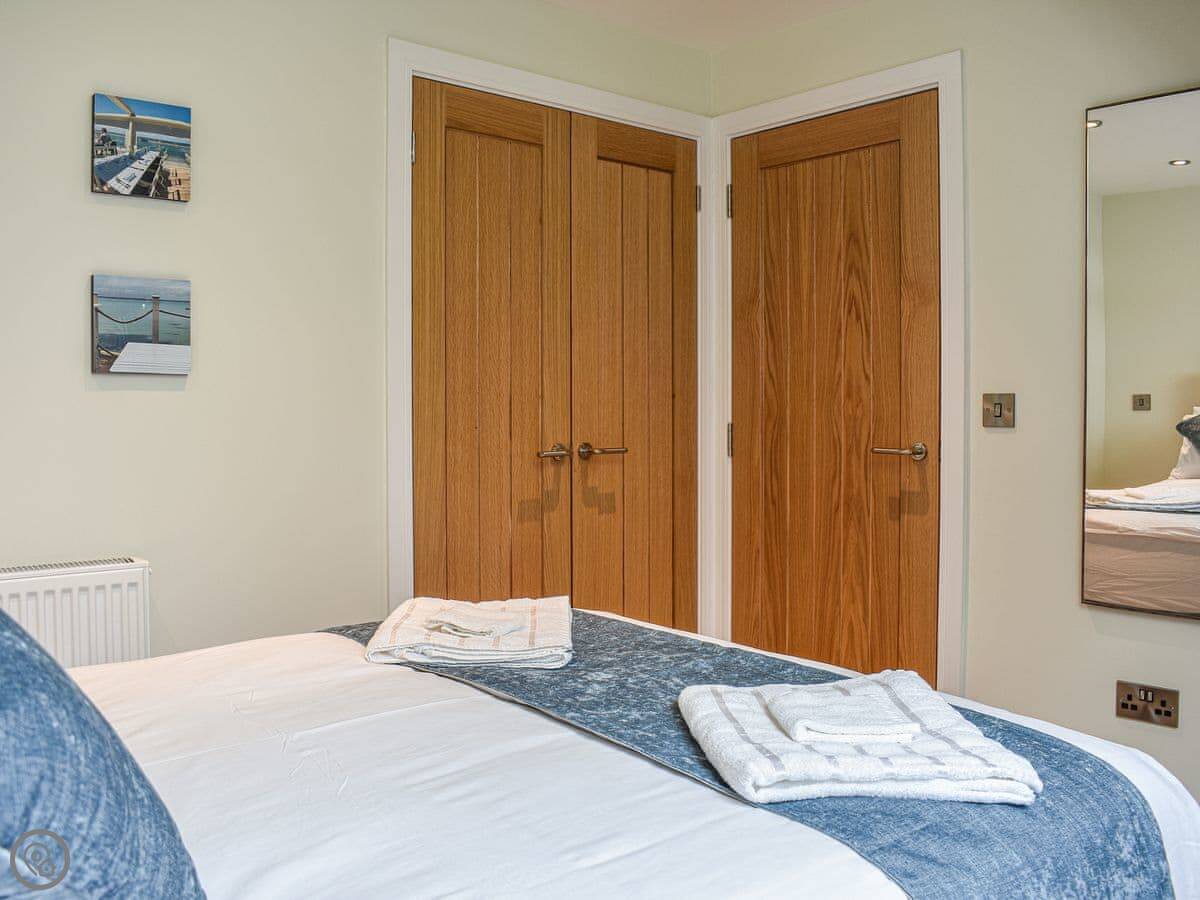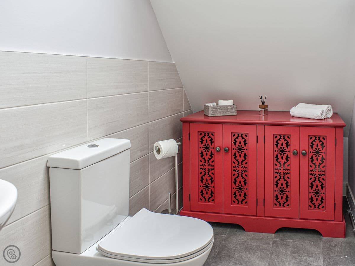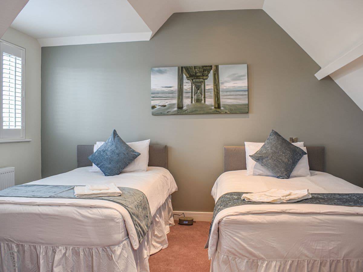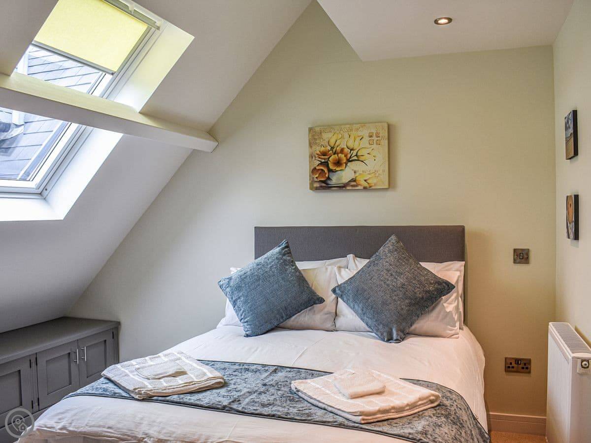 There are three bedrooms and two bathrooms. It's got a 5 Star rating. The main bedroom has its own shower room. The top floor is one big room with two double beds, so it's good for kids or another couple. The stairs are normal, fine.