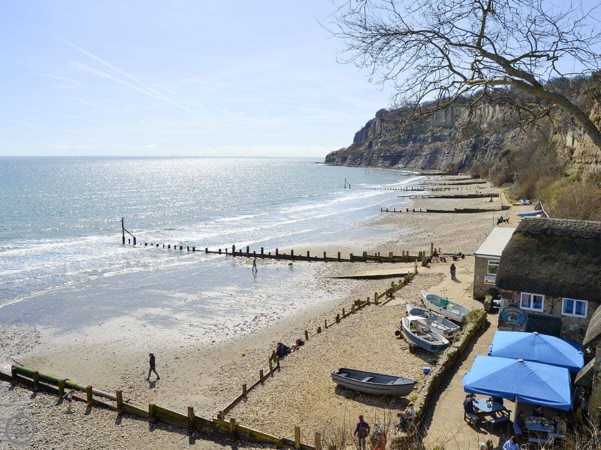 You're a few minutes' walk from the cliff path. That takes you down to the beach in about ten minutes. The beach is sandy. The esplanade has the usual seafront stuff, like crazy golf and places to eat. The old village part of Shanklin is nice, with thatched cottages and tea rooms. There's a shop about half a mile away, and a pub and restaurant are closer, about 550 yards.