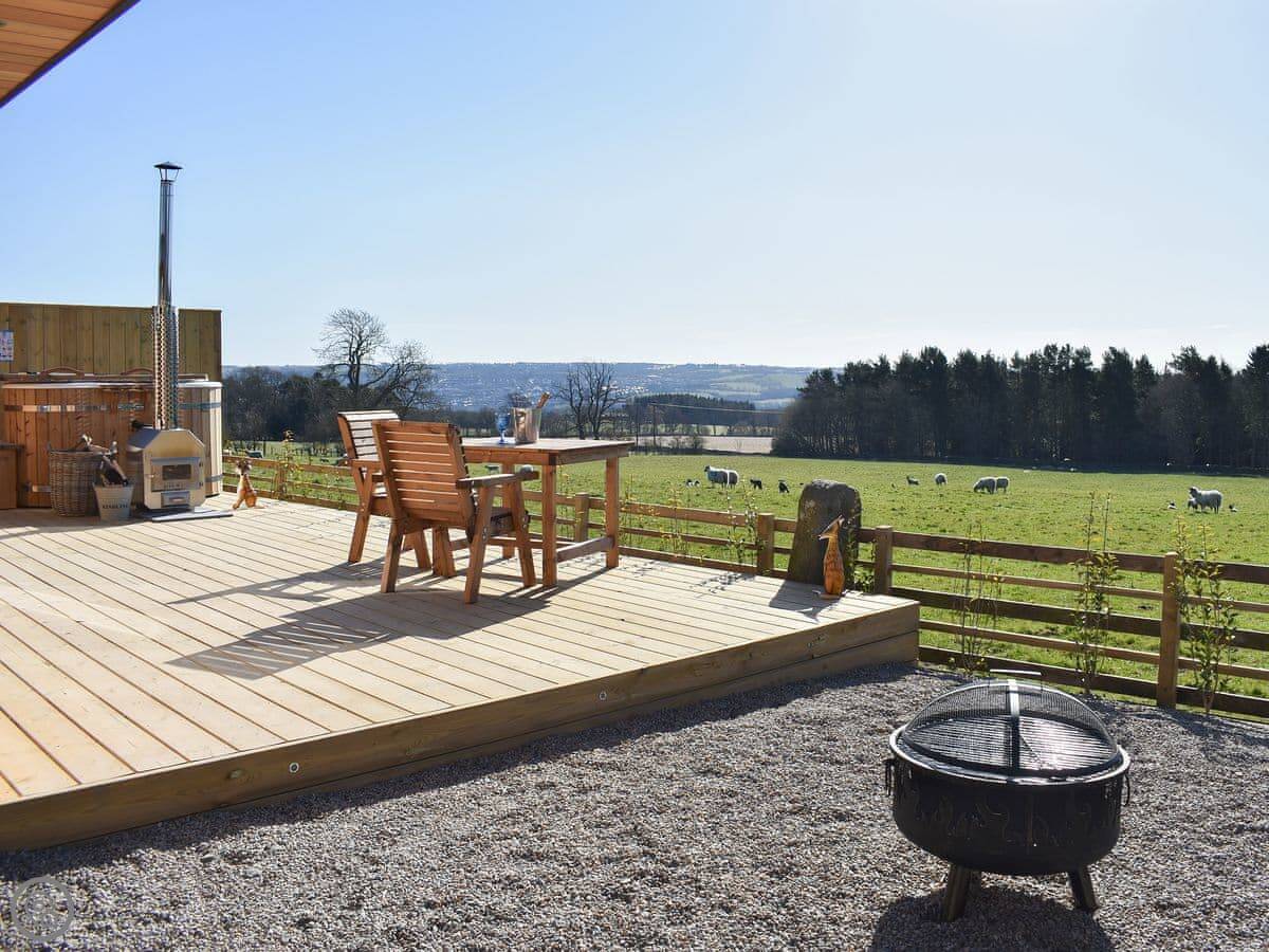 This fabulous wooden lodge has a cosy open living/dining/kitchen/bedroom area, boasting a Smart TV and comfortable furnishings and fittings to ensure you will feel right at home. There is also a large patio door leading out to your decked area, complete with a fire pit and a wood-fired tub. Boasting views over the picturesque countryside beyond, it makes the perfect spot to enjoy a morning coffee whilst you plan your day.