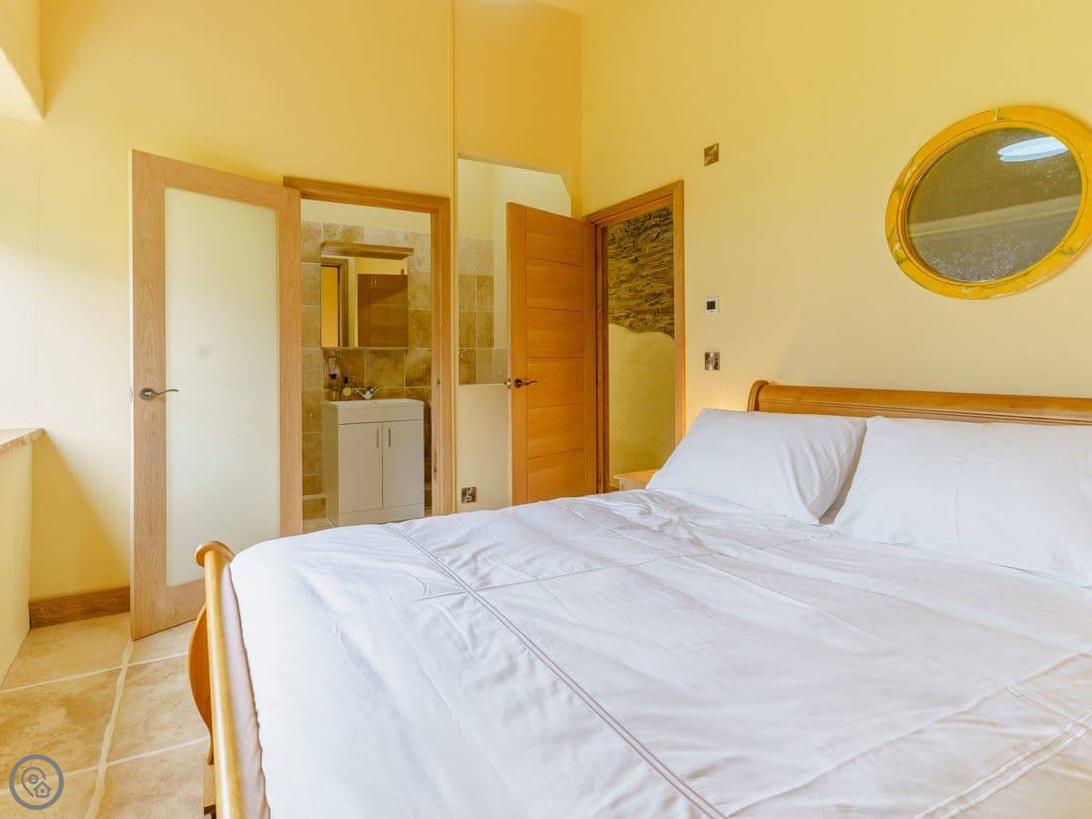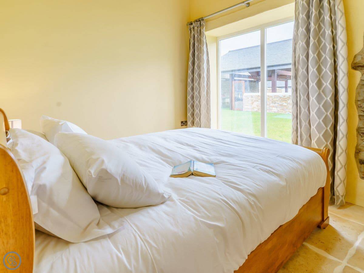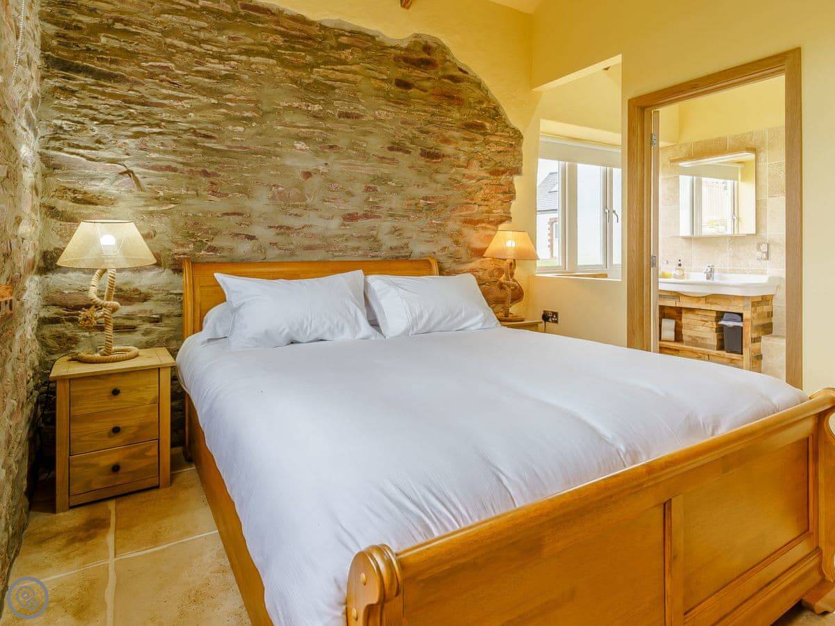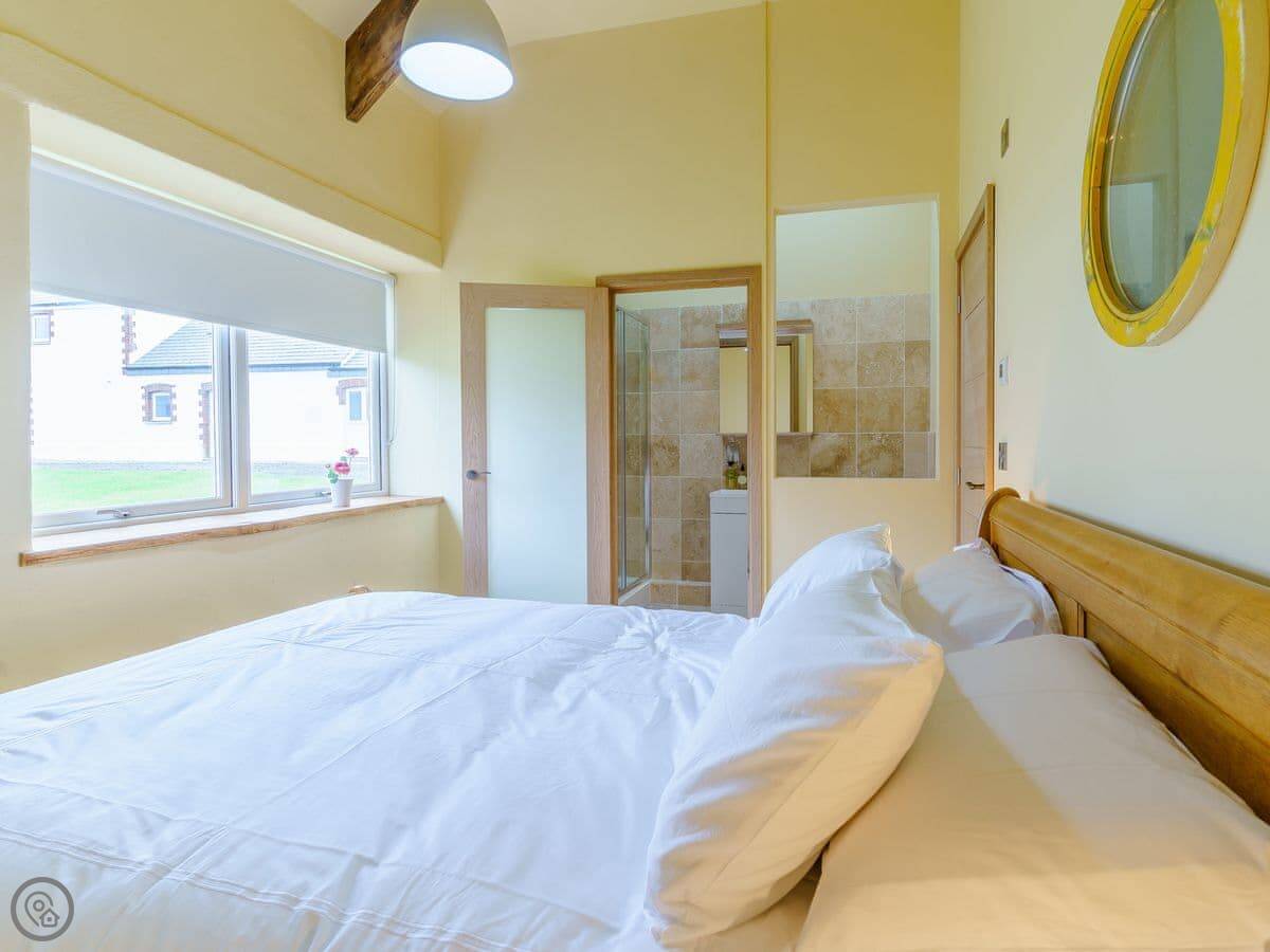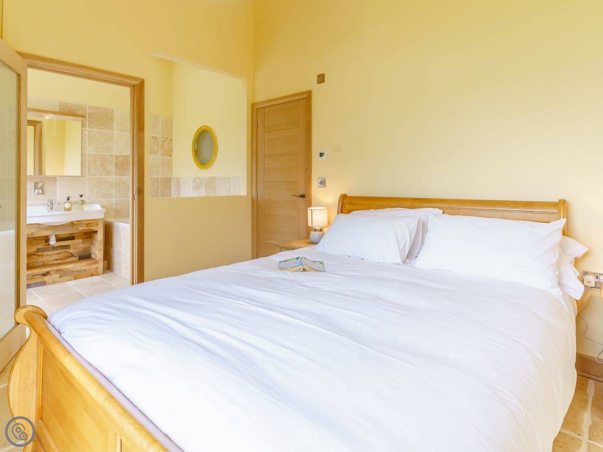 It sleeps six, in three bedrooms. Each bedroom has its own bathroom. The whole place is on one level, which works well for accessibility or if you just don't fancy stairs. It's got a 5 Star grading, which means it's been finished to a high standard. The ceilings are vaulted, with some exposed stone and beams.