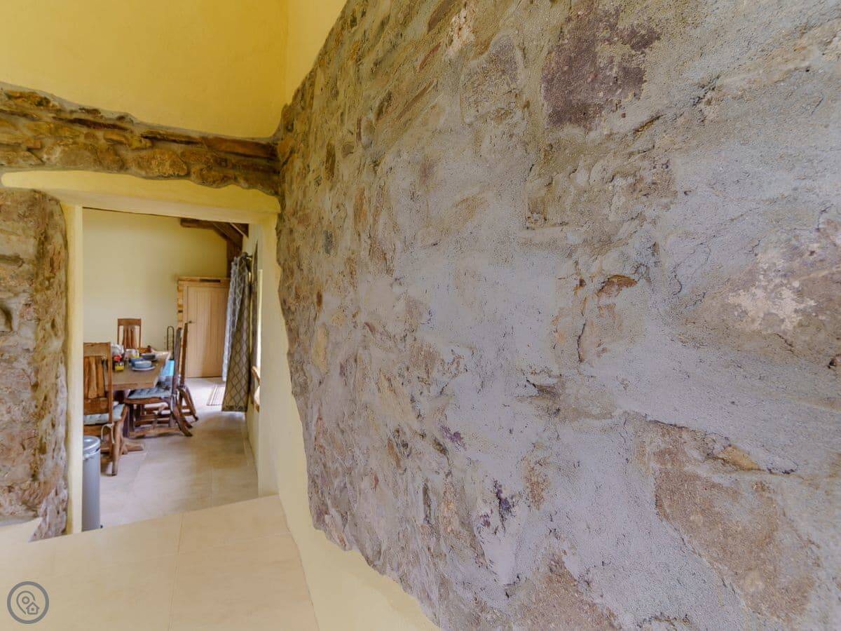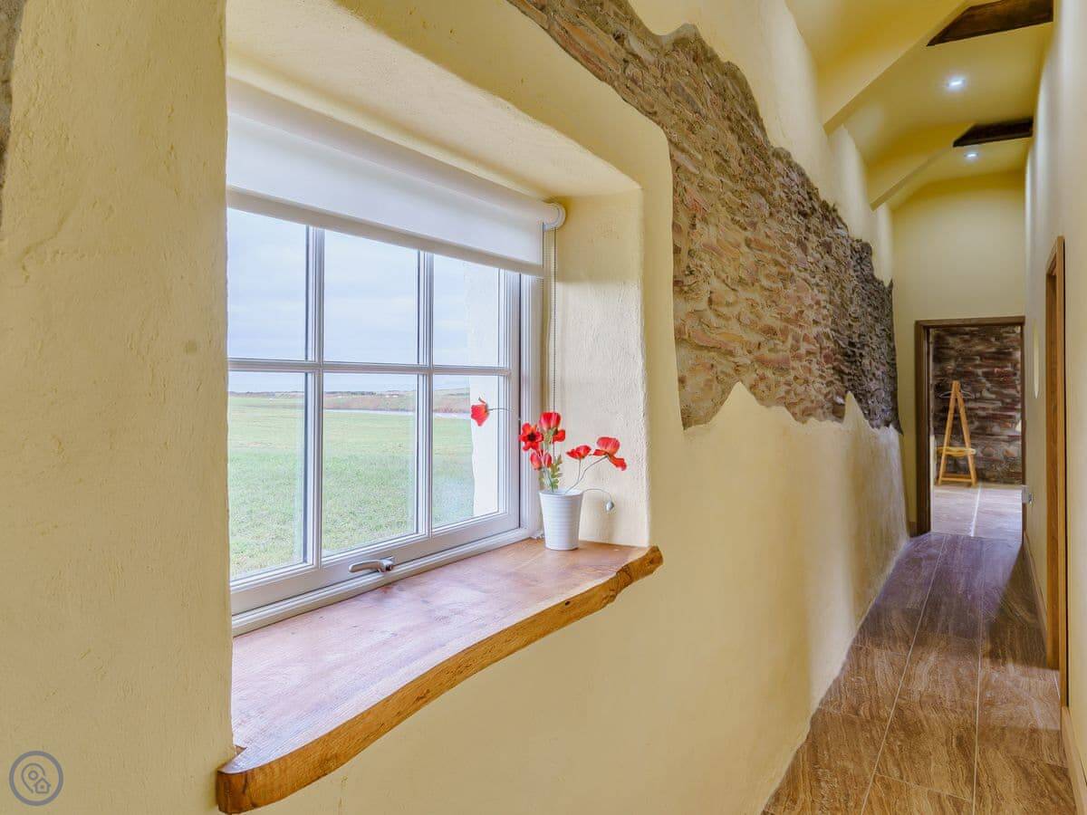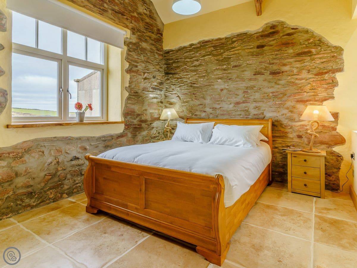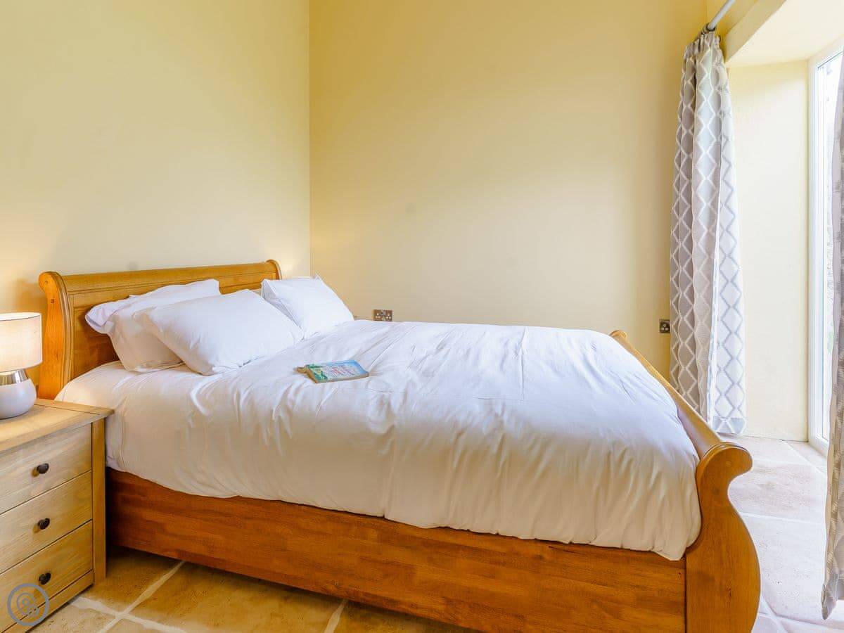 It sleeps six, in three bedrooms. Each bedroom has its own bathroom. The whole place is on one level, which works well for accessibility or if you just don't fancy stairs. It's got a 5 Star grading, which means it's been finished to a high standard. The ceilings are vaulted, with some exposed stone and beams.