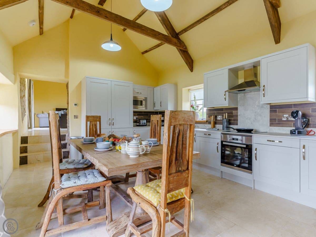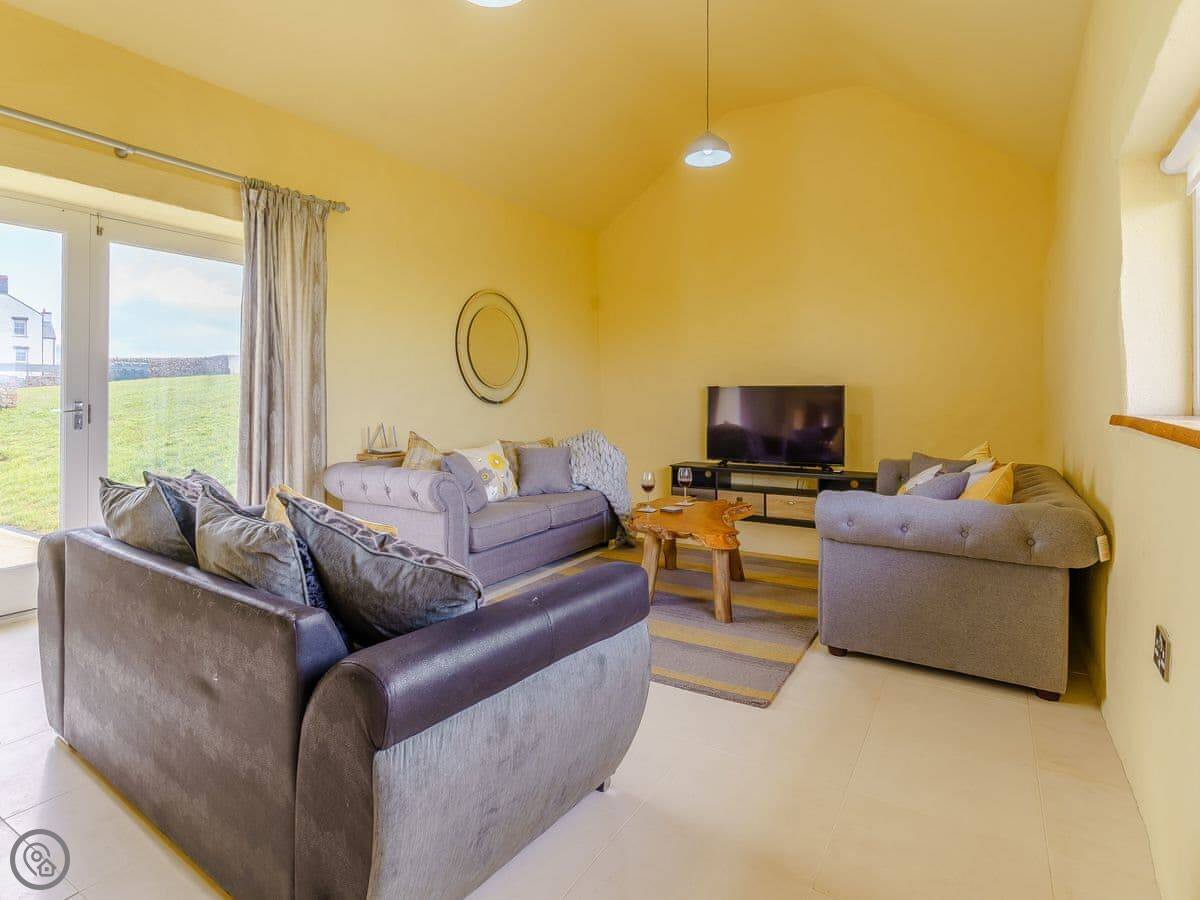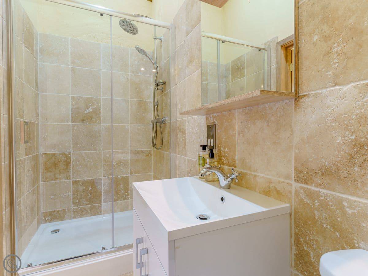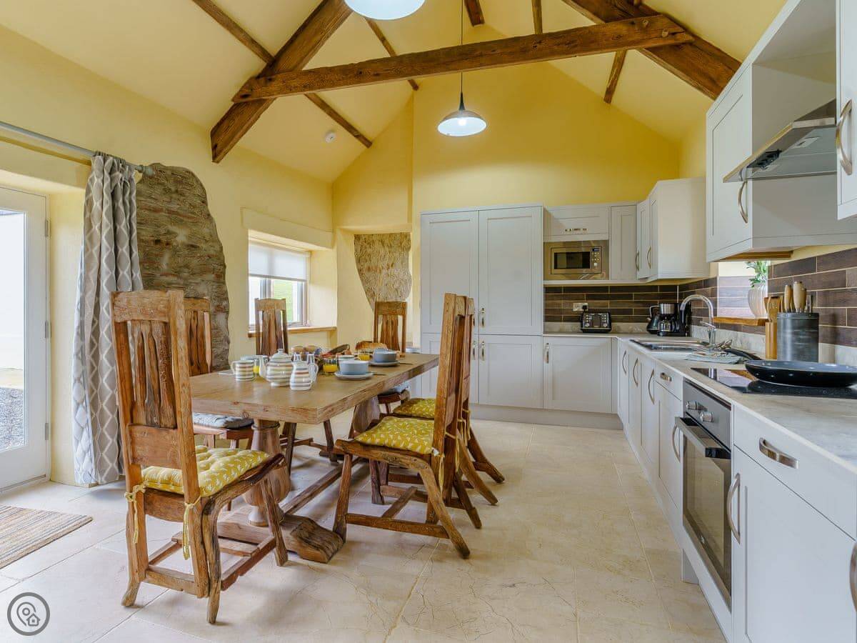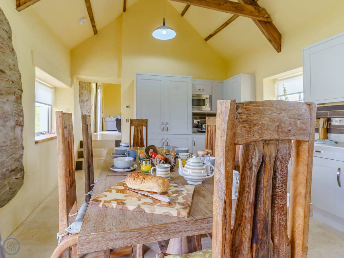 It sleeps six, in three bedrooms. Each bedroom has its own bathroom. The whole place is on one level, which works well for accessibility or if you just don't fancy stairs. It's got a 5 Star grading, which means it's been finished to a high standard. The ceilings are vaulted, with some exposed stone and beams.
