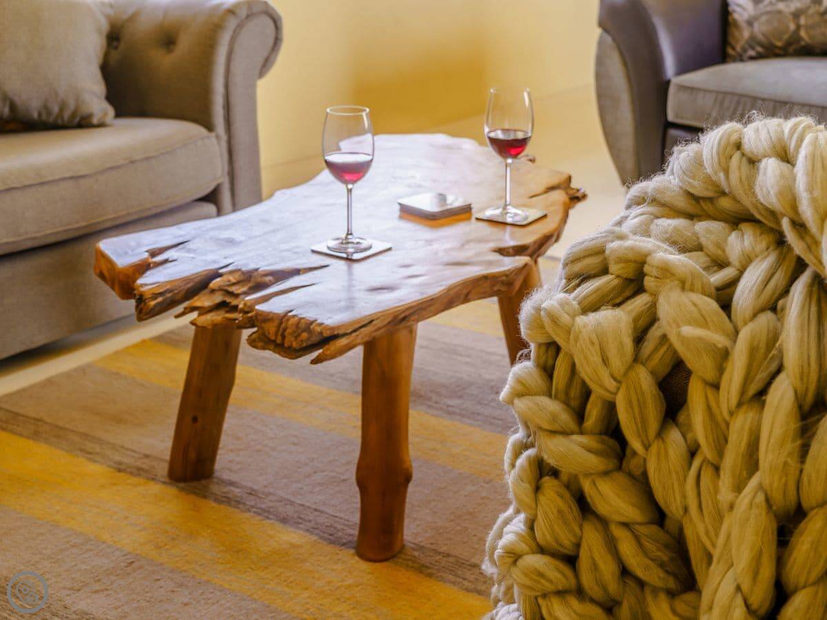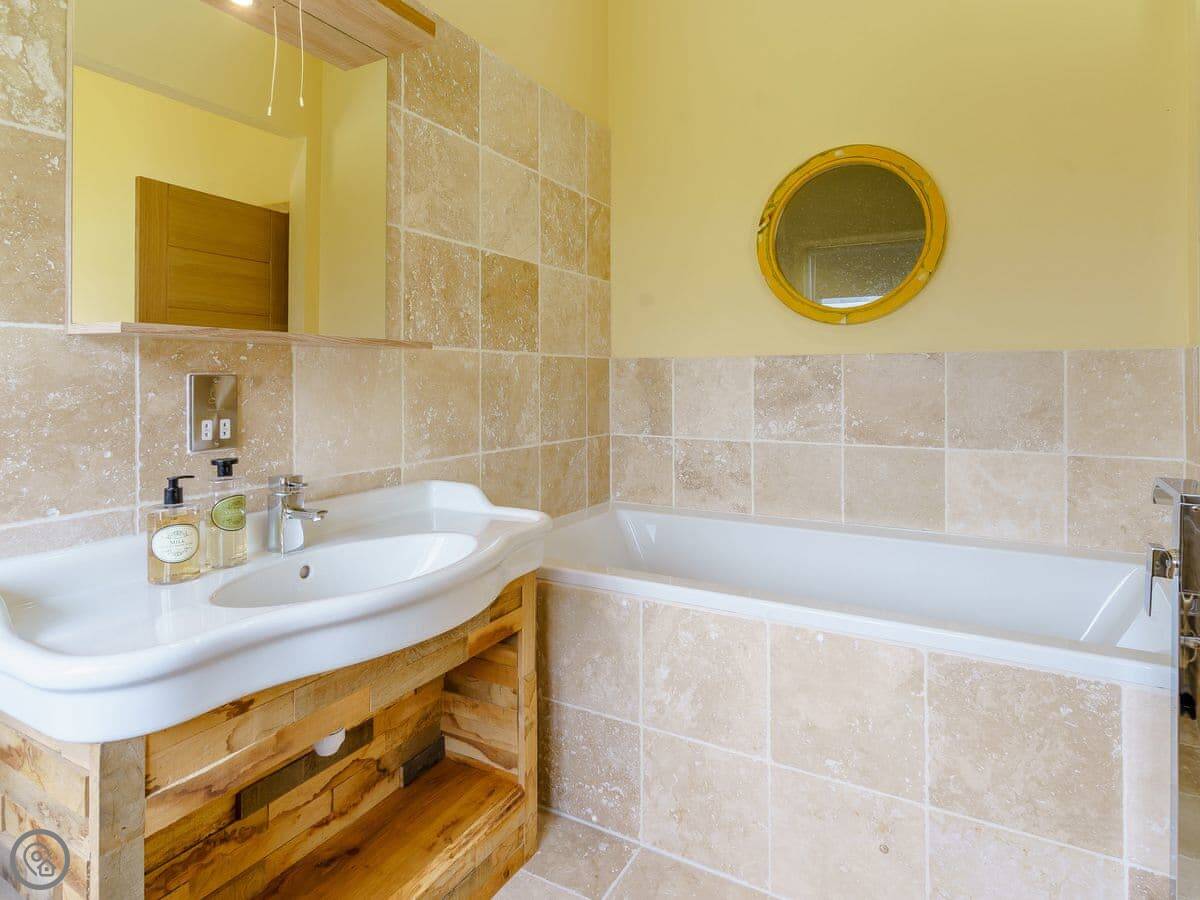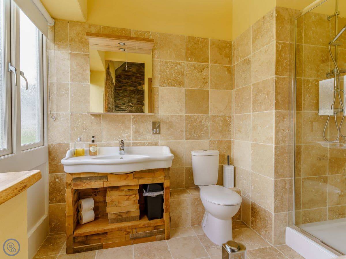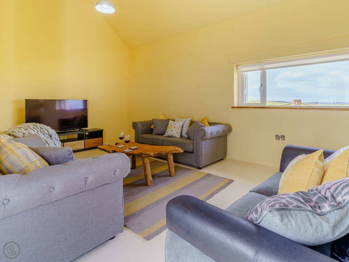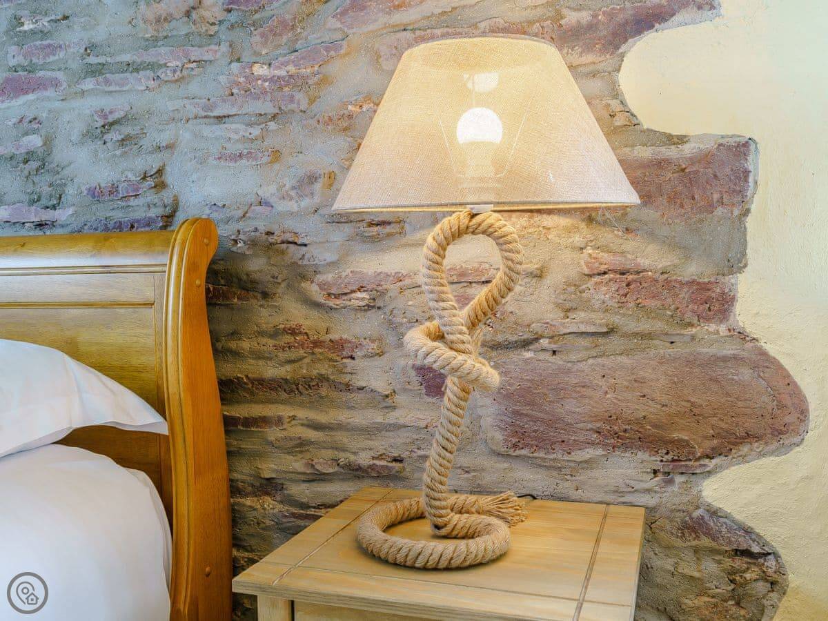 It sleeps six, in three bedrooms. Each bedroom has its own bathroom. The whole place is on one level, which works well for accessibility or if you just don't fancy stairs. It's got a 5 Star grading, which means it's been finished to a high standard. The ceilings are vaulted, with some exposed stone and beams.