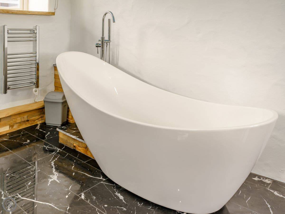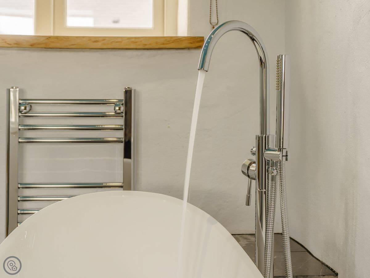 The main room is open plan. Doors lead out to a small private patio. The bedroom has a kingsize bed. The bathroom has both a walk-in shower and a separate freestanding bath.