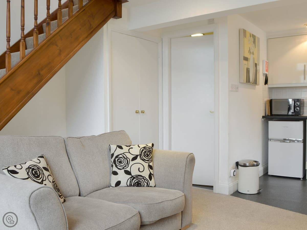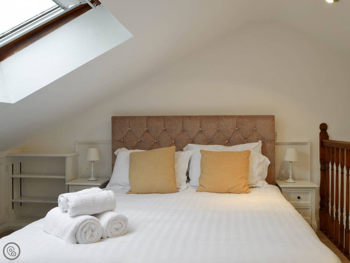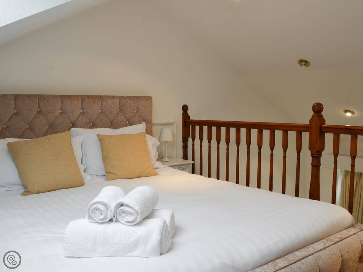 It's a three-star place, so think clean and comfortable, not luxury. It sleeps two. There's one bedroom upstairs, which is a galleried room looking down over the living area. The bed is a kingsize. The stairs up to it are a typical cottage staircase, so they're a bit steeper than normal.