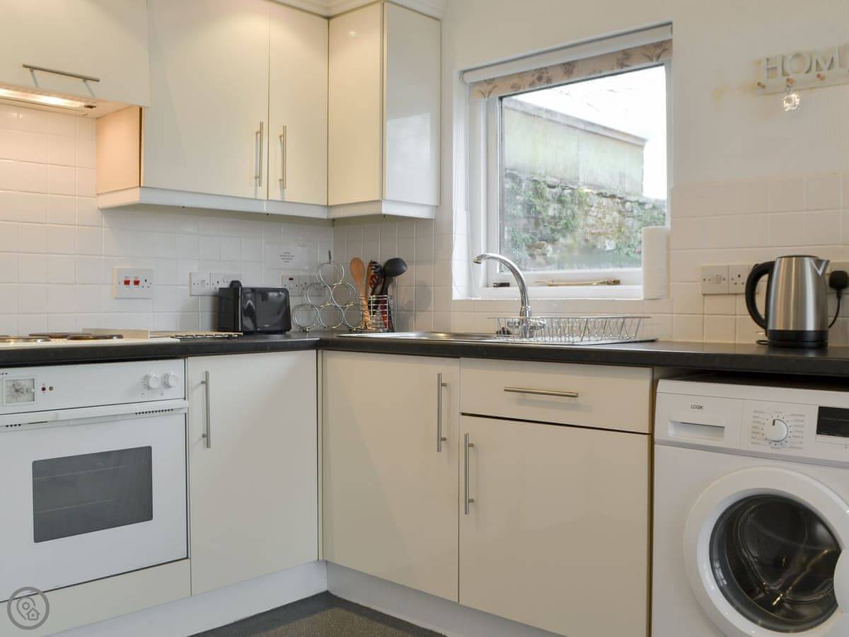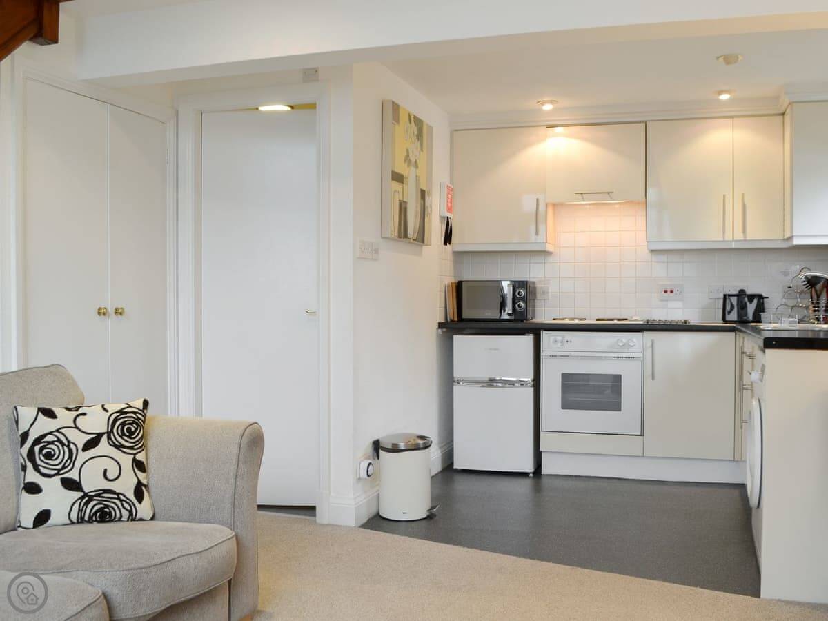 Downstairs is all open plan: kitchen, dining area, and sitting room with a TV. There's a patio garden out the back. It has its own parking space on site, which is handy in Windermere.