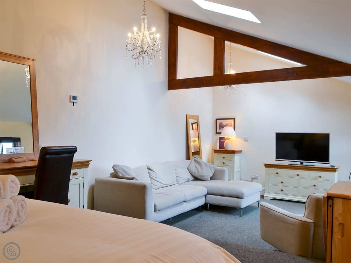 Sleeping two, this beautiful open-plan studio style cottage is just the place for couples looking for a relaxing break in the heart of The Lake District National Park. Decorated and furnished to a very good standard, you’ll feel at home the moment you arrive. The open plan living space features a vaulted ceiling with exposed beams and Velux windows which flood the area with plenty of natural daylight. You have a large comfortable sofa and an armchair along with a flatscreen TV, perfect for a cosy movie night. The high quality furnishings and tasteful décor make for a peaceful and relaxing space, ideal after a busy day of exploring the Lake District. The kitchen is well equipped with everything you need for your stay, and there’s a small dining table for two, perfect for eating a hearty breakfast at or a romantic evening meal while sharing a bottle of wine. The sleeping area has a kingsize bed and plenty of storage and hanging space for your belongings as well as a dressing table. Just off the main room is a modern bathroom finished to high standard with a large bath with overhead shower. High speed Wifi is available throughout the property. Outside youll find a cobbled area, a seating area, the ideal place for a bit of fresh air whilst enjoying your morning coffee.