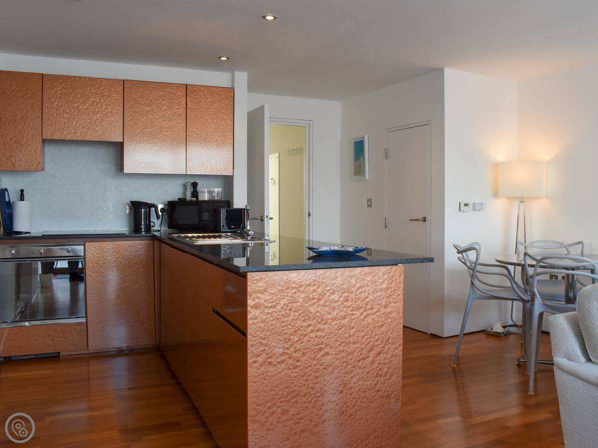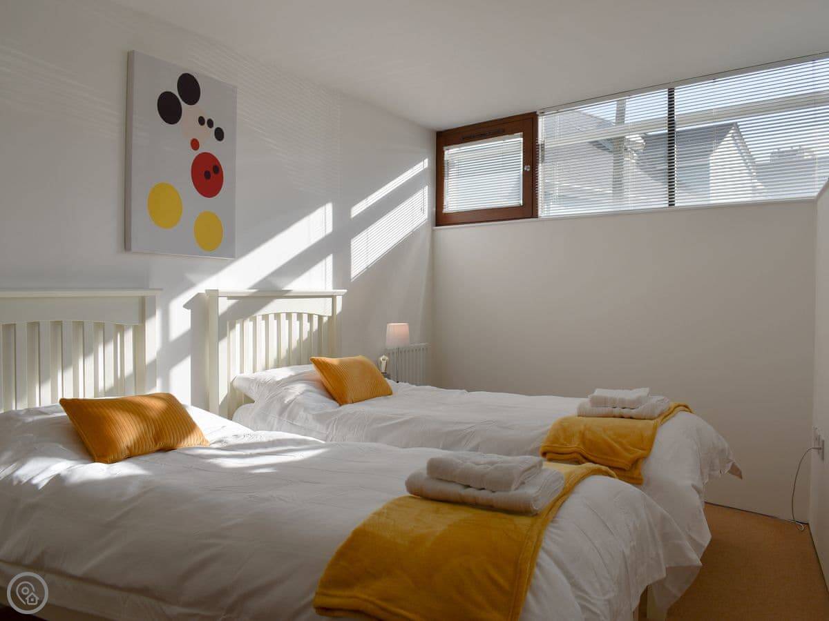 It sleeps four. Two bedrooms, both with their own bathrooms. The main bedroom has a big bed and floor to ceiling windows. The second bedroom has two singles. It's modern. It was all redone in 2020 so it's clean and straightforward. It's got a 4 Star rating.