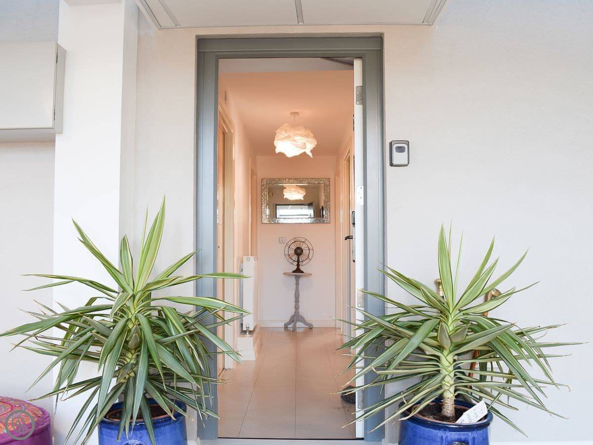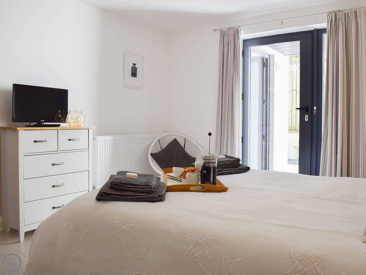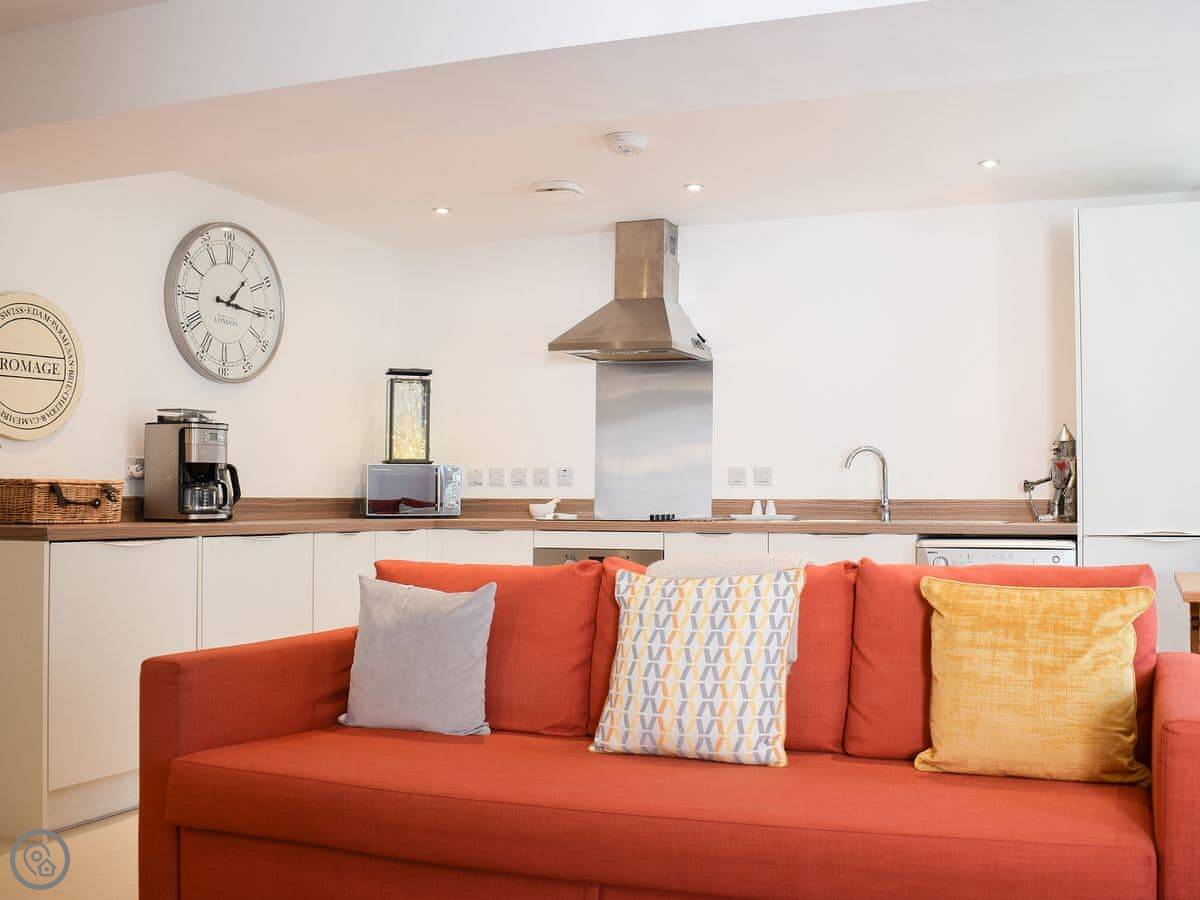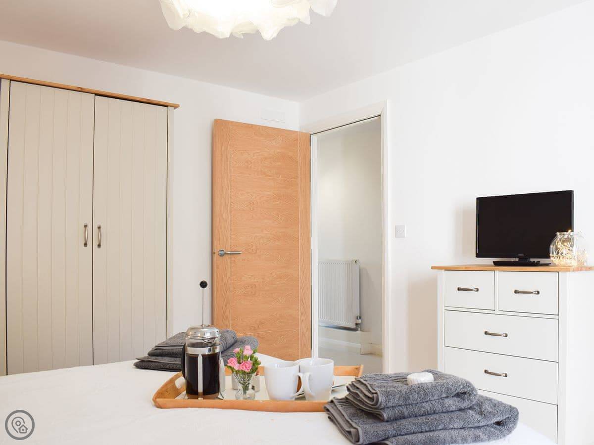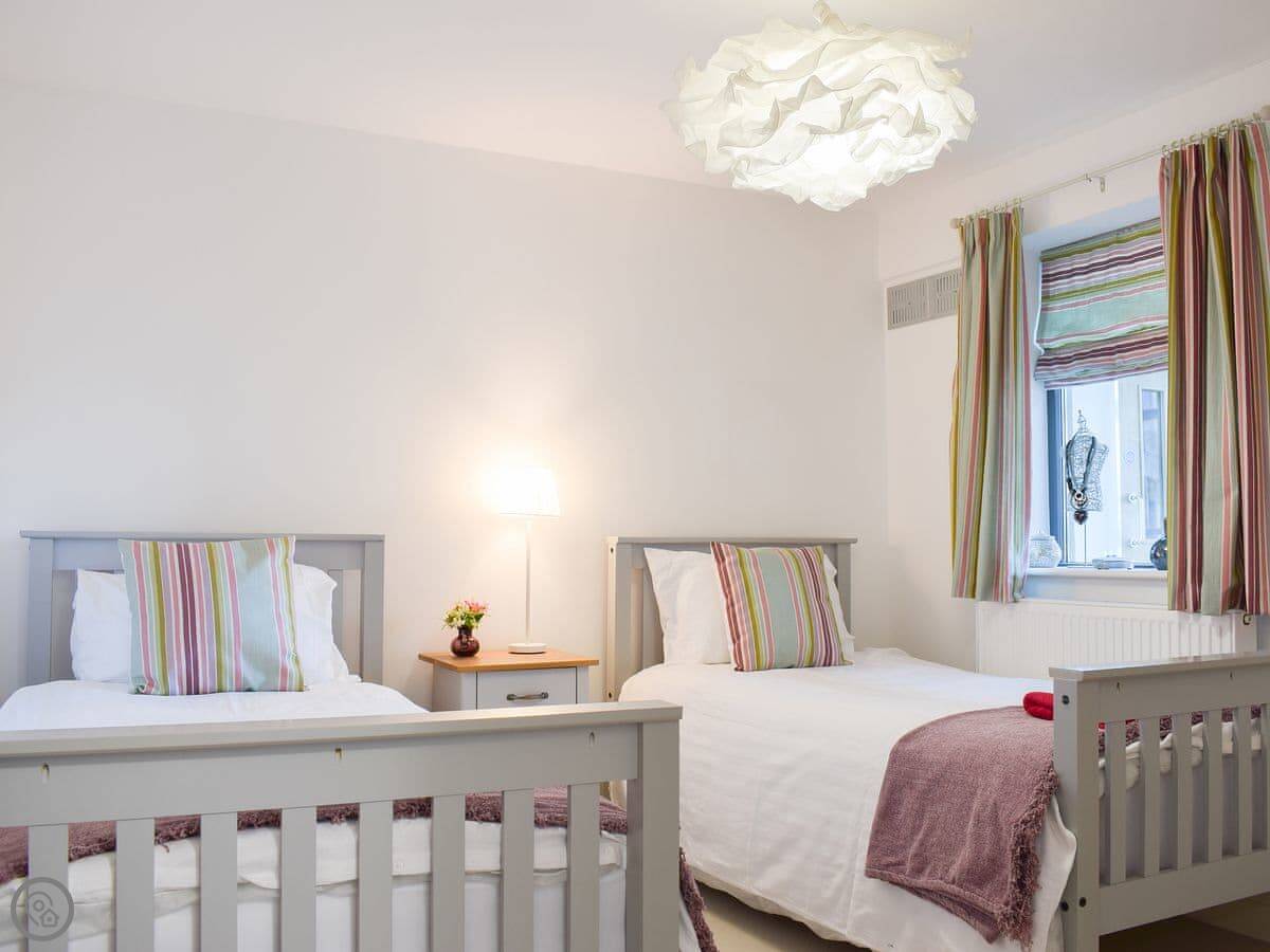 It sleeps four. Two bedrooms, one bathroom. One has a king-size bed, the other has two singles. The living area is all open plan. The kitchen has a dishwasher. There's a patio door that opens onto a shared garden space. You'll get a parking space.