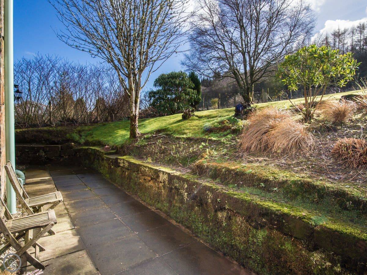 The garden has a lot of shrubs and flowers. There's seating where you can sit and look at the view. Behind the cottage there's pine forest with trails for walking or cycling that eventually link down to the villages.