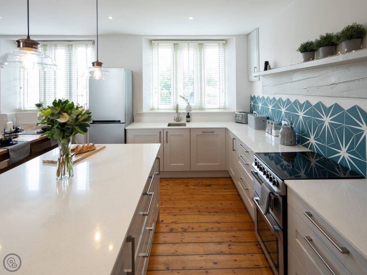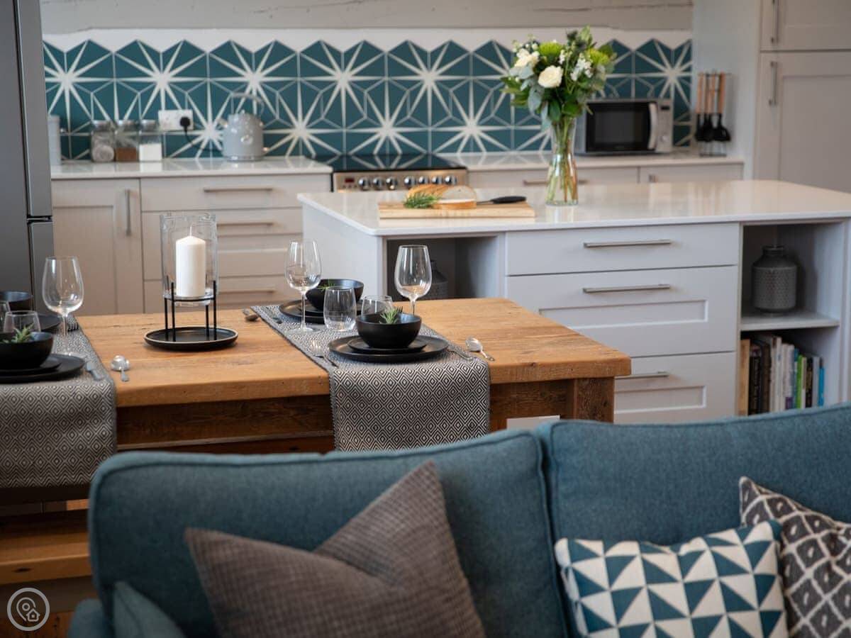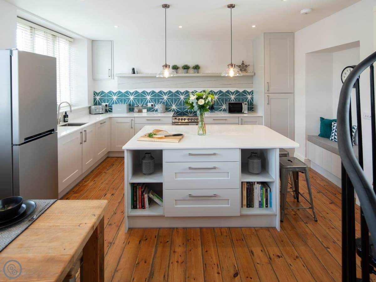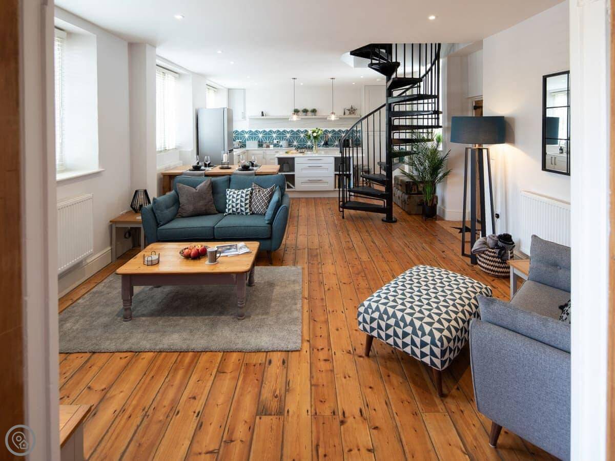 Set in the village of Kennford, this unique property sits in the Kenn Valley only 6 miles away from the city of Exeter, with a local shop, café and pub only a stone’s throw away. Step through the front door into the open-plan living space which feels bright and spacious. The kitchen is well-equipped with a full range of appliances, quartz surfaces and a beautiful island worktop, perfect for enjoying your morning coffee whilst planning your fun-filled day ahead. The living area has comfortable seating and a 48" Sony Smart TV with Netflix, ideal for a cosy night in. Leading off the living area is a delightful walled garden at the back of the property which is completed with a paved seating area; a perfect spot to enjoy an al fresco summer supper or unwind with a glass of wine. Climb the spiral staircase to the first floor where guests will find two spacious double bedrooms and a family bathroom.