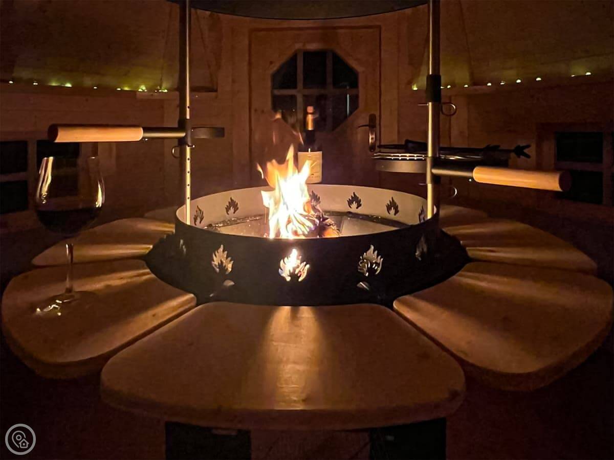 The kitchen is open plan with the dining area, and the living room has a wood burner. There's underfloor heating, so it’s always warm. Outside, there's a patio and an enclosed lawn at the front. We put in a summer house last winter with a fire pit inside it.