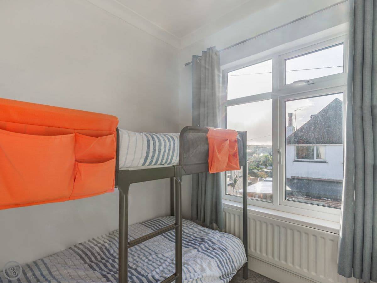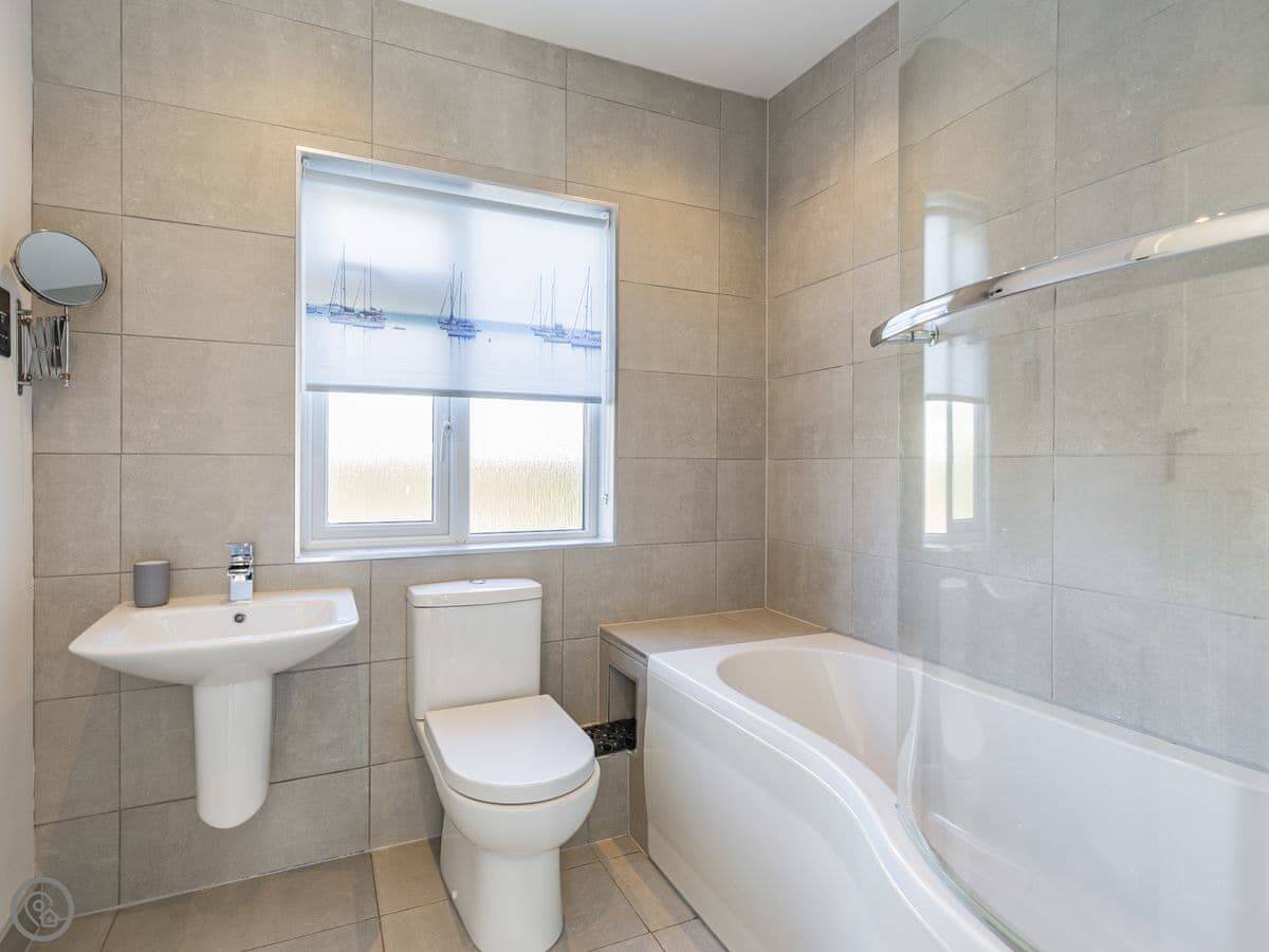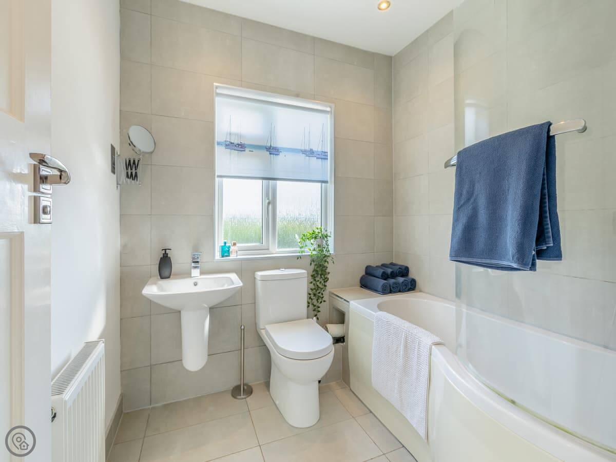 There's one bathroom. The third bedroom has a bunk bed, so it's best for kids. One of the double bedrooms has a zip and link bed, so you can make it two singles if you need to. The stairs have a stairgate at the top.