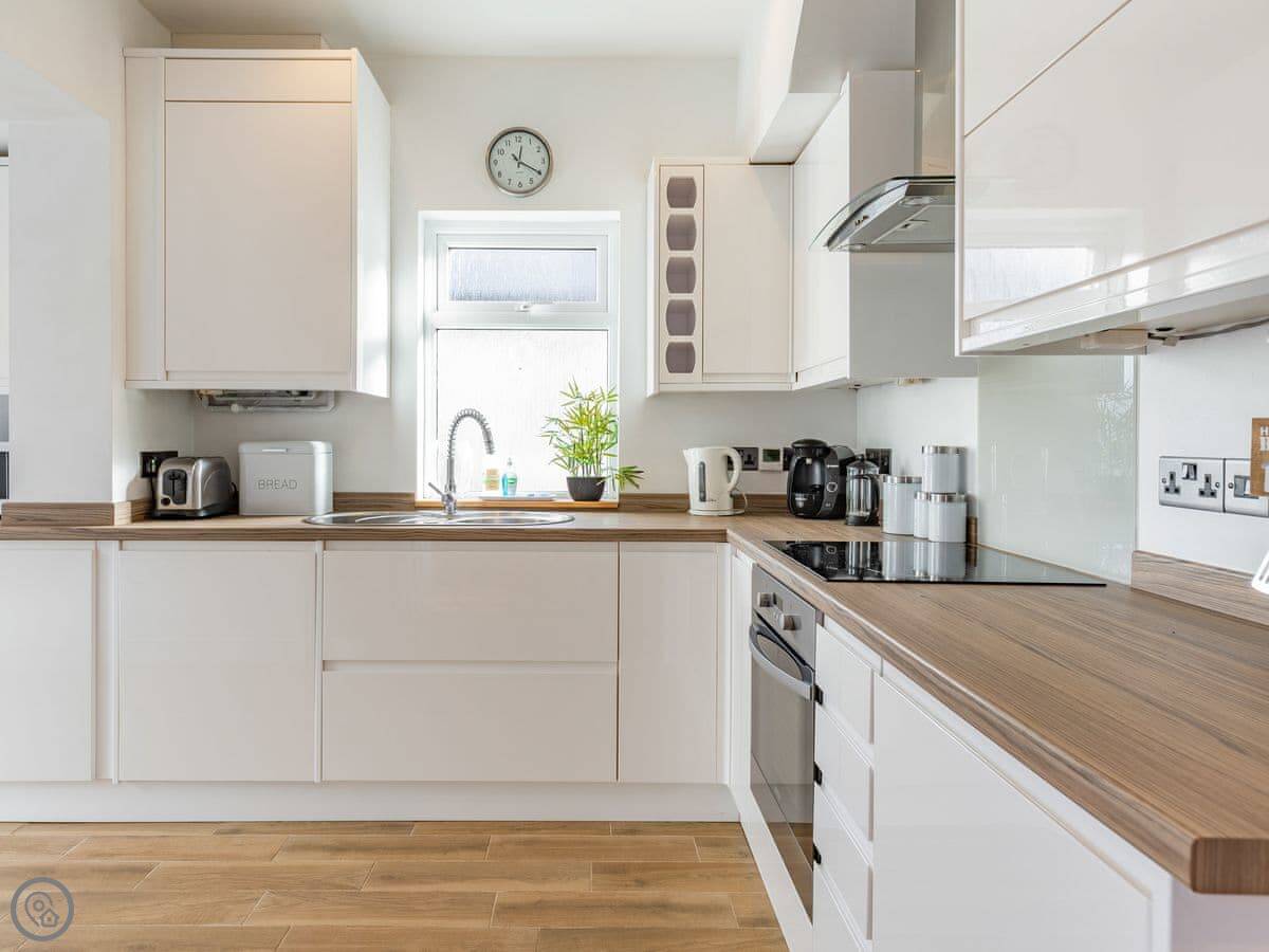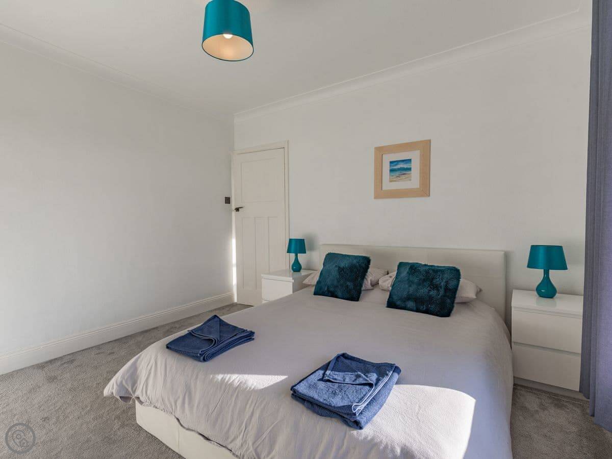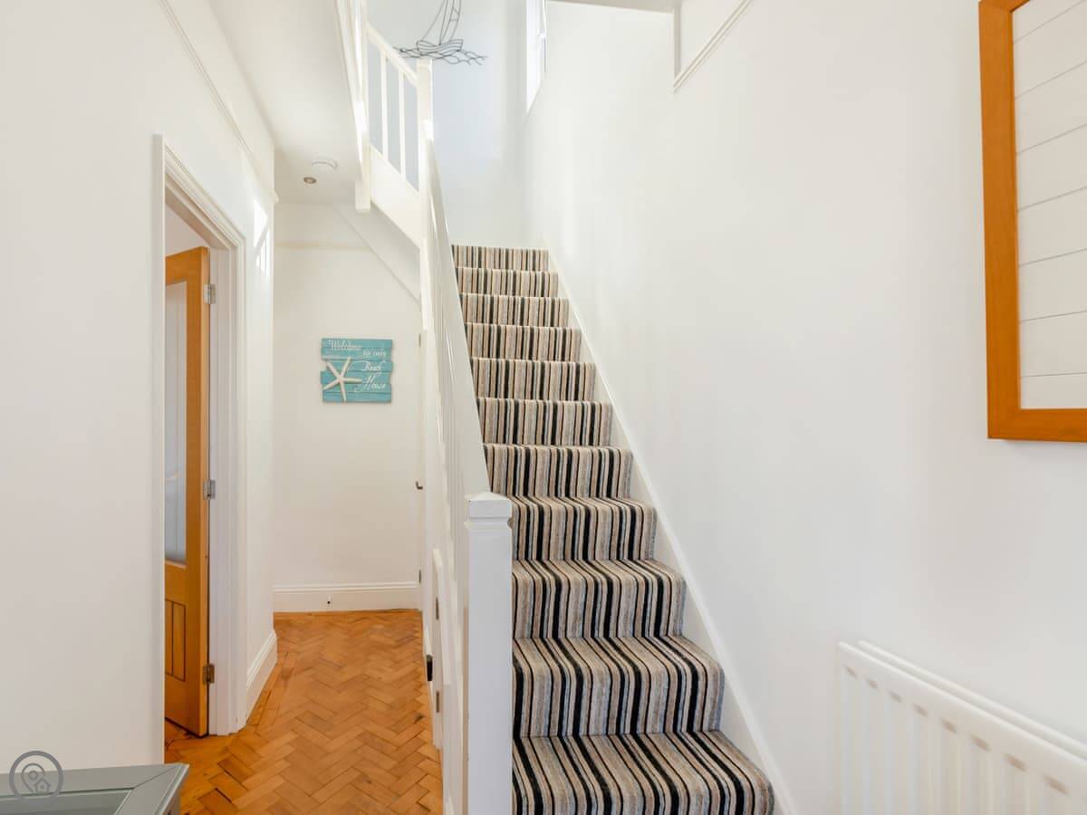 There's one bathroom. The third bedroom has a bunk bed, so it's best for kids. One of the double bedrooms has a zip and link bed, so you can make it two singles if you need to. The stairs have a stairgate at the top.