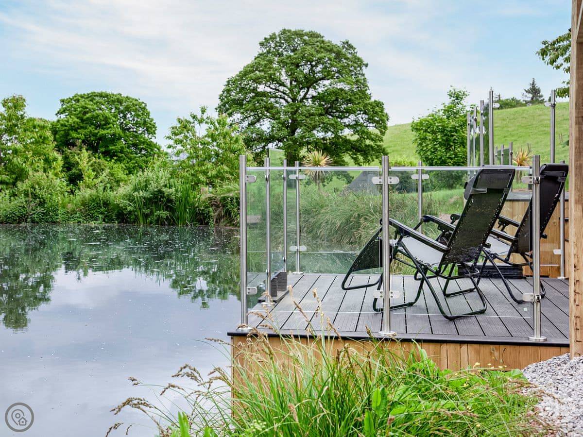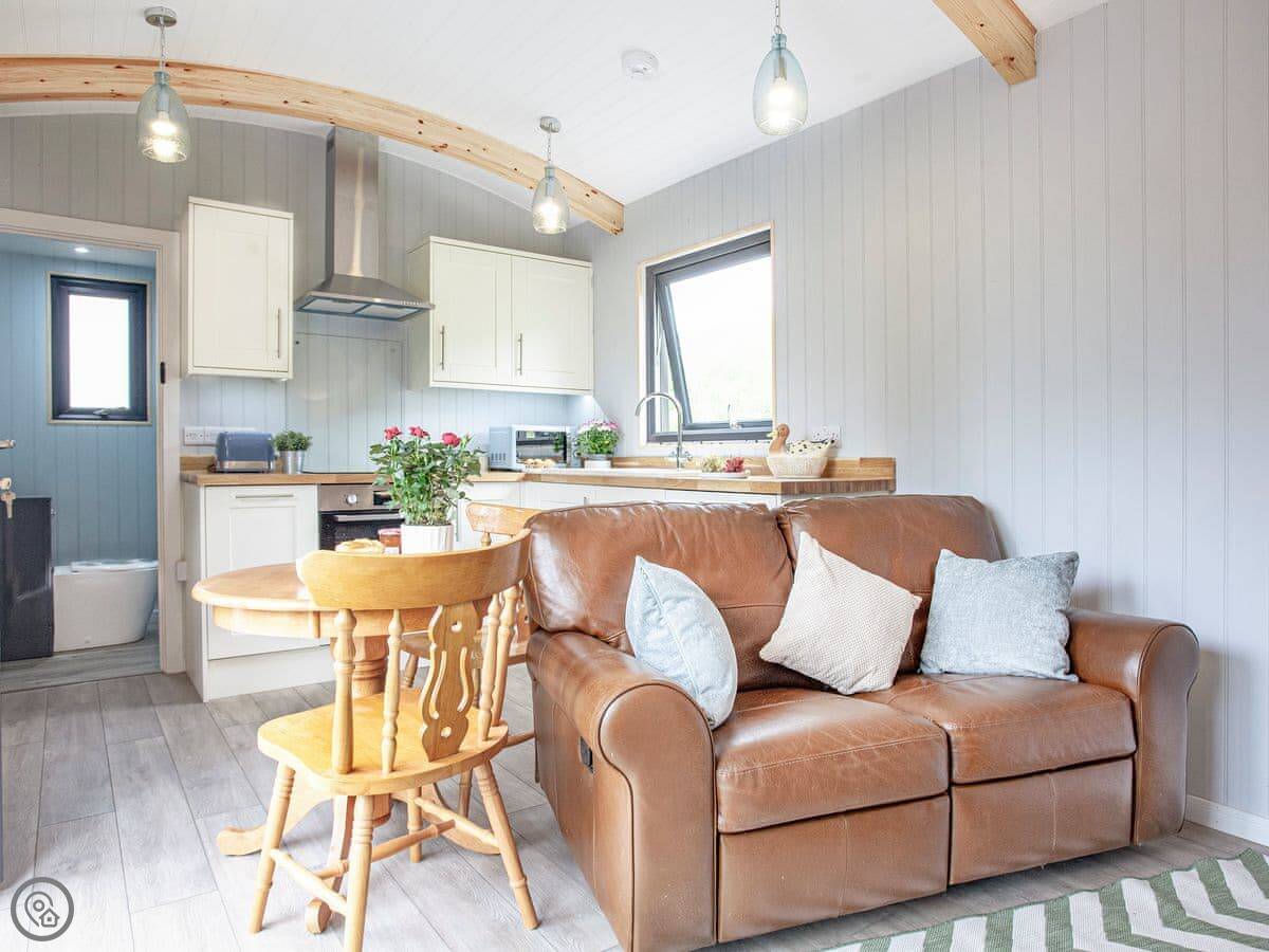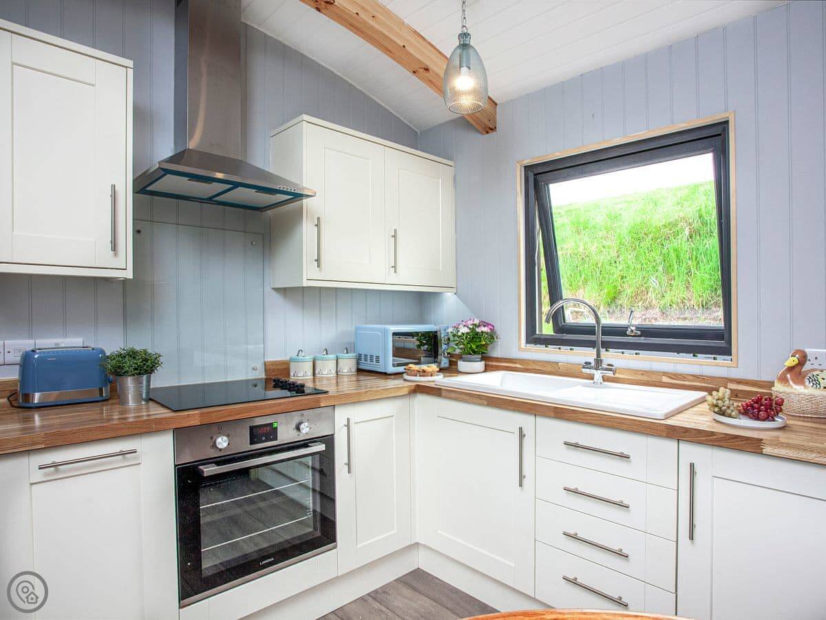 Moor Hen Shepherd Hut is a luxurious, one-bedroom retreat overlooking the fishing lakes at Ponsford Ponds, which is located just 5 minutes from Cullompton on the fringe of the Blackdown Hills, an Area of Outstanding Natural Beauty. This is the ultimate glamping experience with a shower room, bedroom and a spacious open-plan living space, plus there is also a hot tub for private use. The living area has a two-seater sofa, a Smart TV, coffee table and a electric fire, which makes the property super cosy in the winter. The kitchen is fitted with an electric oven, electric hob, slimline dishwasher, an under-the-counter fridge with an icebox, sink and a microwave. Outside, guests will enjoy private use of their own decked area overlooking the lake with a 3-seater hot tub and a set of table and chairs. The bedroom has a comfortable super kingsize zip and link bed.