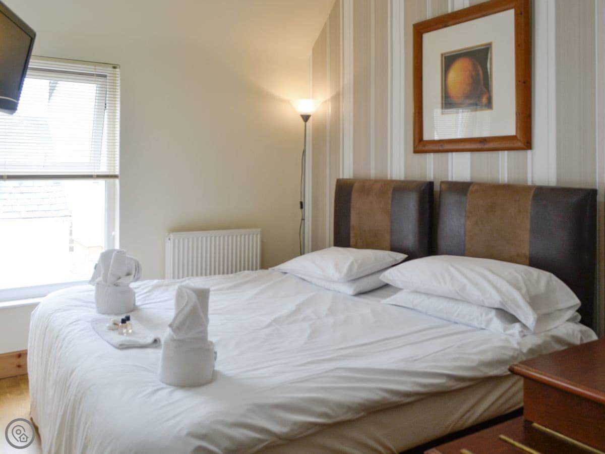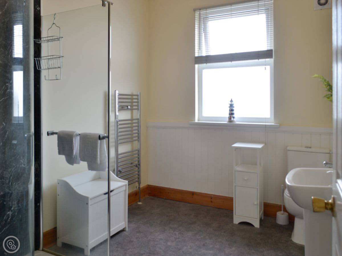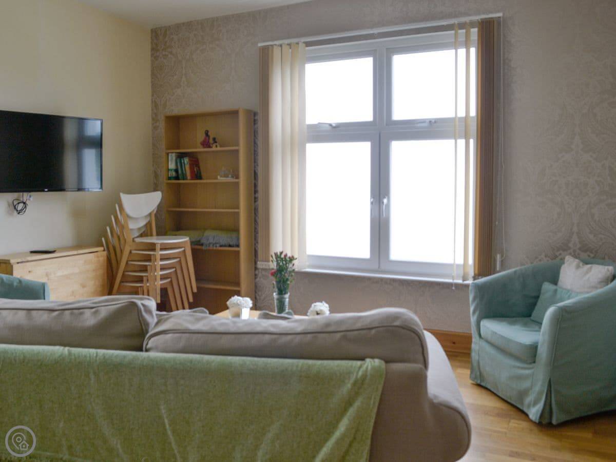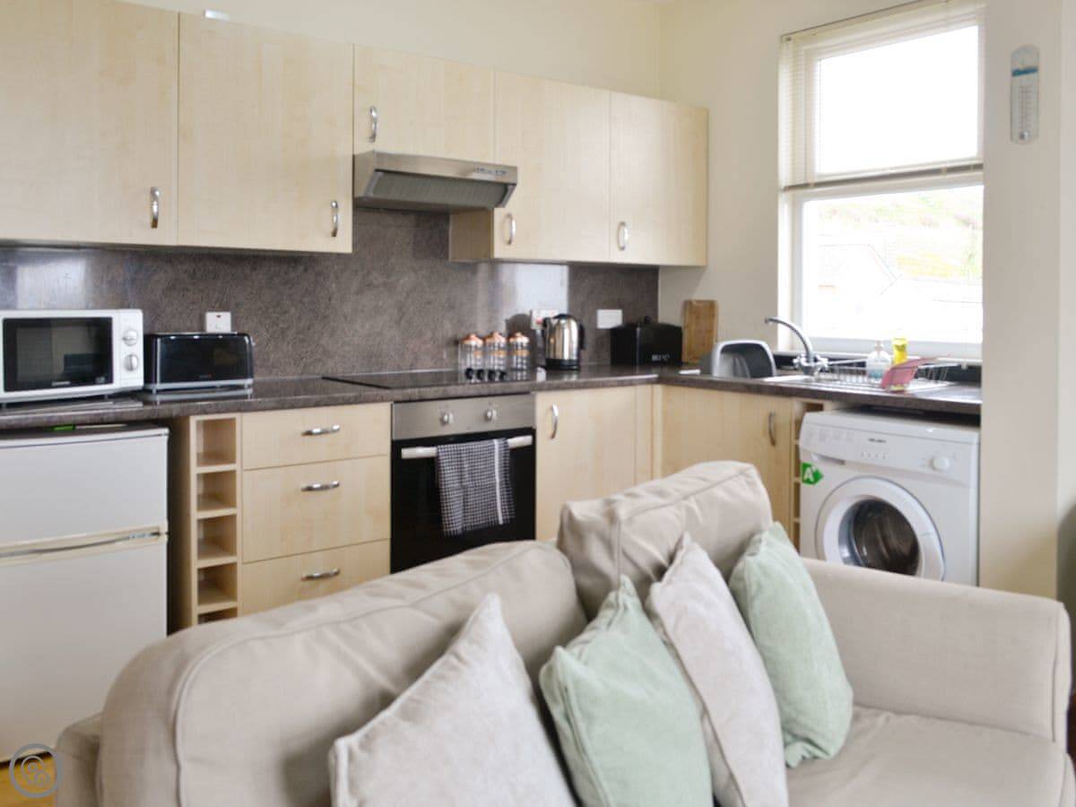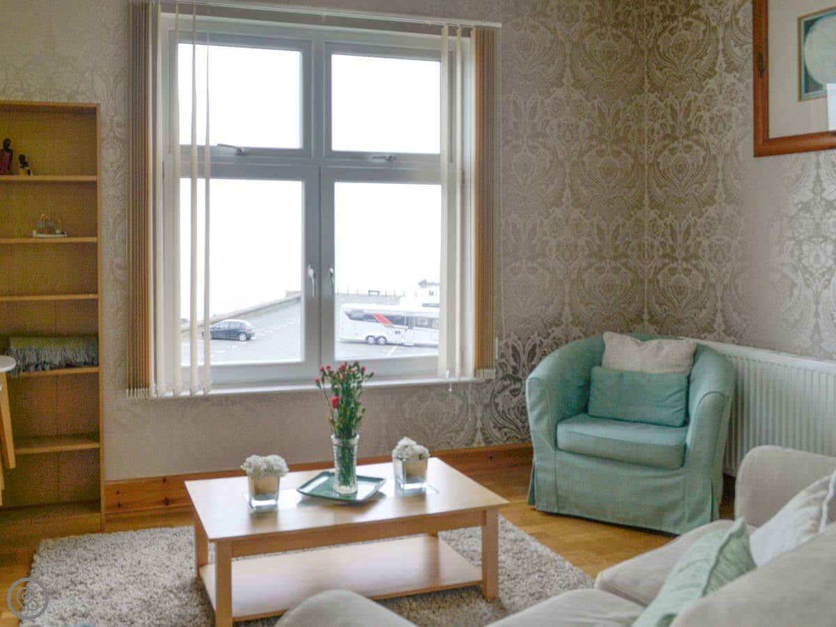 This is Antrim Coastline View in Portpatrick. It's a first-floor apartment, so you're up a flight of stairs. You're right at the quiet end of the village.