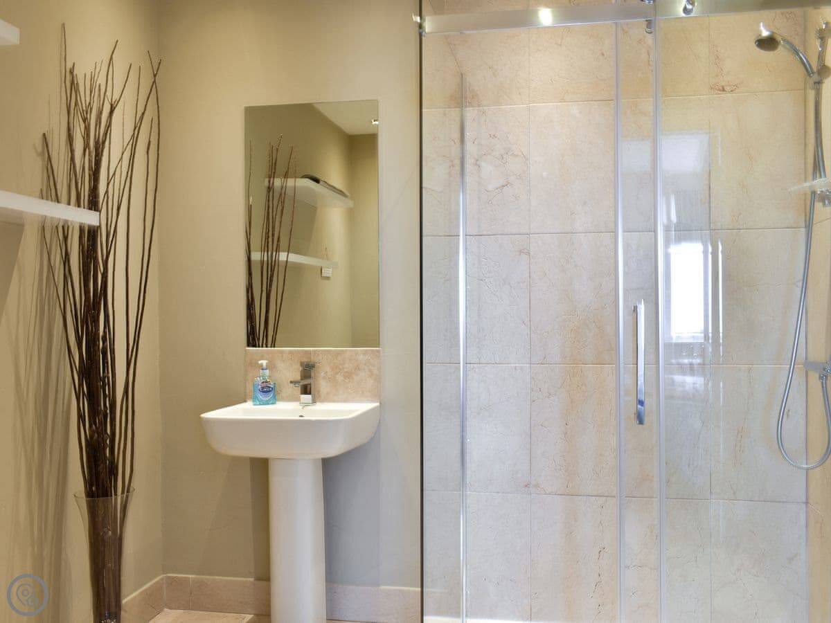 Inside, it's got what you'd need. Washing machine, dishwasher, WiFi, TV. Bedding and towels are included. There's a cot and a highchair if required. It's listed as having a wheelchair accessible entrance.