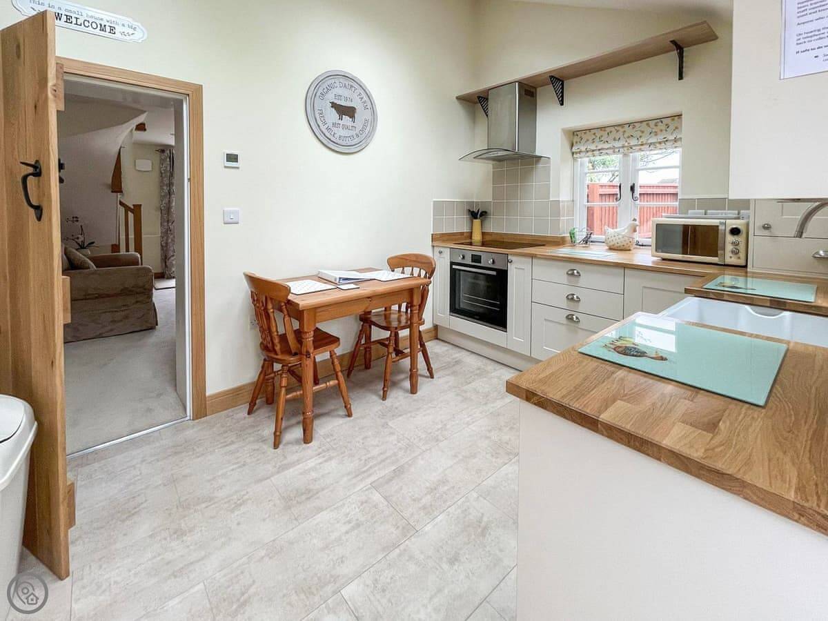 The Oaks is all on the first floor and has a double bedroom. The kitchen, living dining area is open plan and feels bright and spacious and is well equipped with everything you will need to cook a meal to enjoy together.