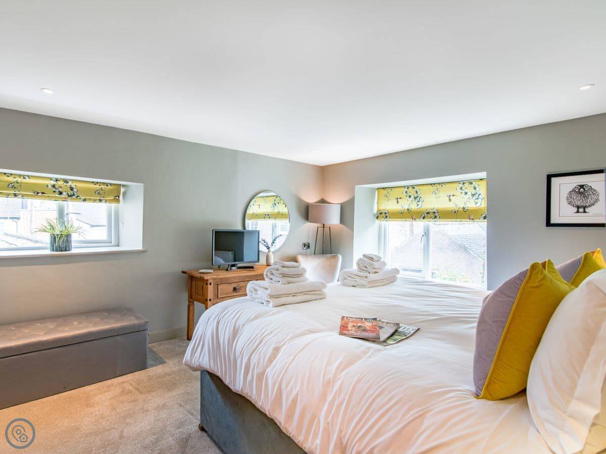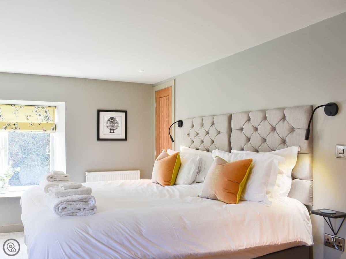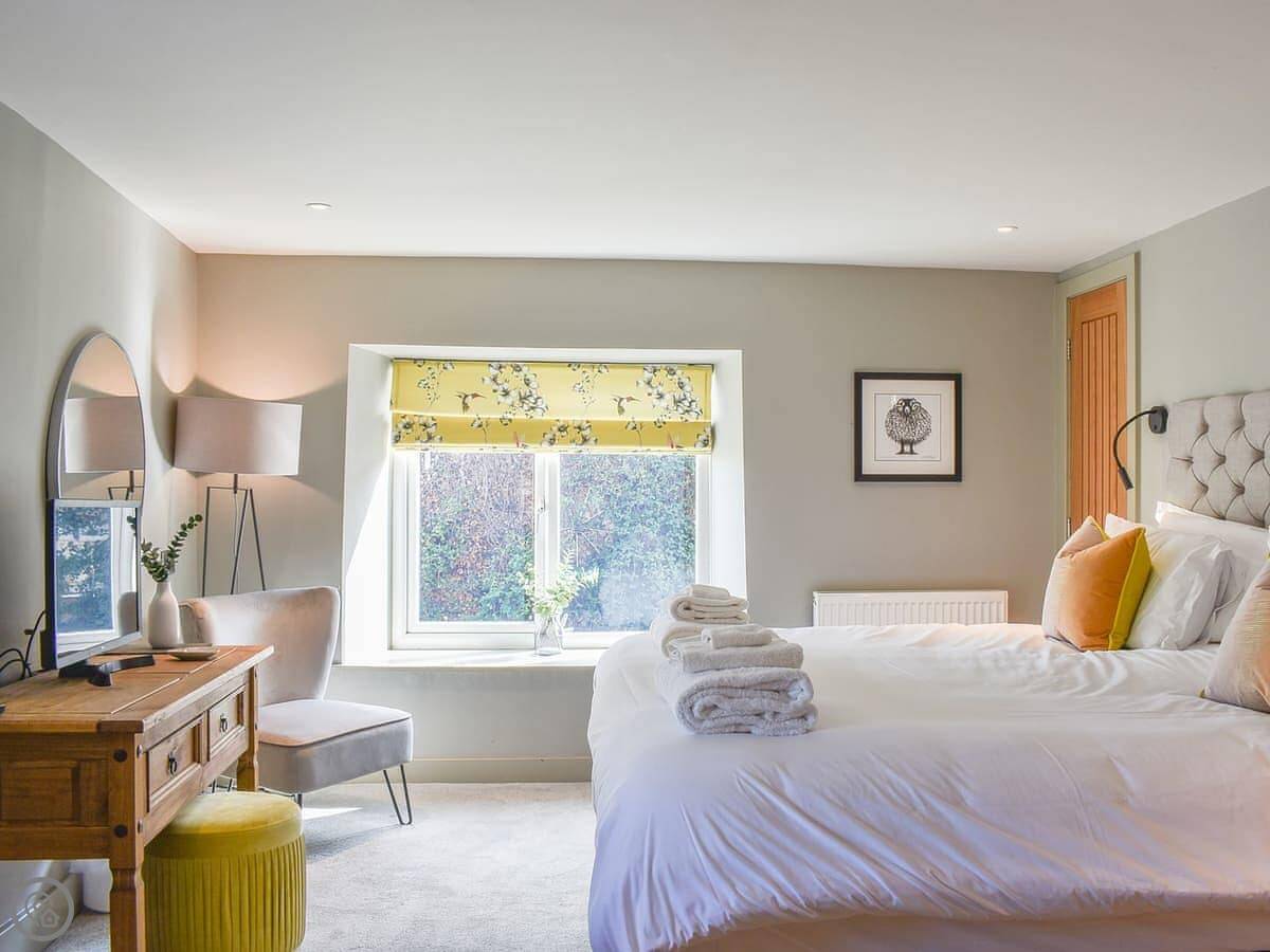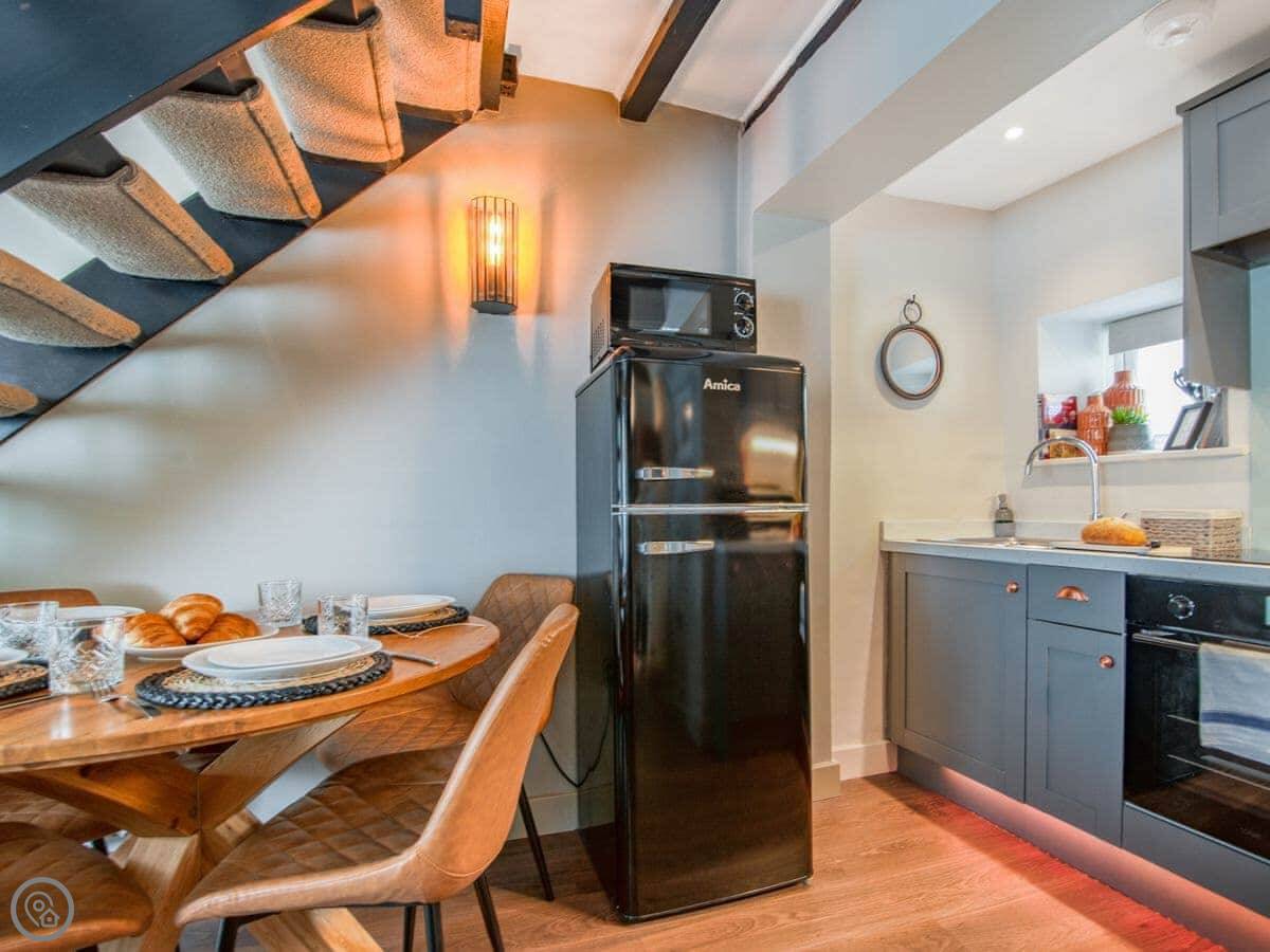 Step inside this boutique style cottage and you will find original features including beautiful wooden beams blending effortlessly with contemporary décor and accessories. A perfect social space with modern stove and Smart TV, perfect to return to and relax and chill after a day of exploring. A cosy dining space tucks under the staircase, and a compact shaker style kitchen is well-equipped with everything you need to rustle up a tasty brunch or supper. There’s even a handy Nespresso machine to make your morning brew! And so to bed…upstairs two beautiful bedrooms with plush carpets and tasteful furnishings, luxury linen and deep mattresses. To the first floor is a super kingsize zip and link bed which can be twin beds on request giving greater flexibility. It is decorated in relaxing hues of grey and lemon, with en-suite facilities underfloor heating. On the second floor is a kingsize bedroom, with vaulted ceiling and beams, a soothing decorative palette, built in wardrobe space and en-suite facilities and mood lighting. Outside is a raised seating area which catches the best of the afternoon sun and a welcome spot to enjoy a cup of Yorkshire tea after your day of exploring.