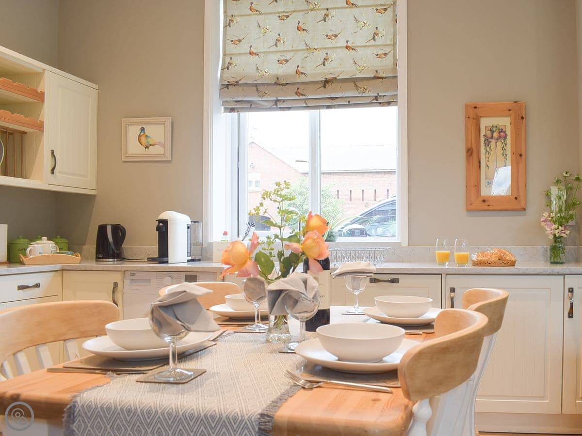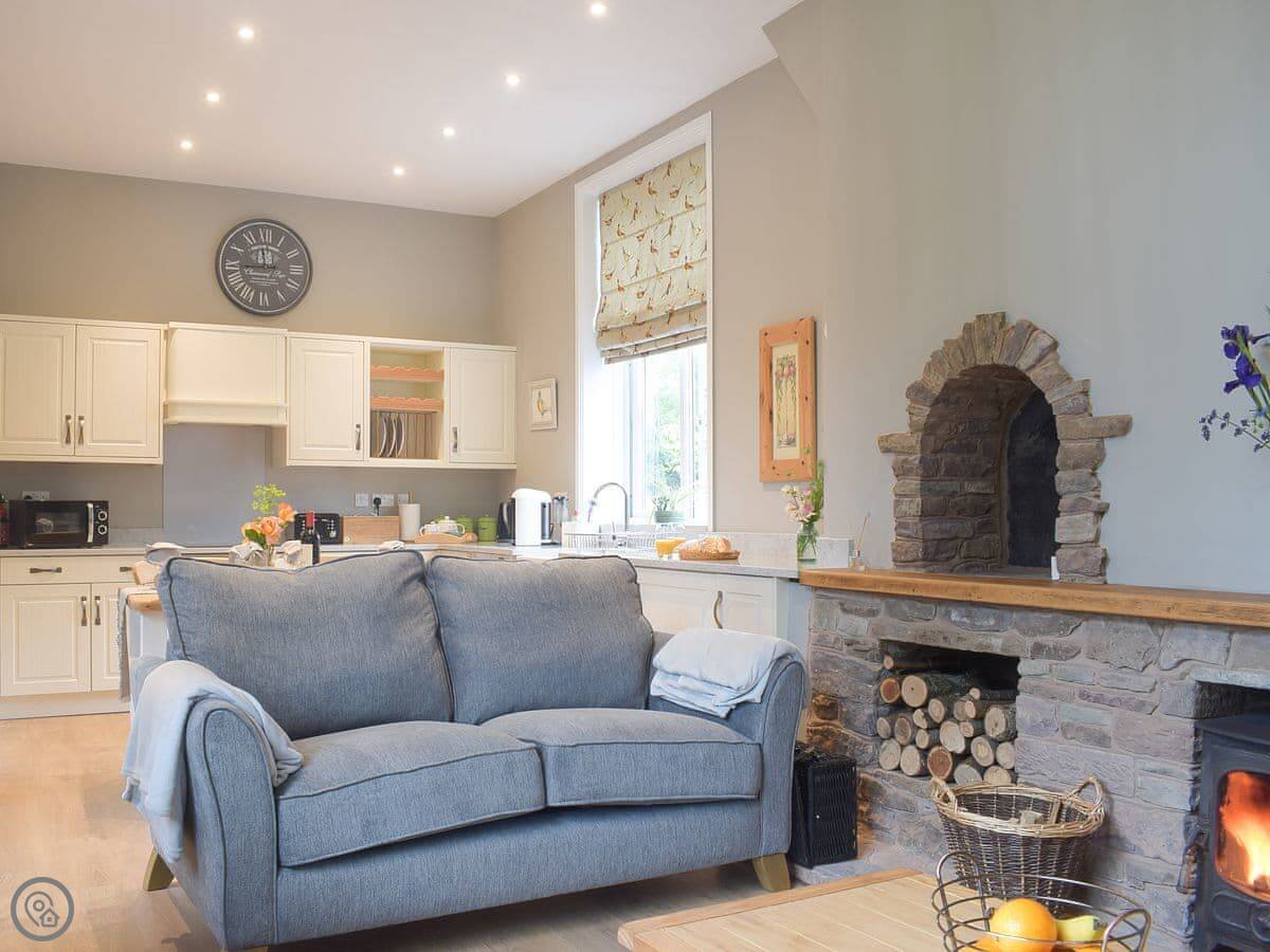 Inside, it's all open plan downstairs with a wood burner. The sun room is a nice spot, just chairs and a table looking out. Stairs are a standard flight.