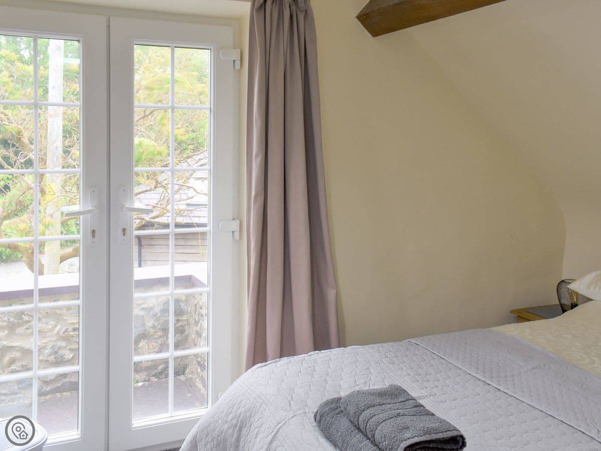 The master bedroom is on a half-landing and has a super king bed and its own shower room. The other two bedrooms are up another flight of stairs. One has a double and a single bed, with a private door to the garden stairs. The other is a double.