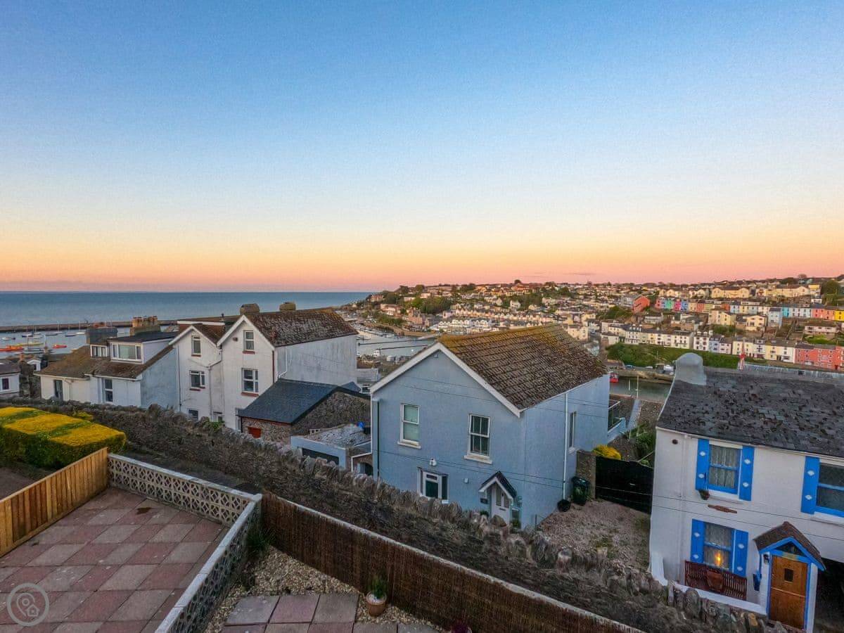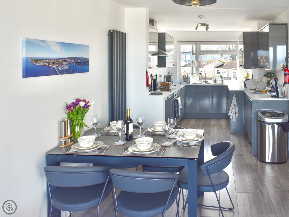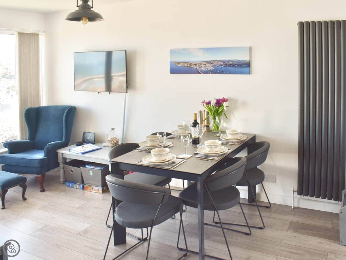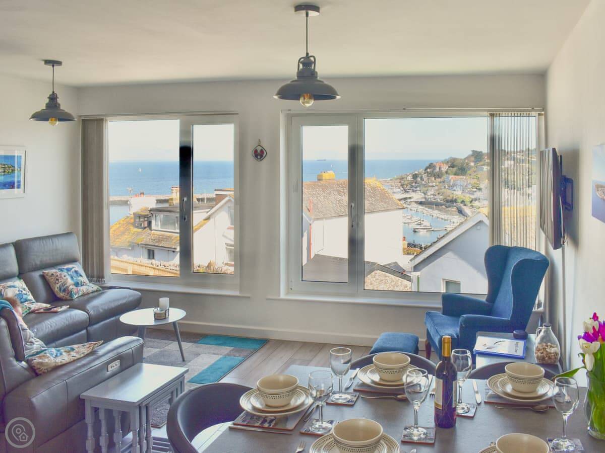 The living space is upstairs. It's open plan, so the kitchen, dining area, and sitting area are all in one room. That’s where the view is. You can see right over the rooftops to the harbour and the sea. It’s a good spot to sit.