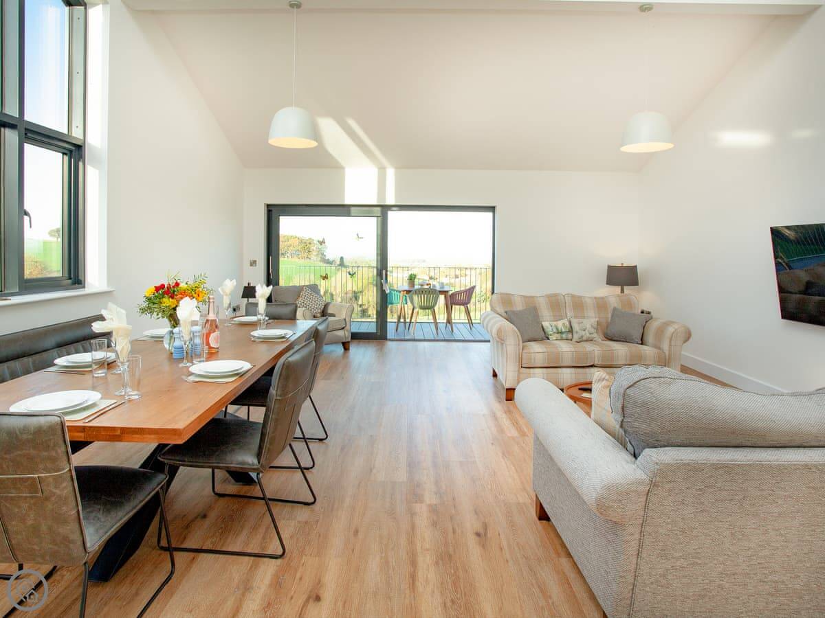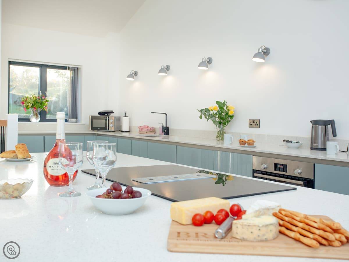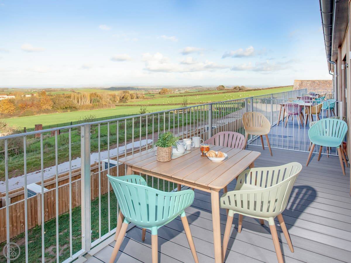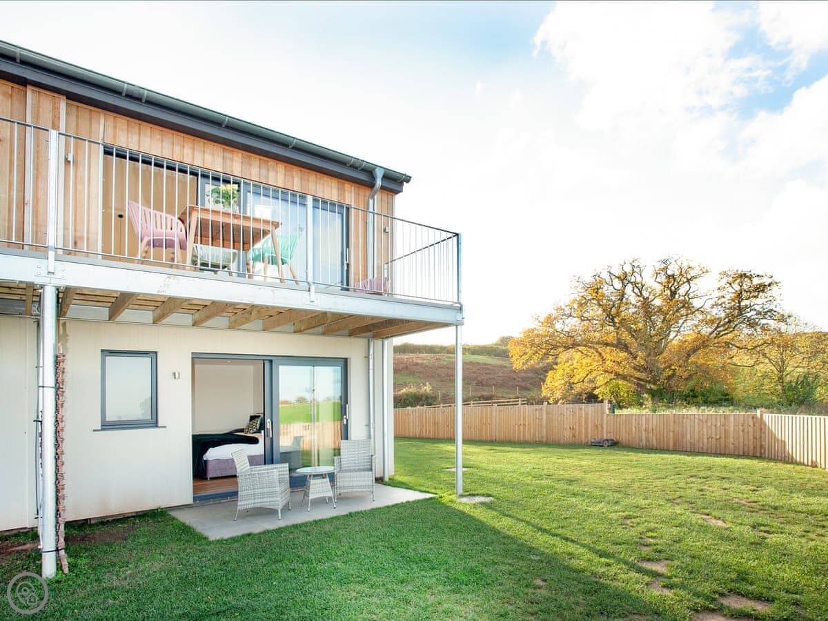 The layout is upside-down. The bedrooms are on the ground floor. You live upstairs in the big open-plan kitchen and living area. The reason for that is the view. You can see right out over the fields to the coast. On a good day, you can see Glastonbury Tor in the distance. There are doors out to a balcony from the living area.
