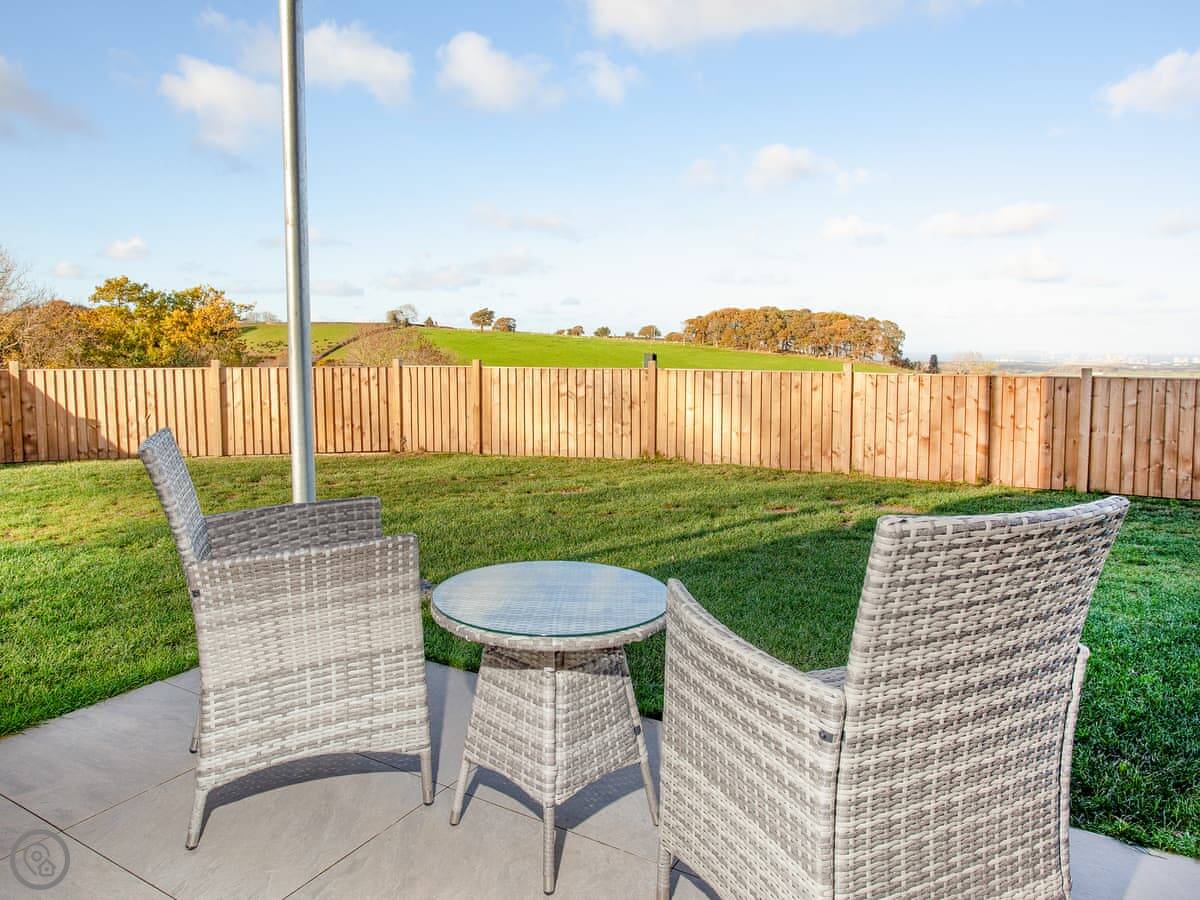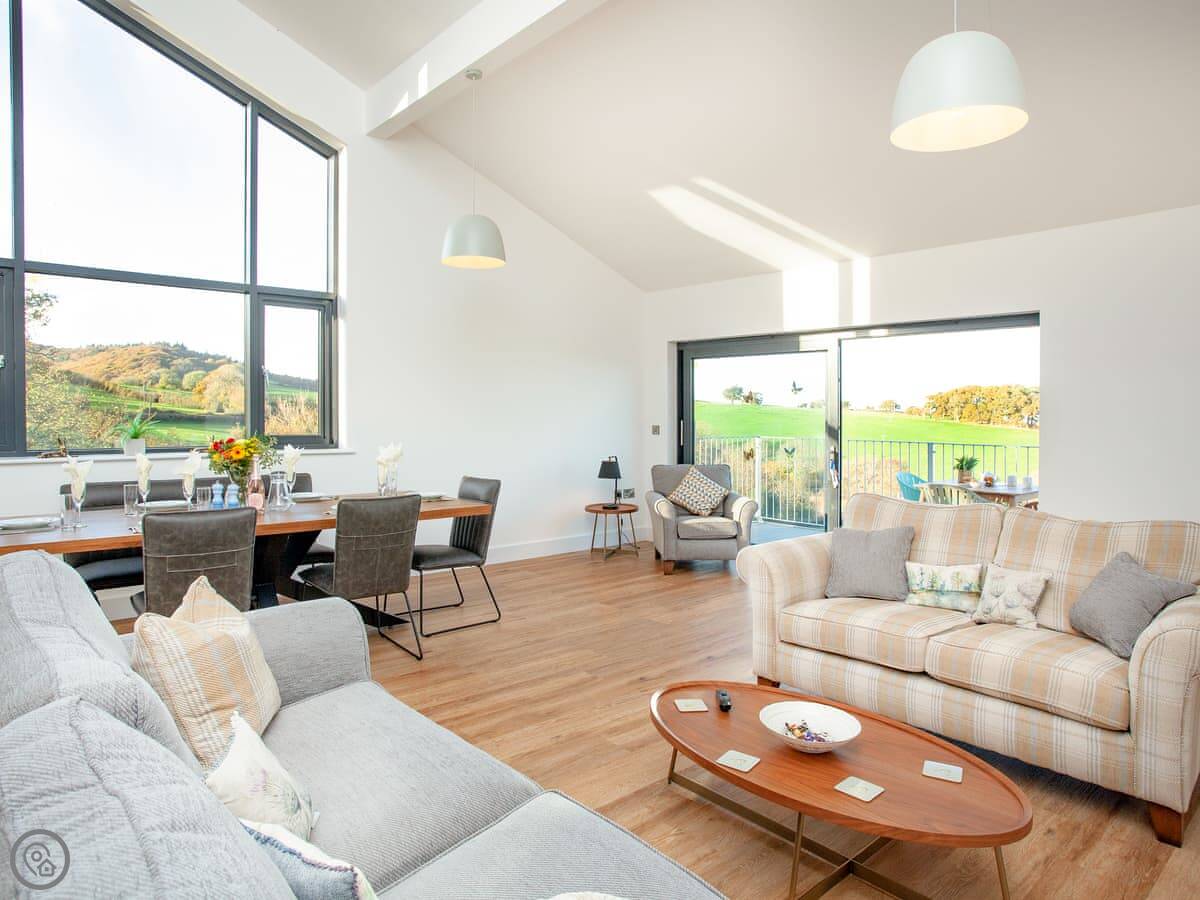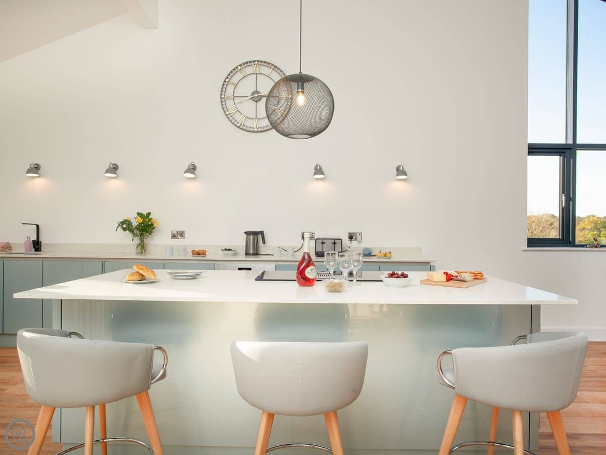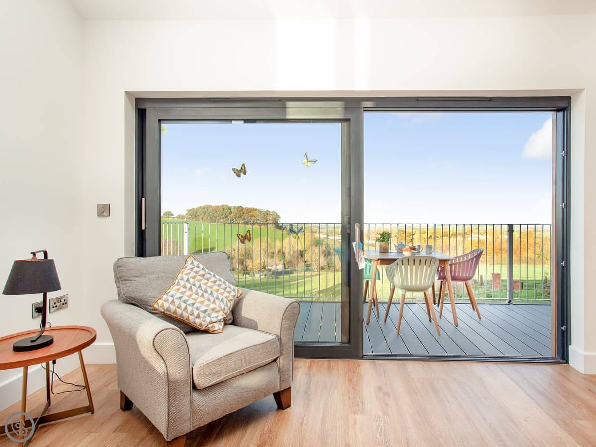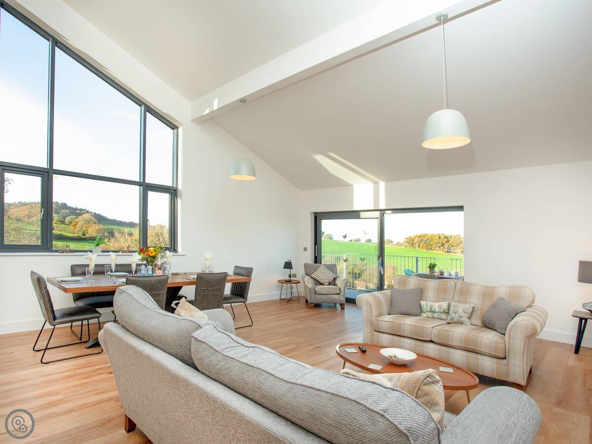 The layout is upside-down. The bedrooms are on the ground floor. You live upstairs in the big open-plan kitchen and living area. The reason for that is the view. You can see right out over the fields to the coast. On a good day, you can see Glastonbury Tor in the distance. There are doors out to a balcony from the living area.