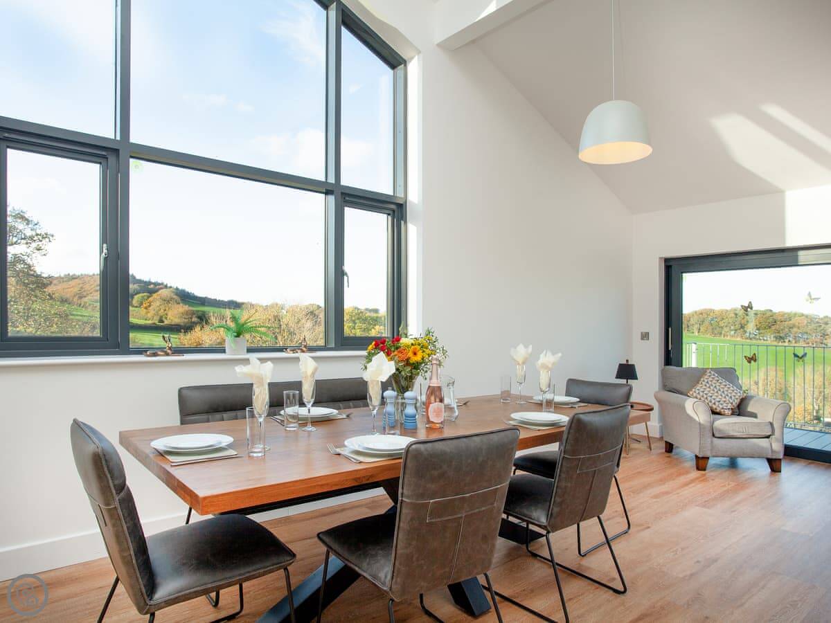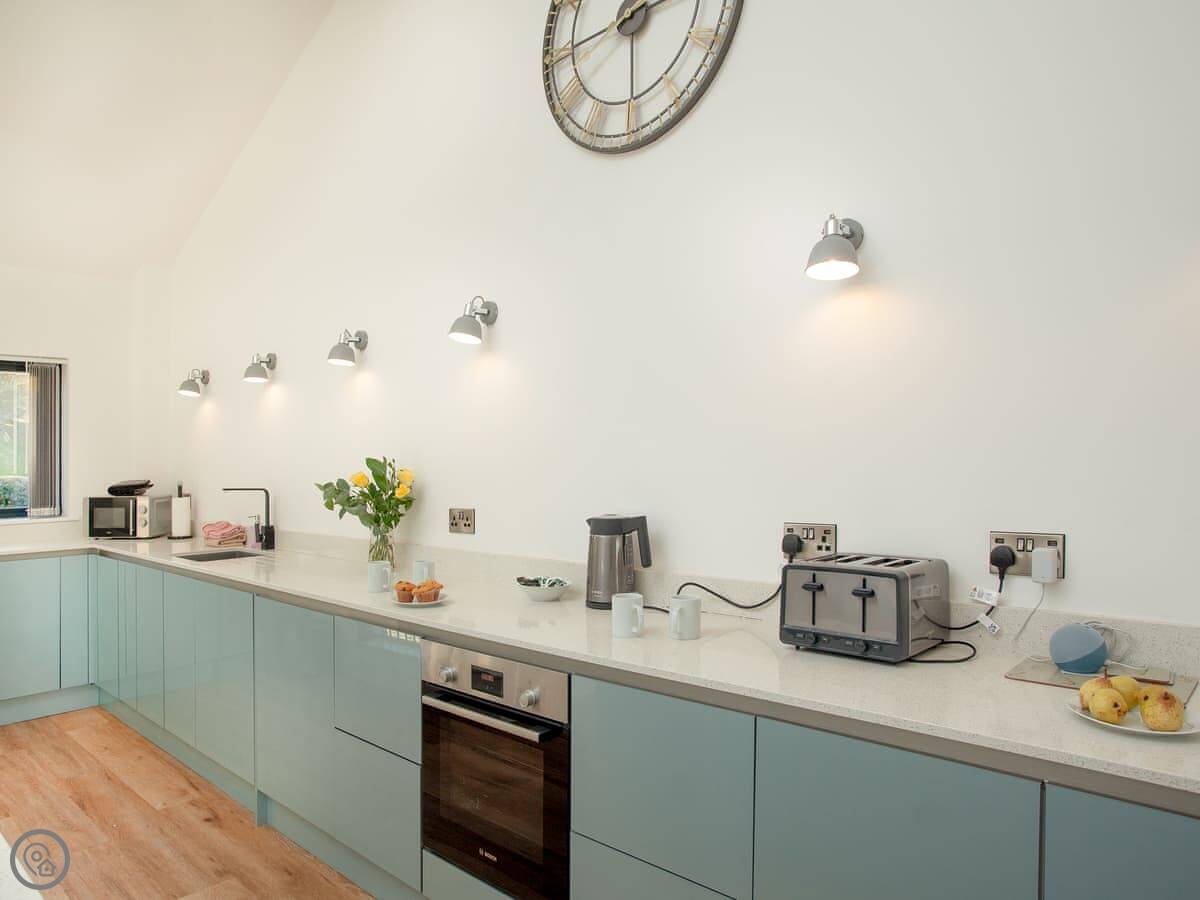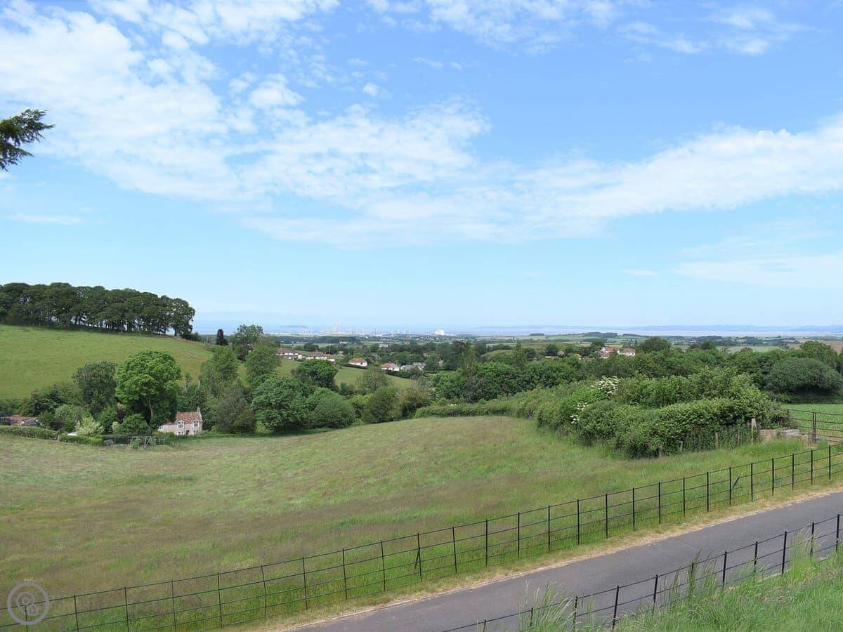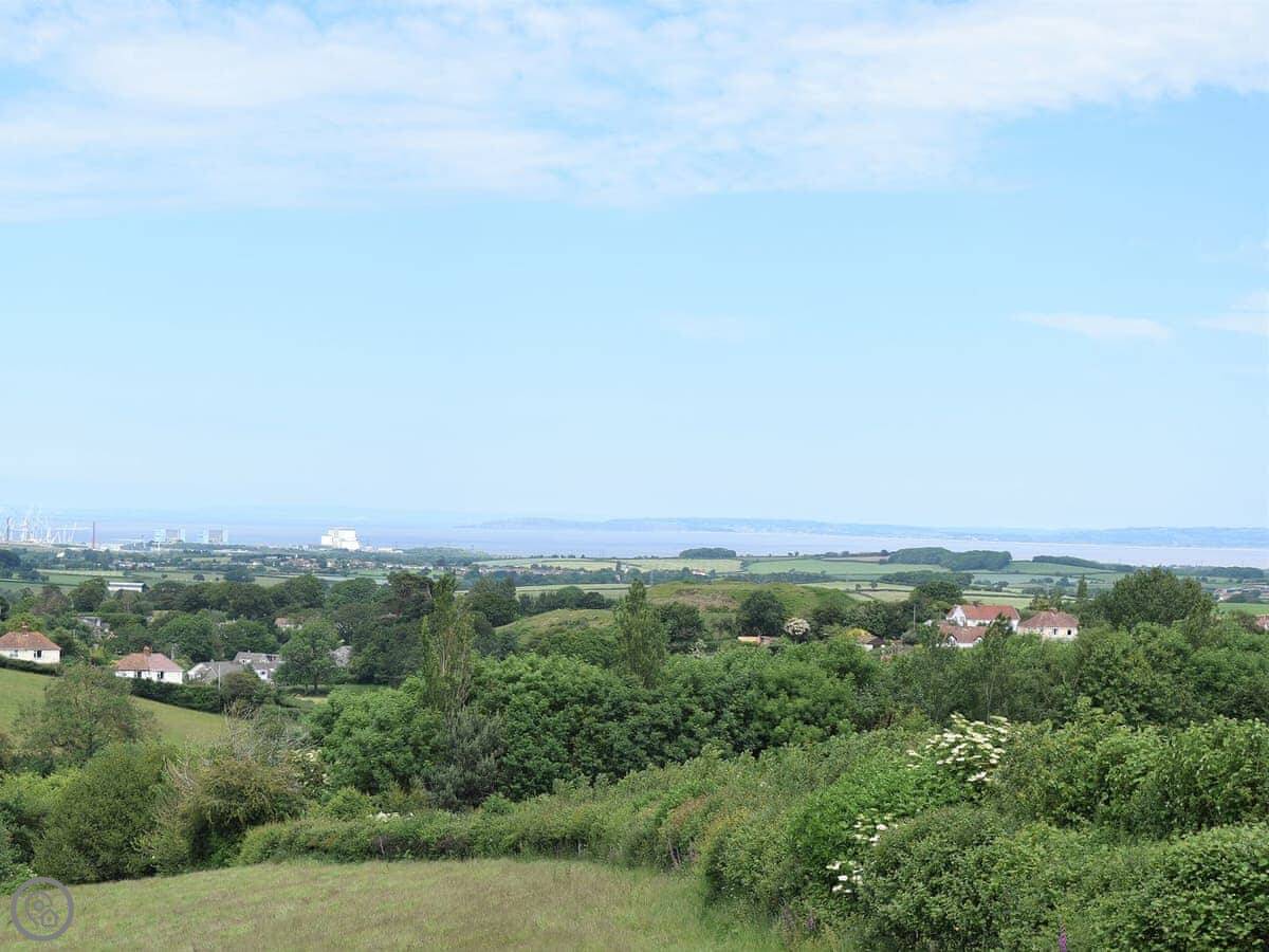 The layout is upside-down. The bedrooms are on the ground floor. You live upstairs in the big open-plan kitchen and living area. The reason for that is the view. You can see right out over the fields to the coast. On a good day, you can see Glastonbury Tor in the distance. There are doors out to a balcony from the living area.
