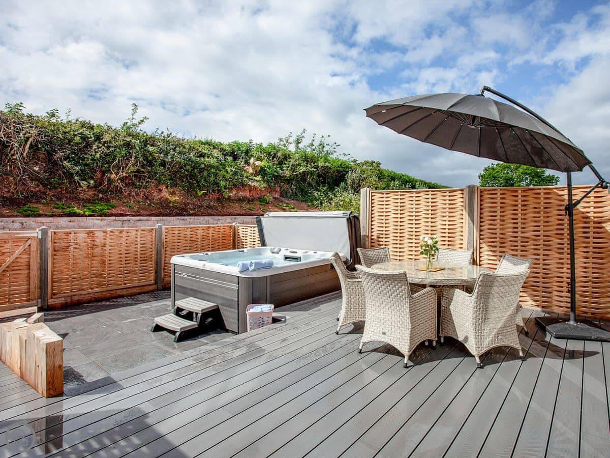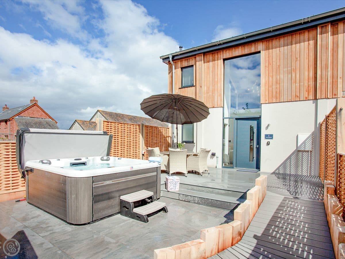 Downstairs, there's an enclosed garden that's just for you. It's got a hot tub, outdoor seating, and a barbecue.