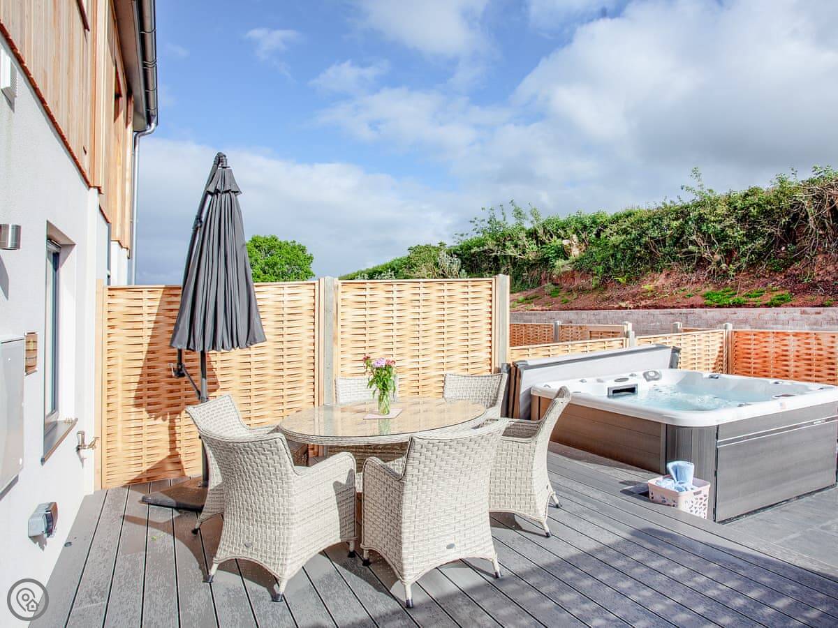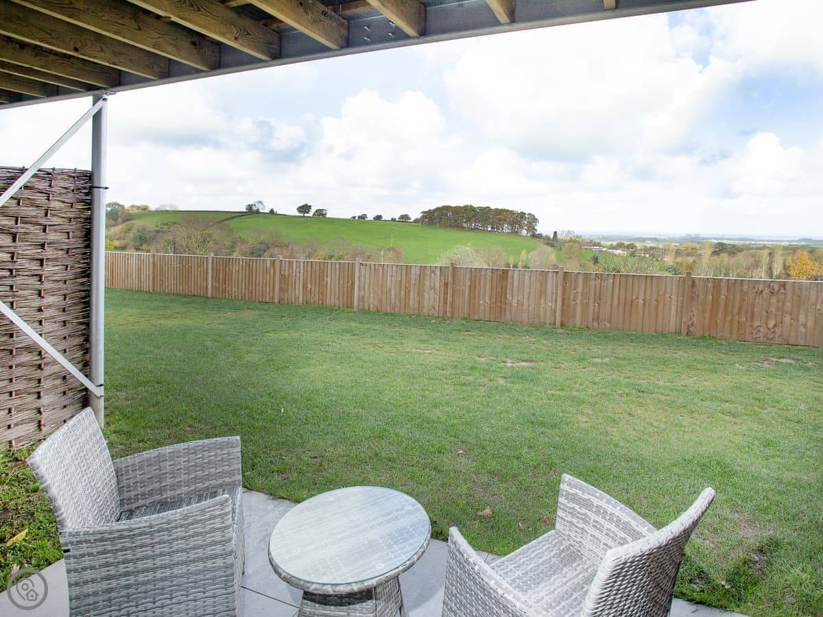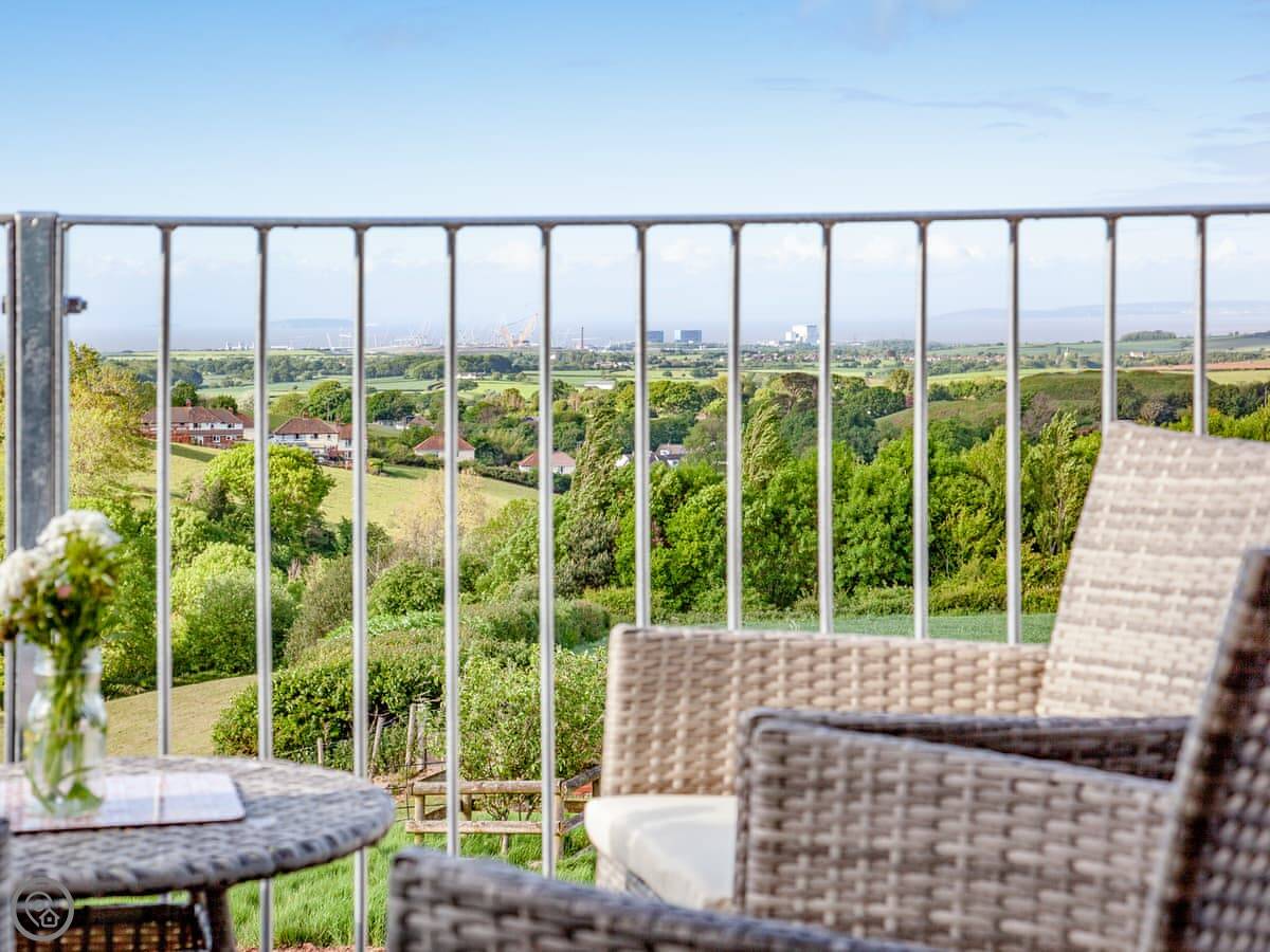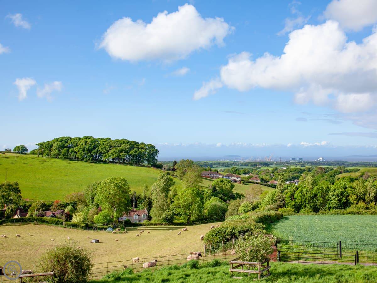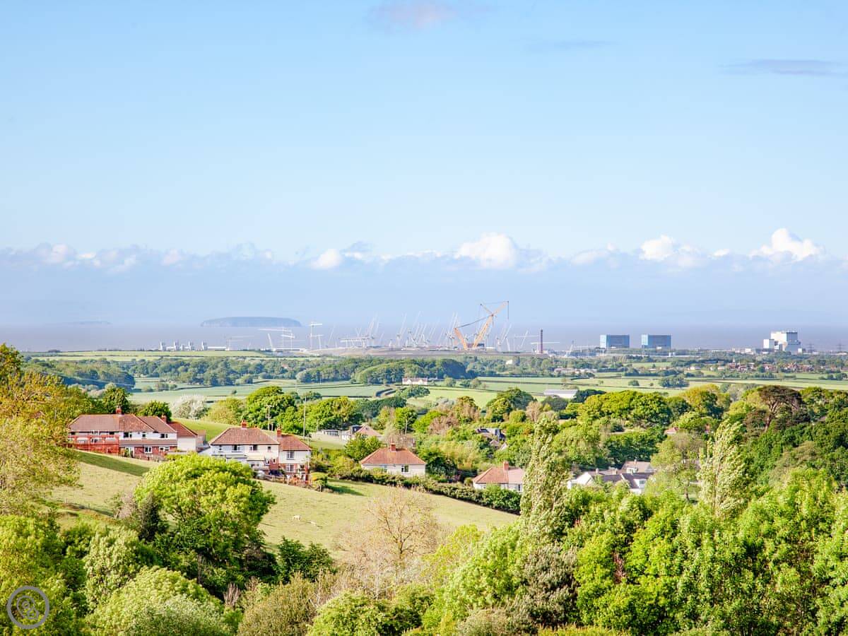 The kitchen, living and dining area is upstairs. That's to make the most of the view. You can see the Somerset coast from there, and on a very clear day you can see Glastonbury Tor in the distance. Doors lead out to a balcony. The garden is enclosed, with outdoor seating, a barbecue, and a private hot tub.