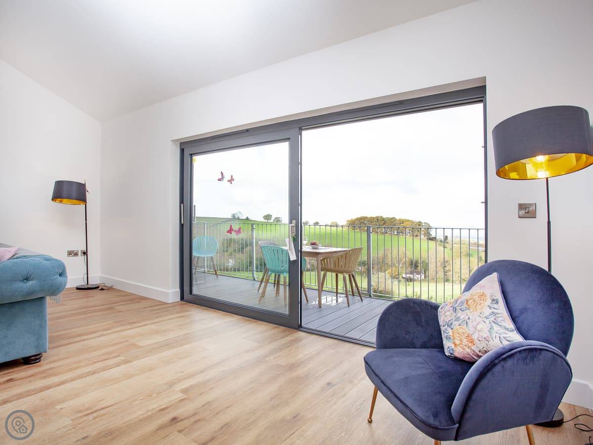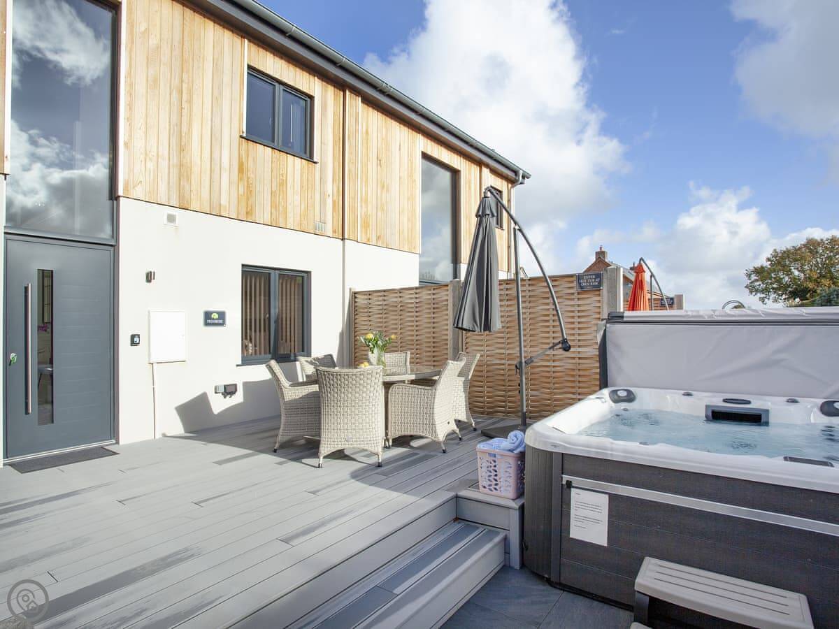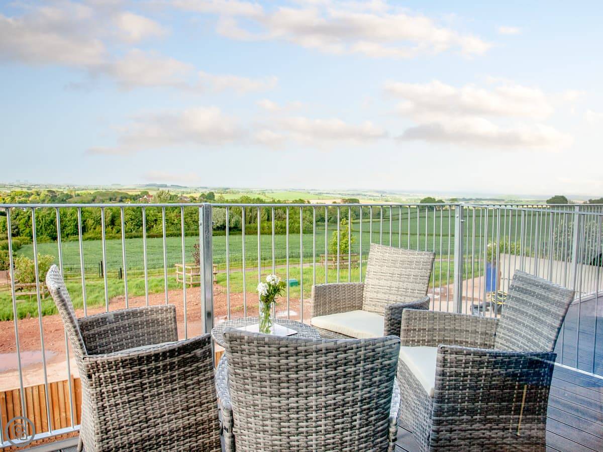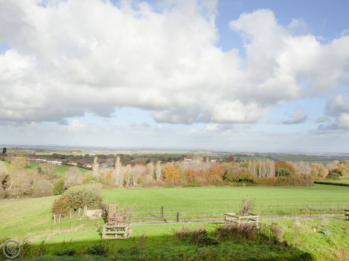 The kitchen, living and dining area is upstairs. That's to make the most of the view. You can see the Somerset coast from there, and on a very clear day you can see Glastonbury Tor in the distance. Doors lead out to a balcony. The garden is enclosed, with outdoor seating, a barbecue, and a private hot tub.