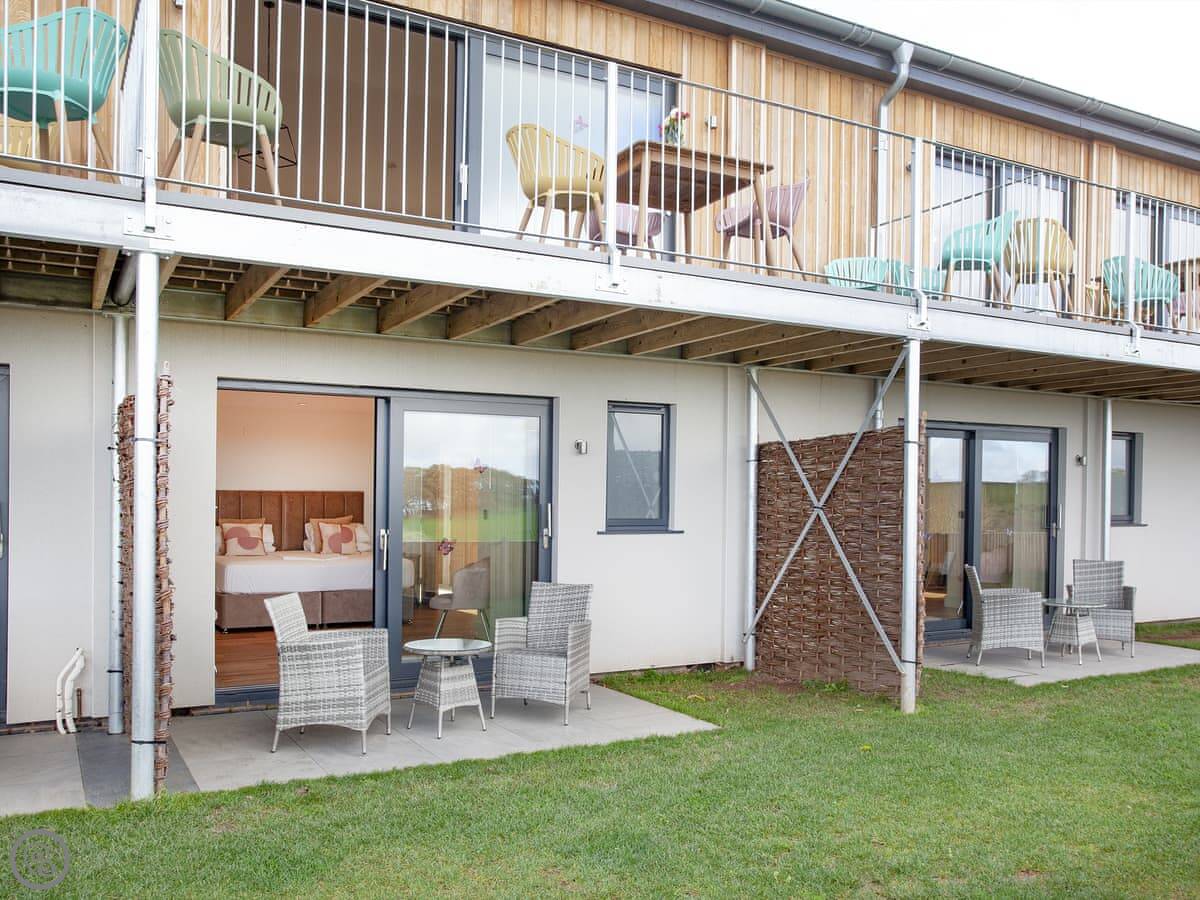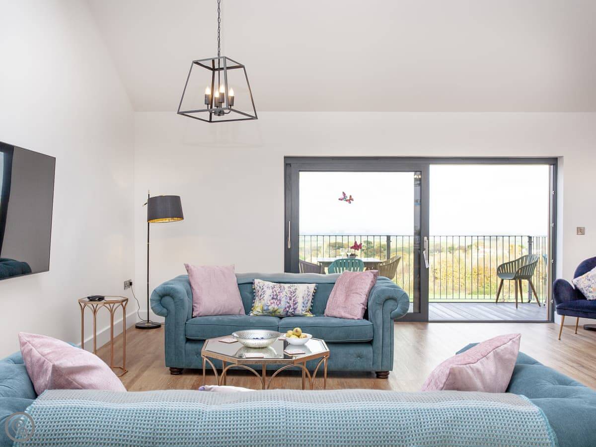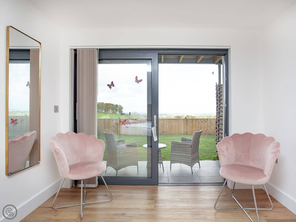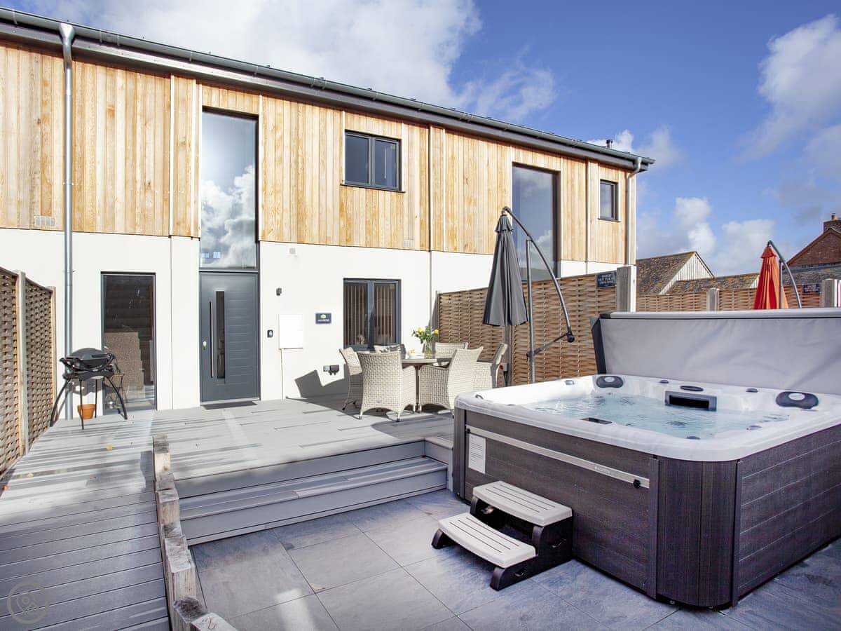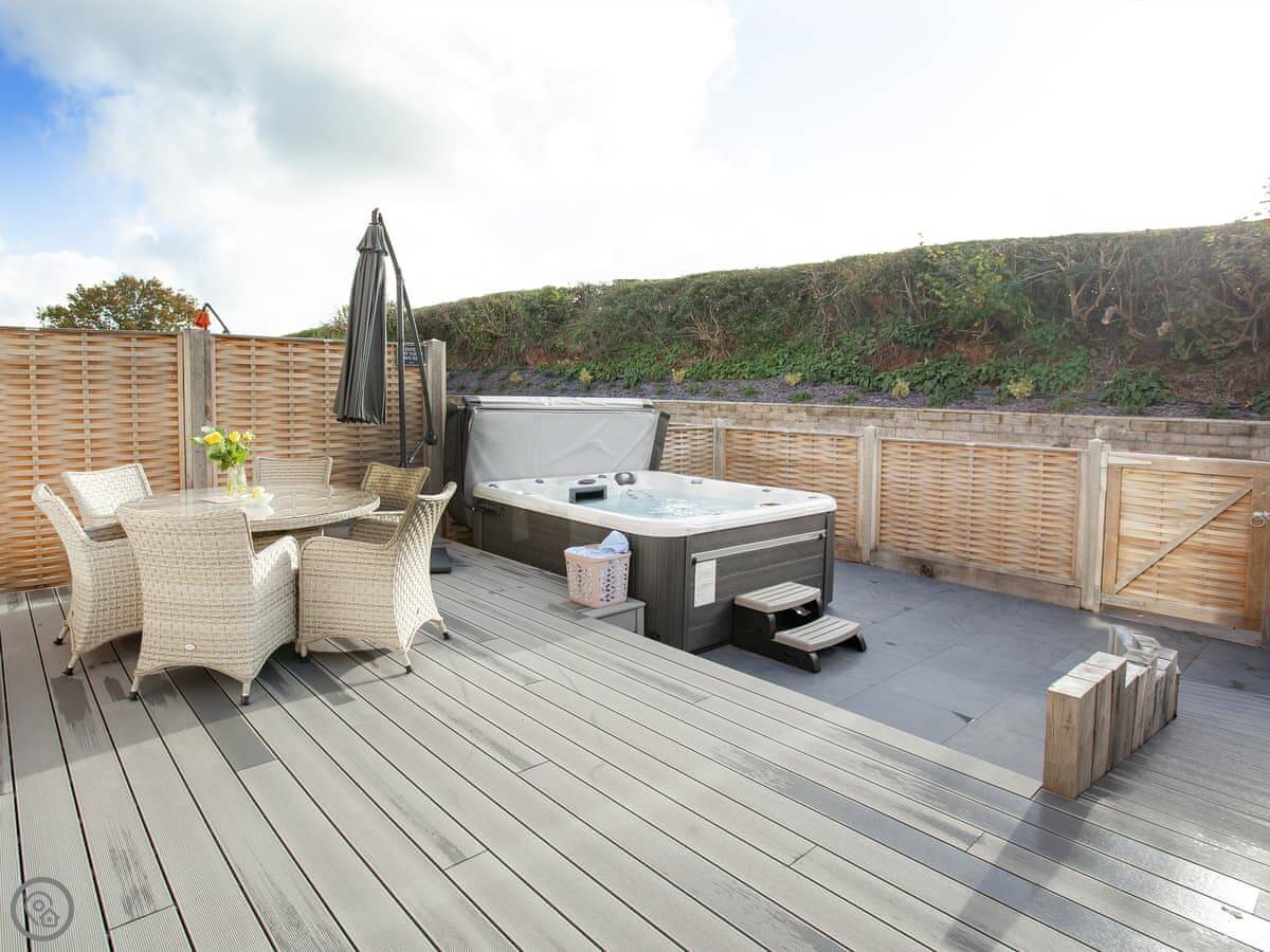 The kitchen, living and dining area is upstairs. That's to make the most of the view. You can see the Somerset coast from there, and on a very clear day you can see Glastonbury Tor in the distance. Doors lead out to a balcony. The garden is enclosed, with outdoor seating, a barbecue, and a private hot tub.