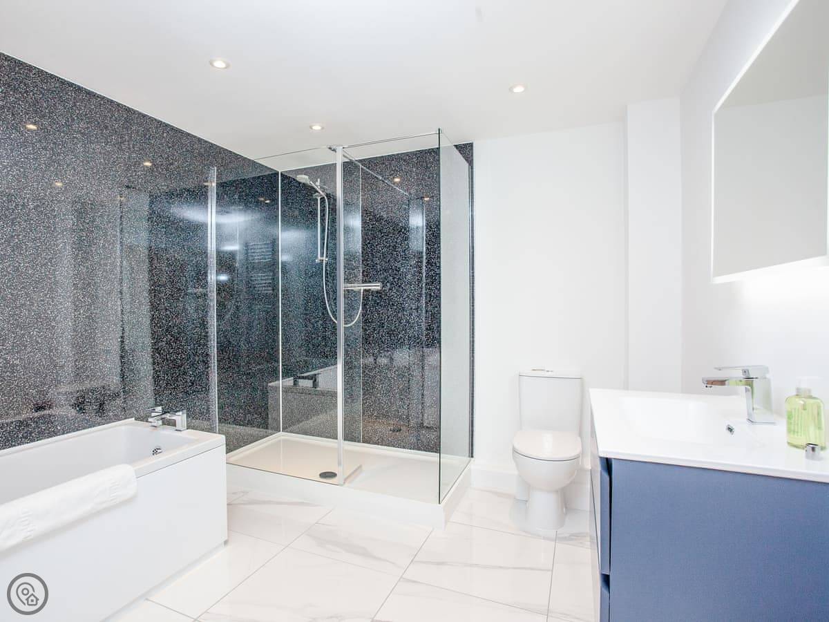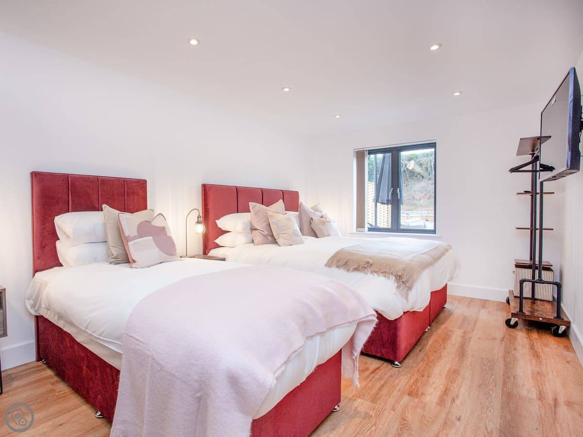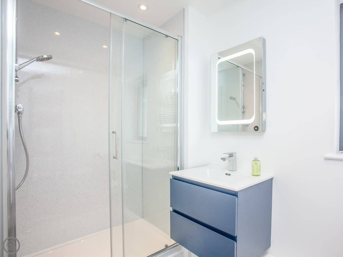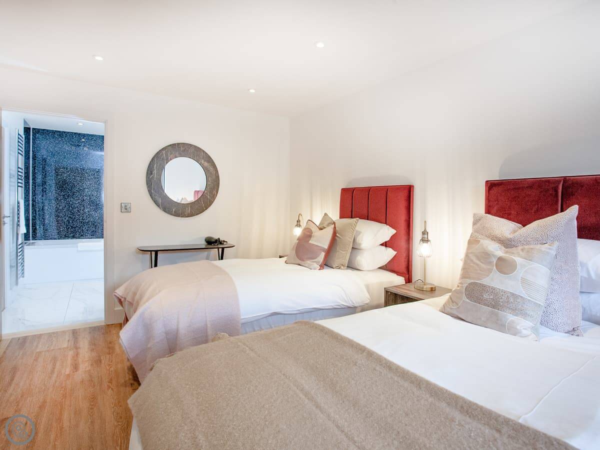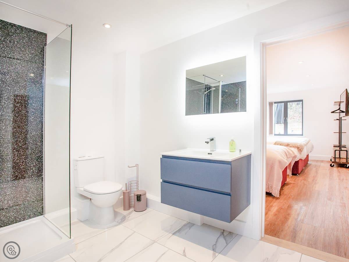 It sleeps five. Two bedrooms, both on the ground floor. They've got zip-and-link super king beds, so you can have them as twins if you prefer. One bedroom has an ensuite shower. There's also a single bed in the second bedroom. Another full bathroom with a bath and a shower sits between that bedroom and the hall.