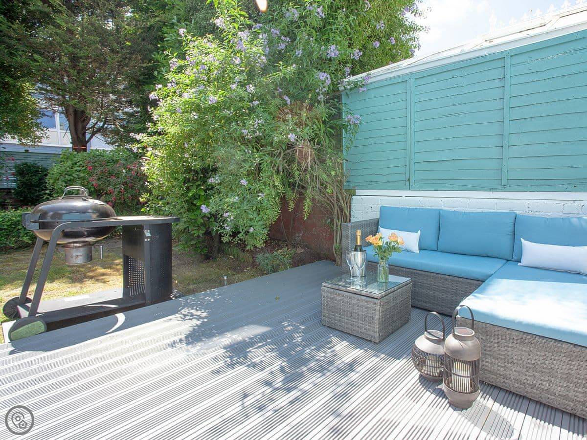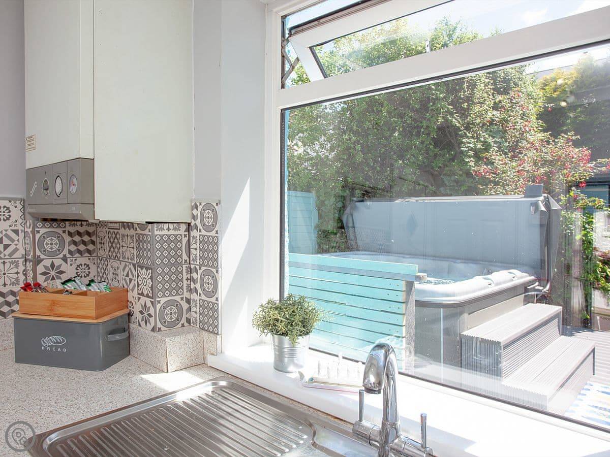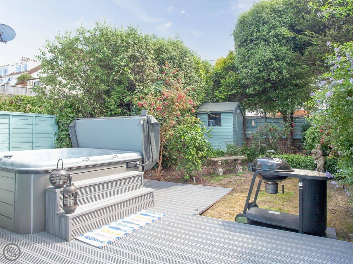 Downstairs, there's a kitchen and a living/dining area that leads out to the garden. The garden is enclosed. It's part decking with a hot tub and BBQ, and part lawn. It gets the sun in the evening.