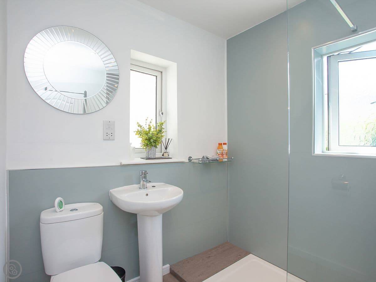 One bedroom has a kingsize bed. Another has a double and a pull-out single bed. The third has bunk beds and is a good size for kids. There's one family bathroom upstairs with a walk-in shower.