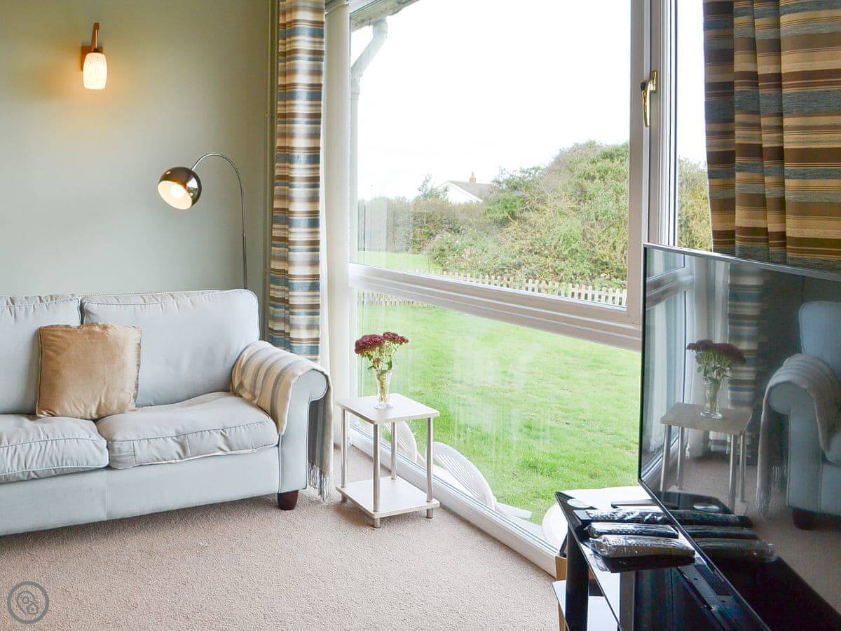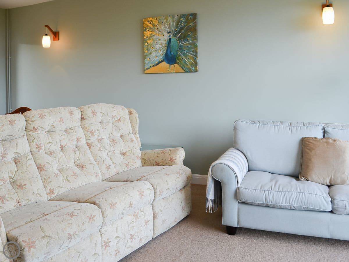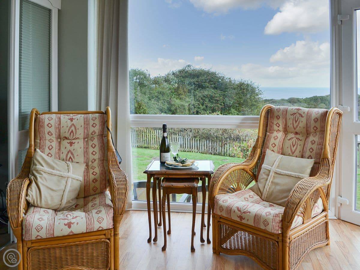 The living room has those sea views. There's a sun room off the kitchen with more seating. The sofas are arranged to face the window. One of them is a sofa bed, which is where the extra two people would sleep.