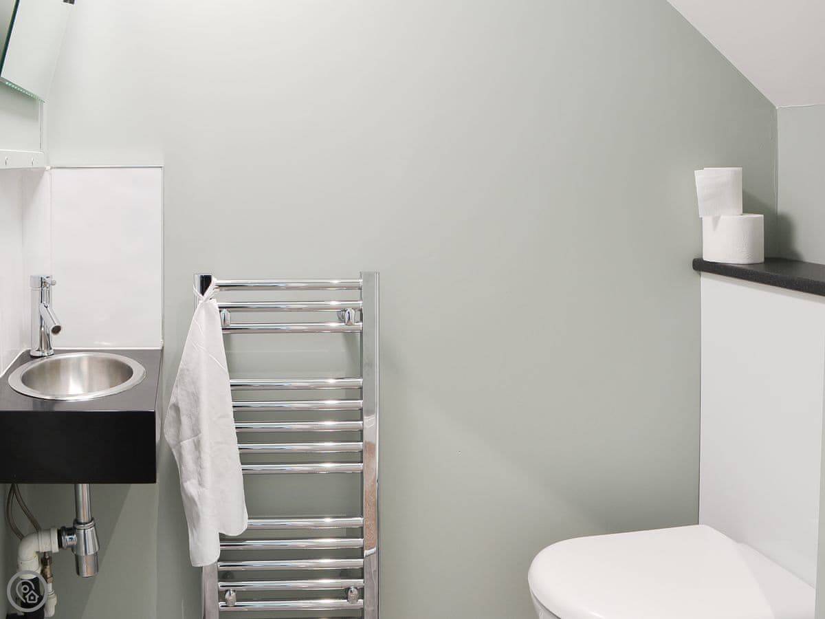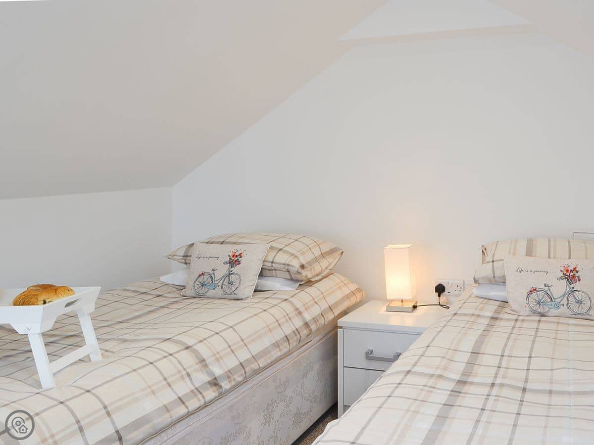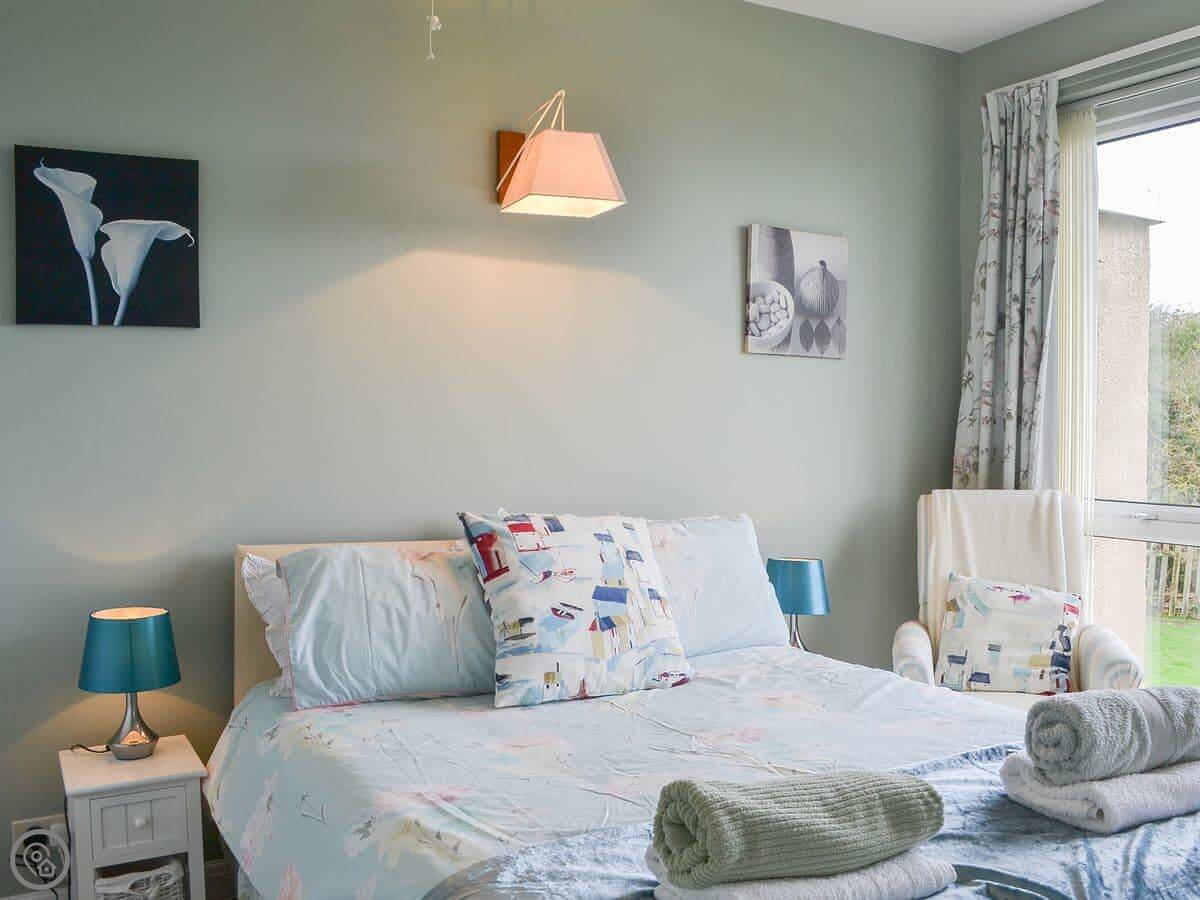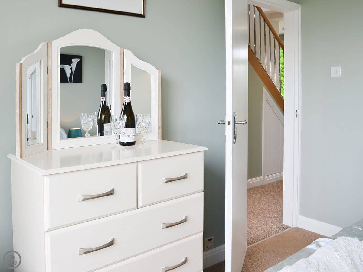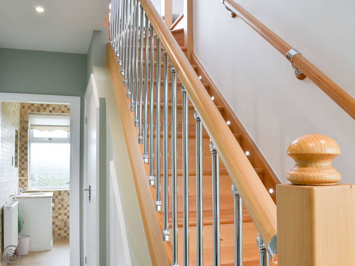 It sleeps six. There are three bedrooms and two bathrooms. Two of the bedrooms and the main bathroom are downstairs. One double bedroom with its own ensuite is upstairs. It's got a 4 Star rating. The stairs to the first floor are glass panelled and a bit steep, just so you know.