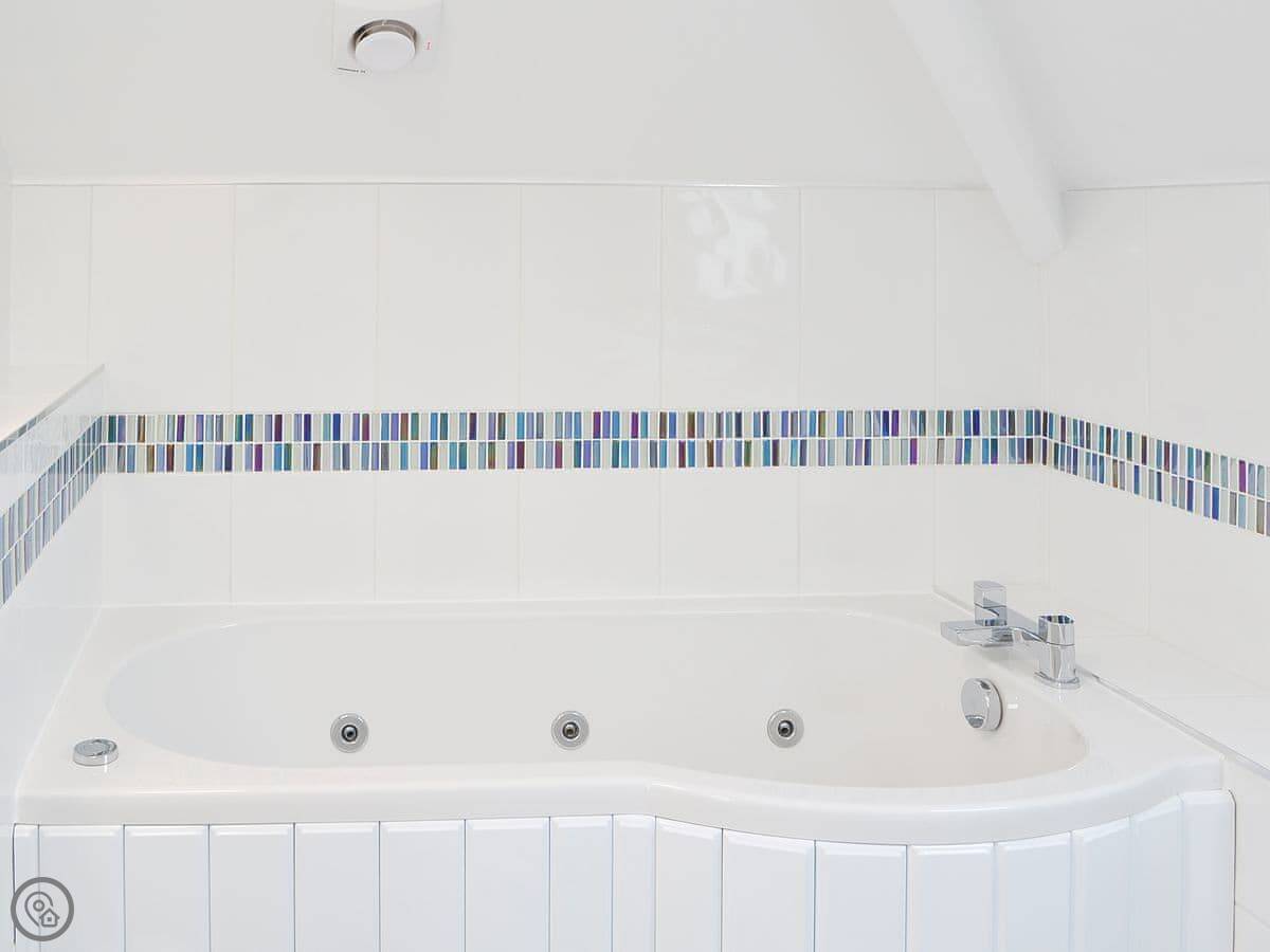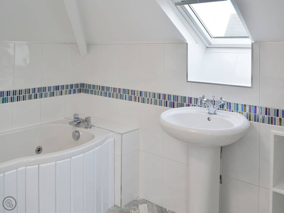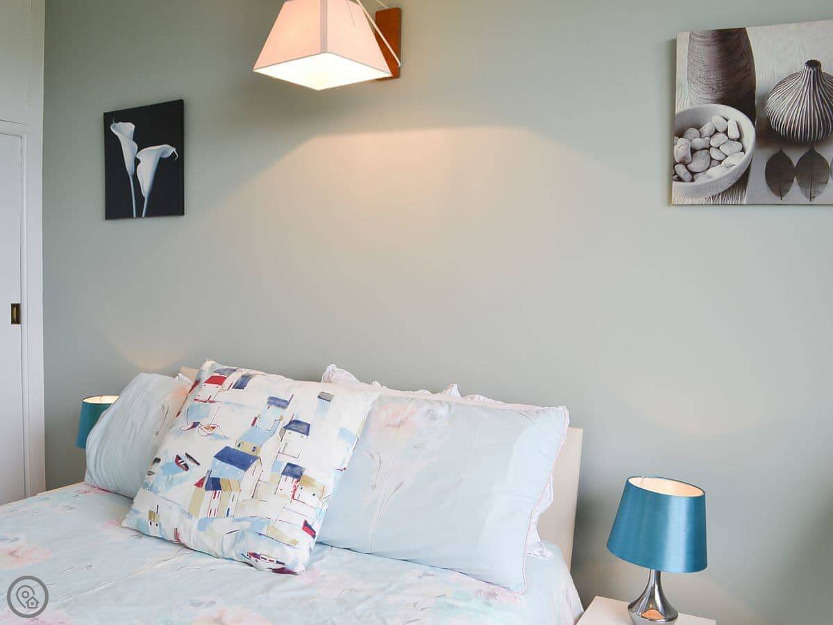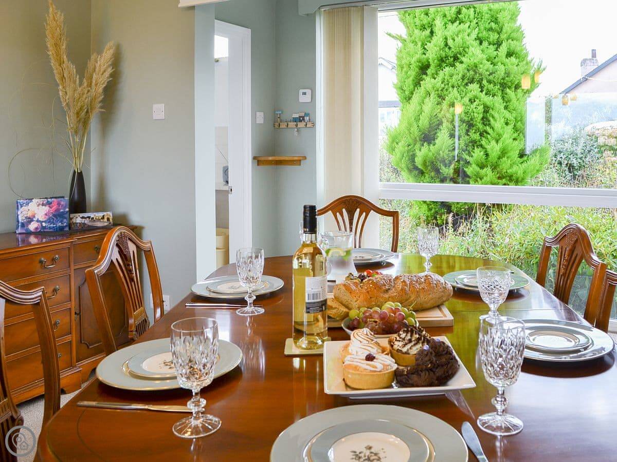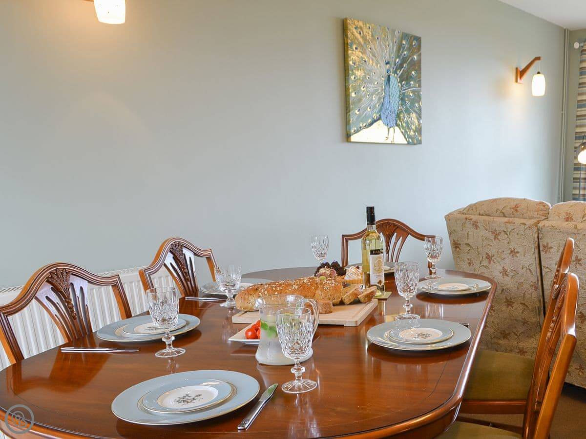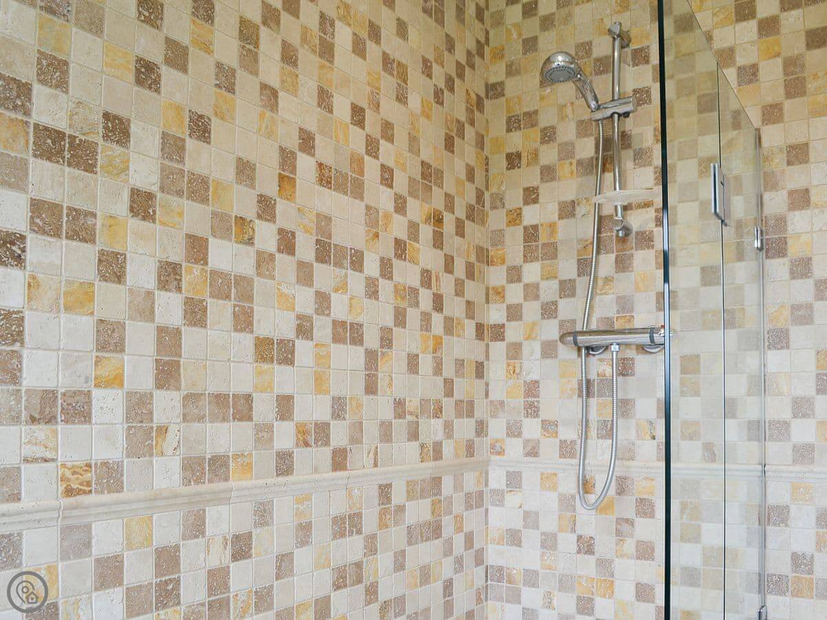 It sleeps six. There are three bedrooms and two bathrooms. Two of the bedrooms and the main bathroom are downstairs. One double bedroom with its own ensuite is upstairs. It's got a 4 Star rating. The stairs to the first floor are glass panelled and a bit steep, just so you know.