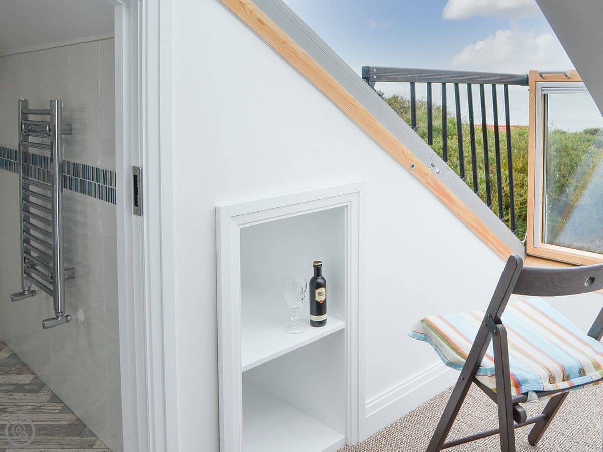 Upstairs, the main bedroom has a vaulted ceiling and a small, private balcony you can step out onto. The door to the ensuite is quite low.