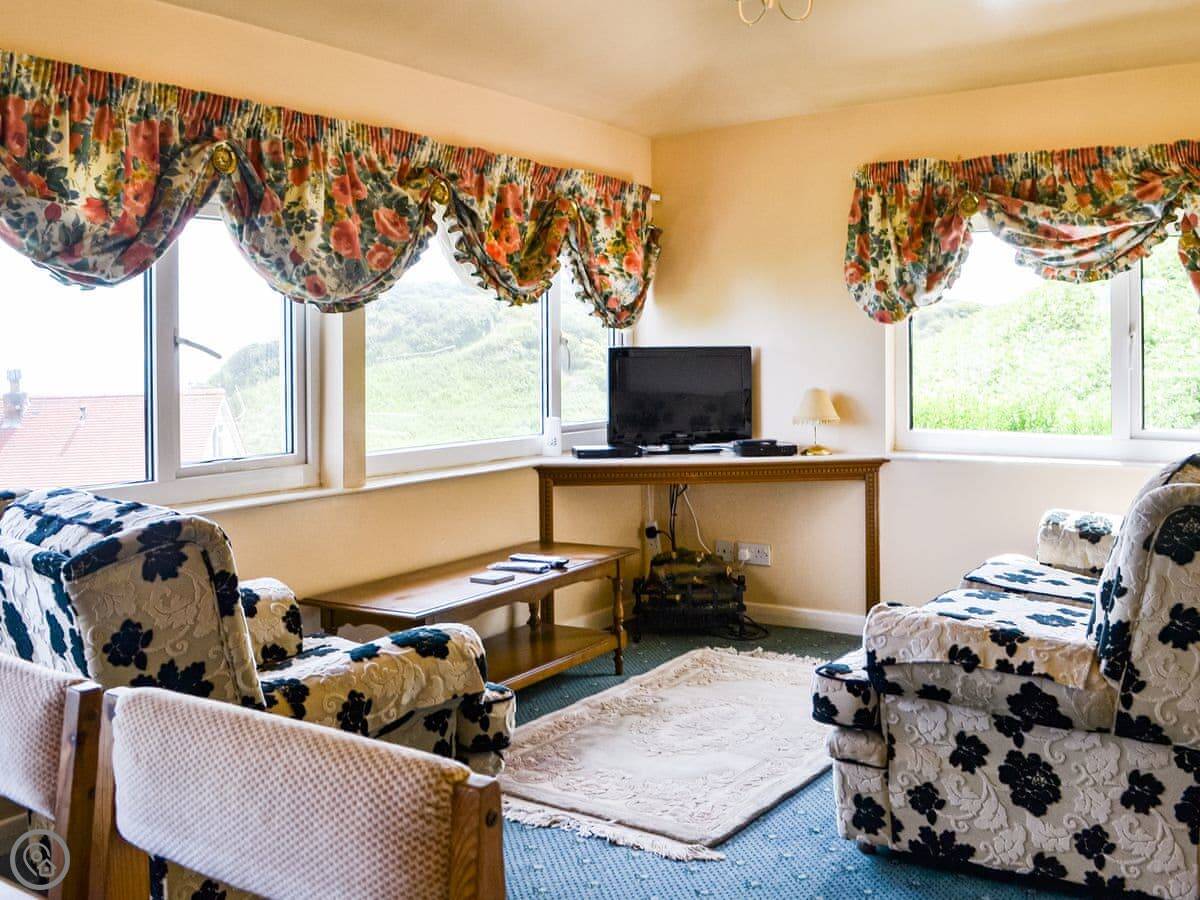 The living room is open plan. The kitchen is a galley style along one wall. The main thing is the view. The windows look straight out over Filey Bay. You can see the sea from the sofa. There's an electric stove that looks like a wood burner for cooler evenings.